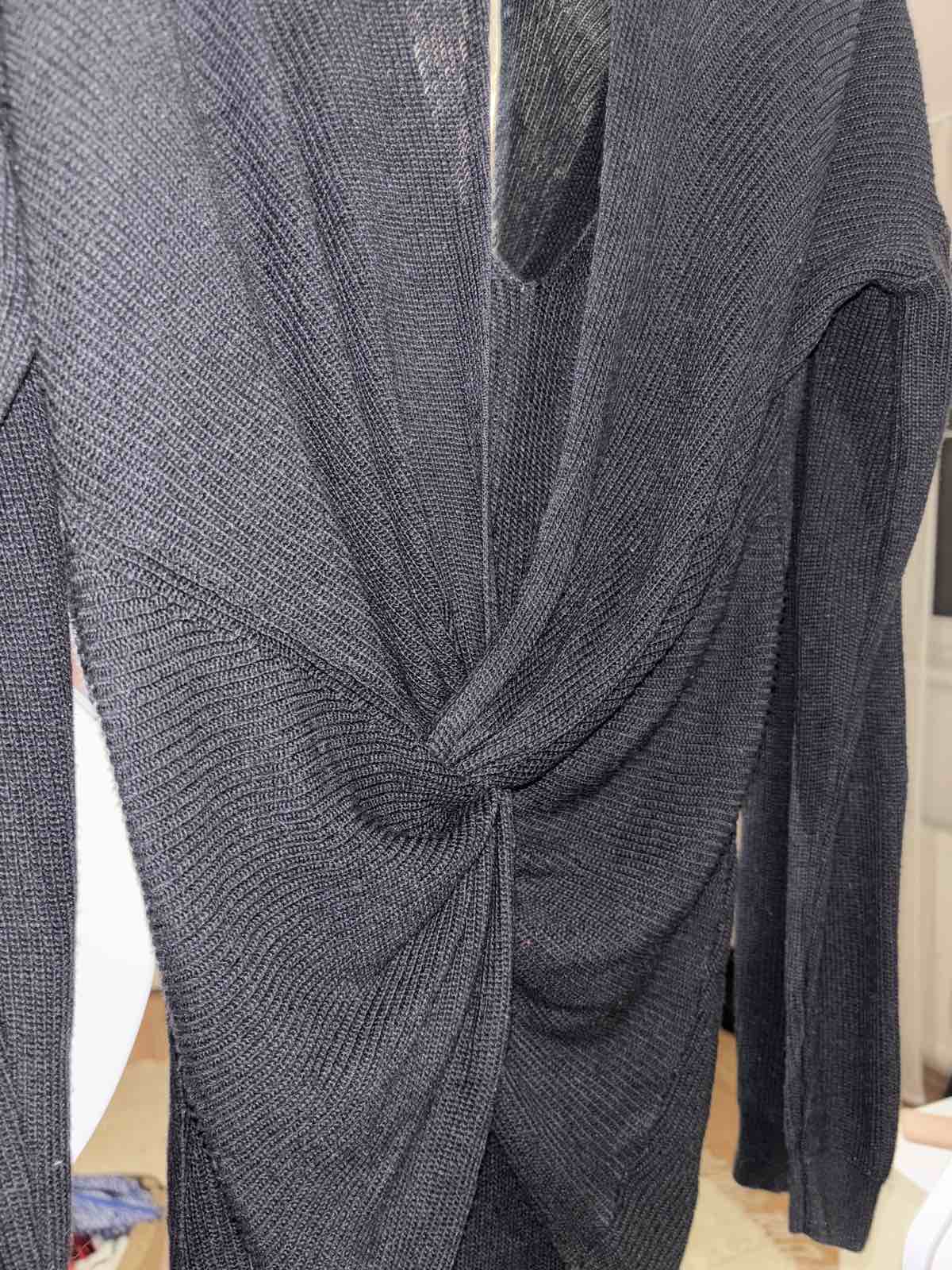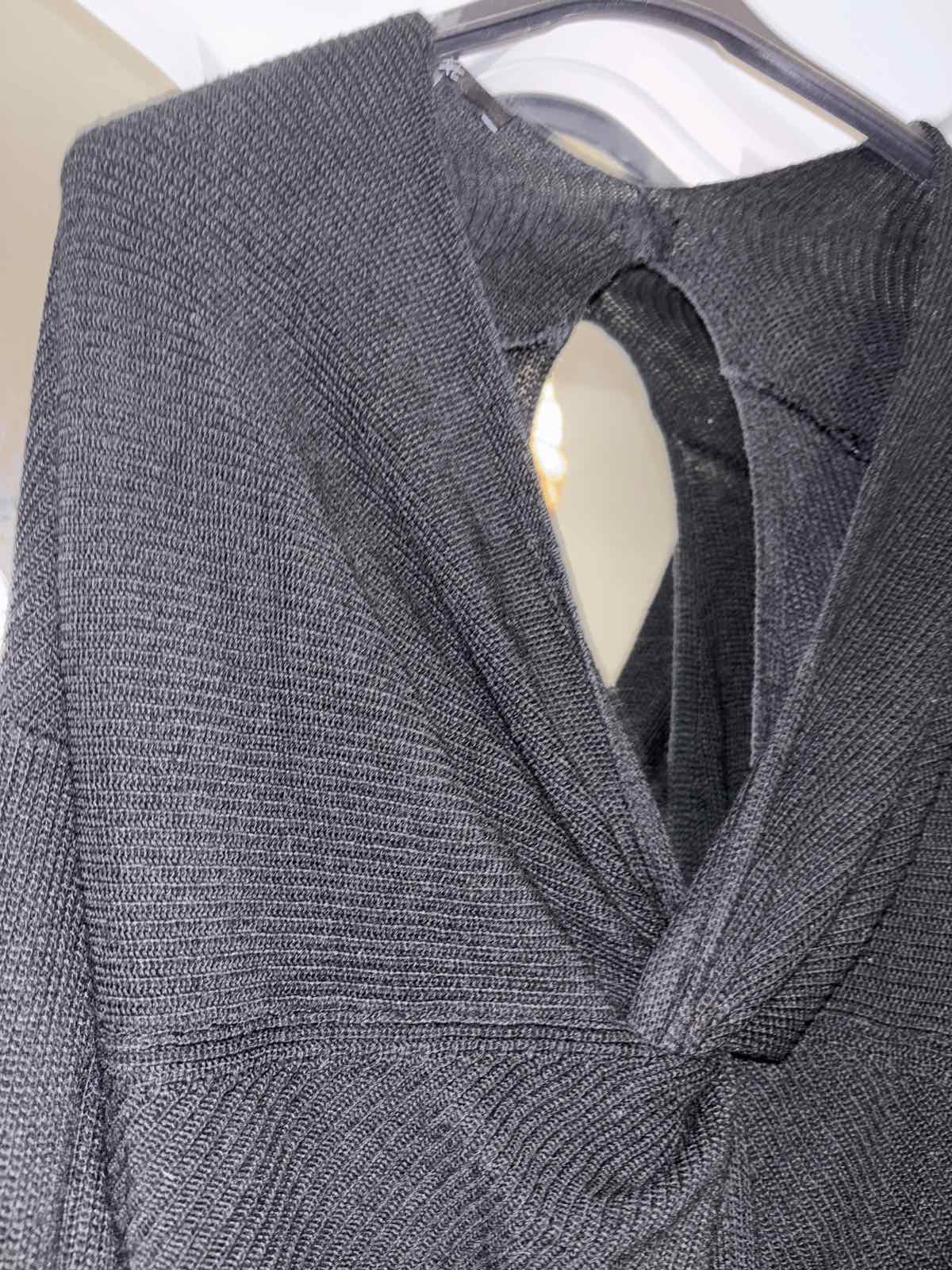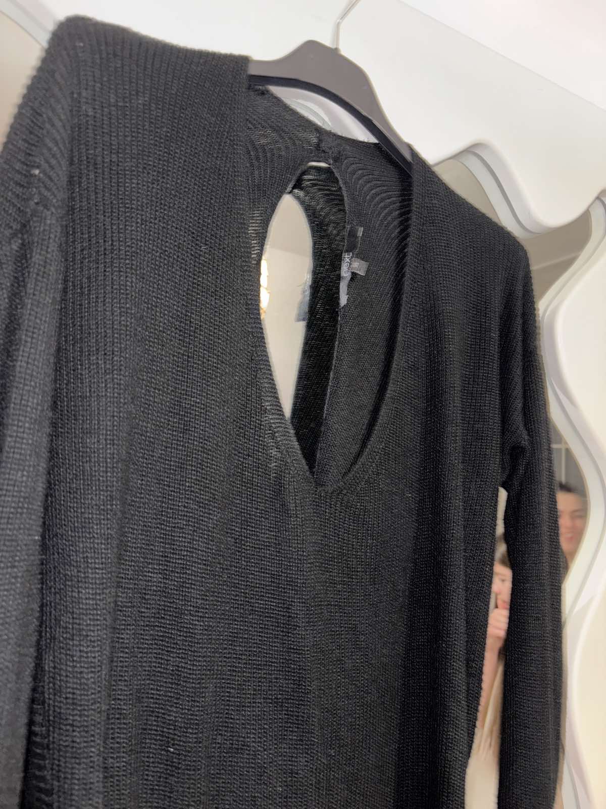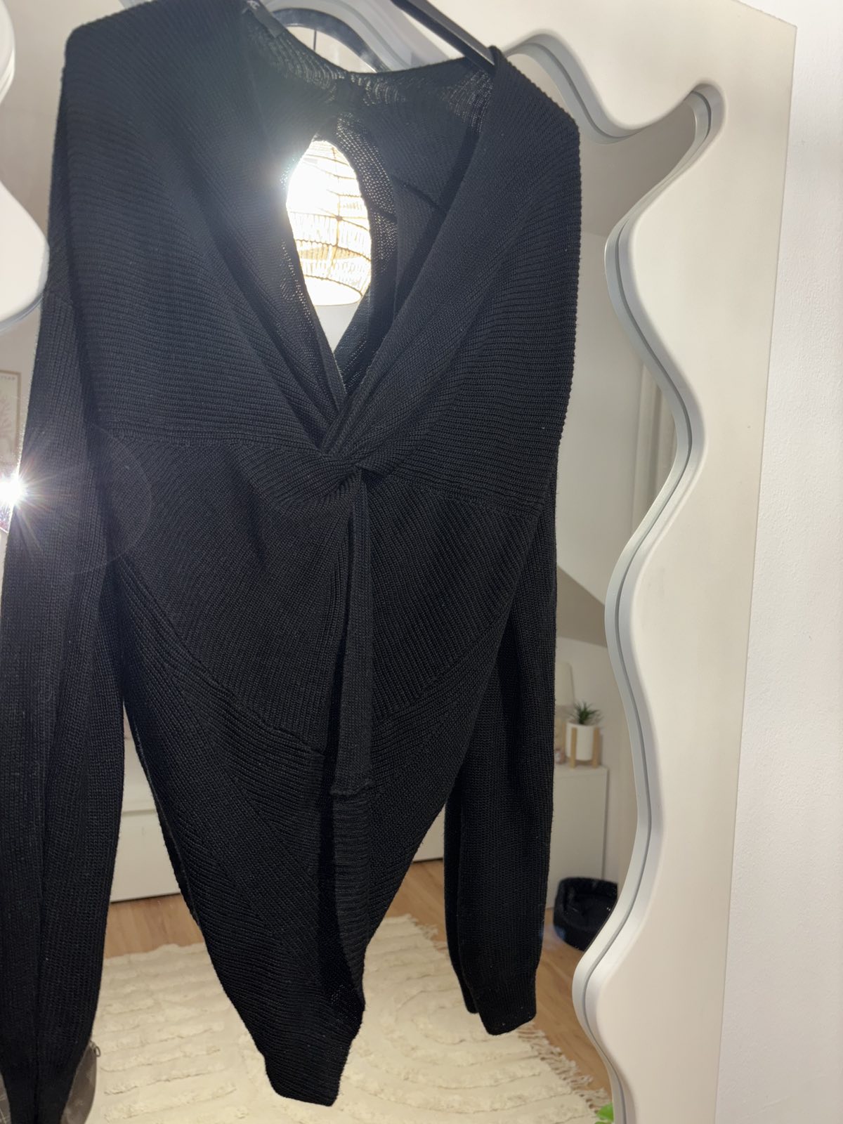 Výborný stav, čierny, pružný, výstrih vpredu aj vzadu, uzol vzadu, veľkosť XS, skôr S, s.pod pazuchami cca 50 cm, d. 73 cm