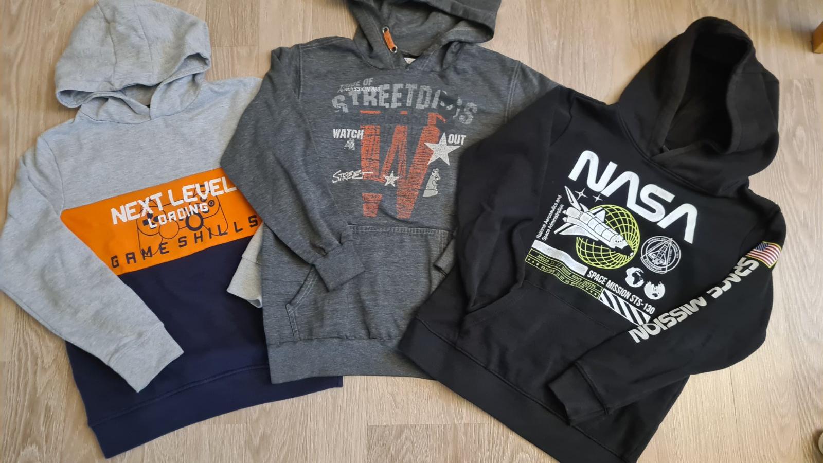 Mikina všetky veľkosť 146/152 zn.KIK Sú bez poskodenia,bielo cierna je ,len vyprata od novoty,tmavomodra parkrat oblecena a cierne a cierno-biele nosene,zachovale bez poskodenia.Nie su hrubé veľa,...