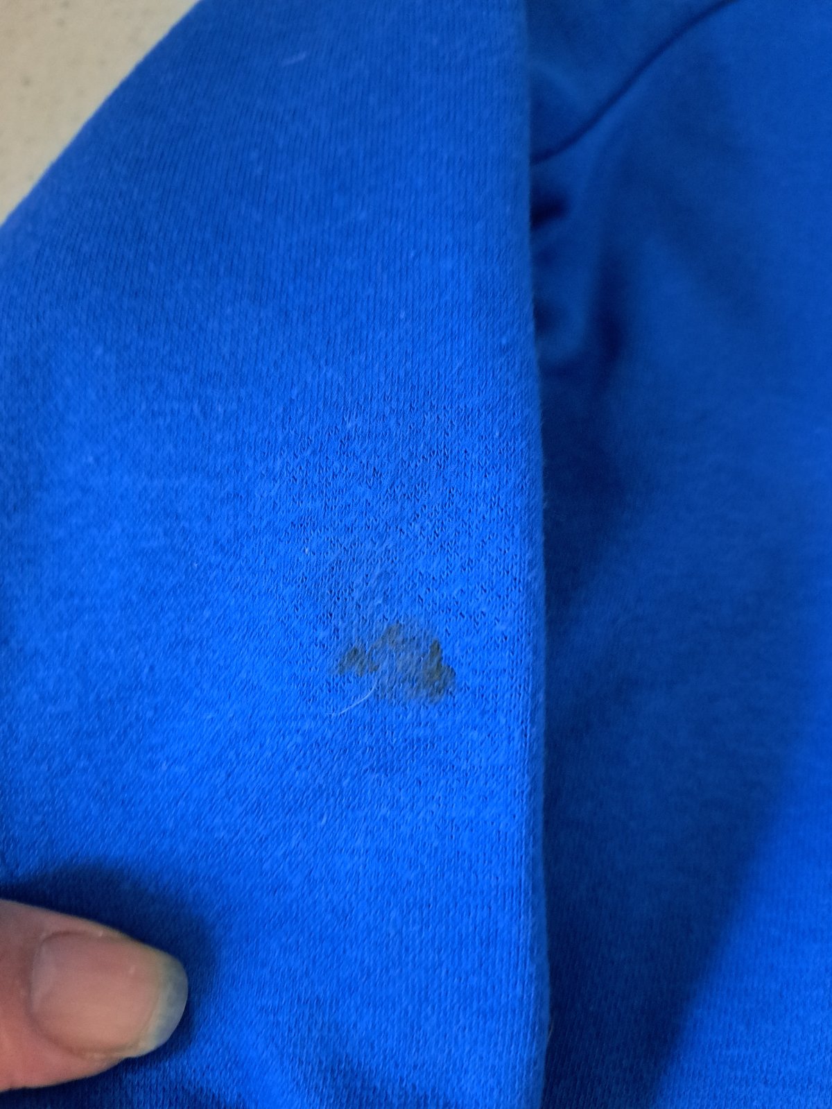 Na donosenie na rukáve je fľak, vpredu jemne fliaciky ktoré nie sú ale úplne hneď vidieť. Zmolky.