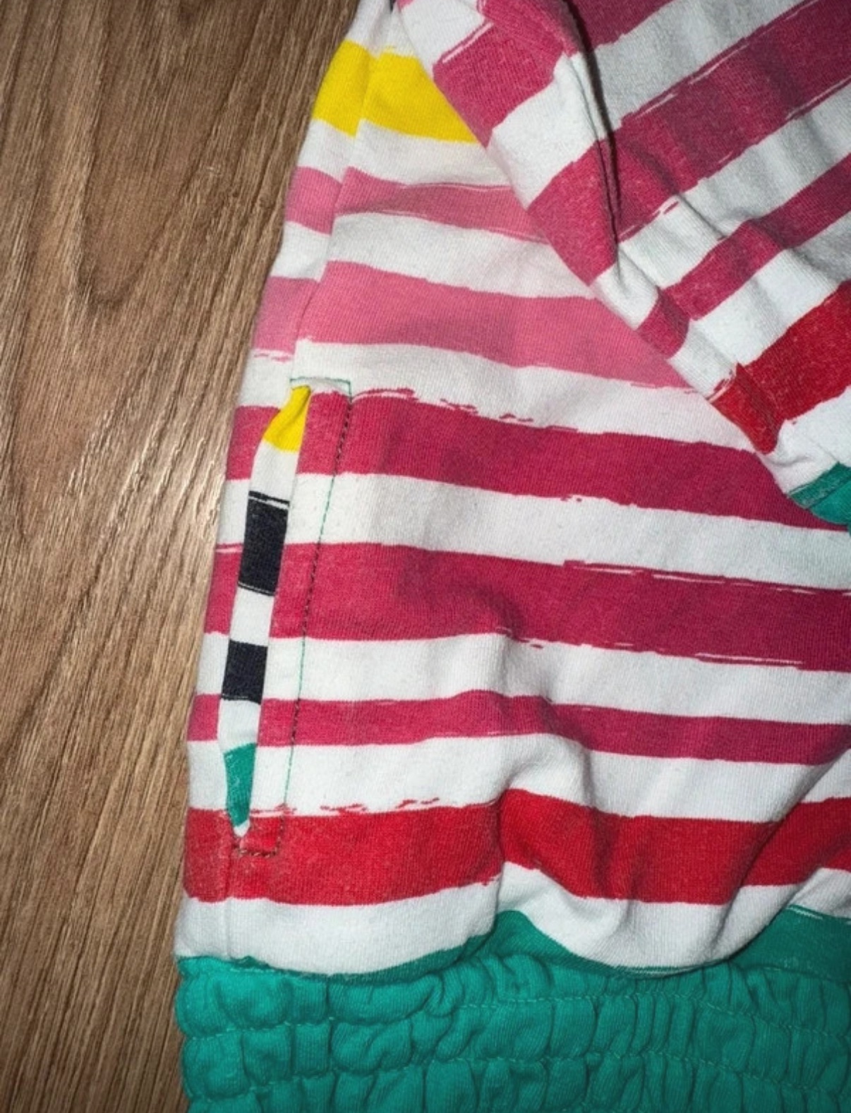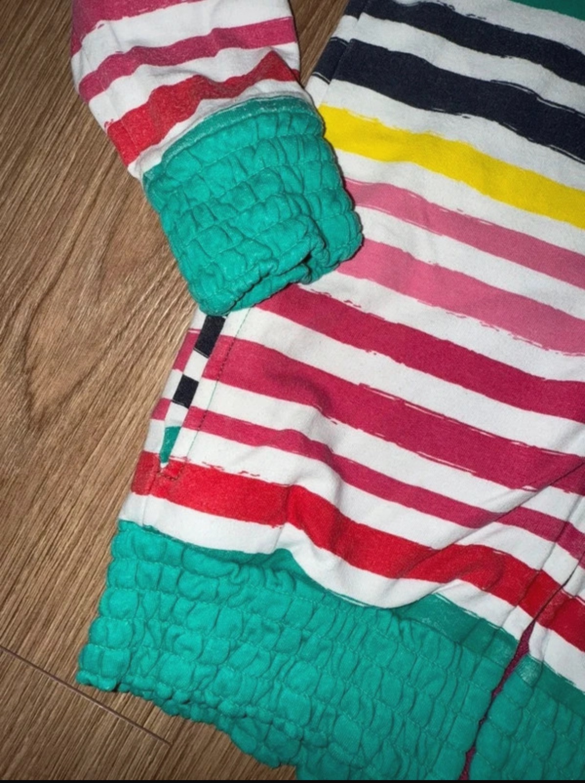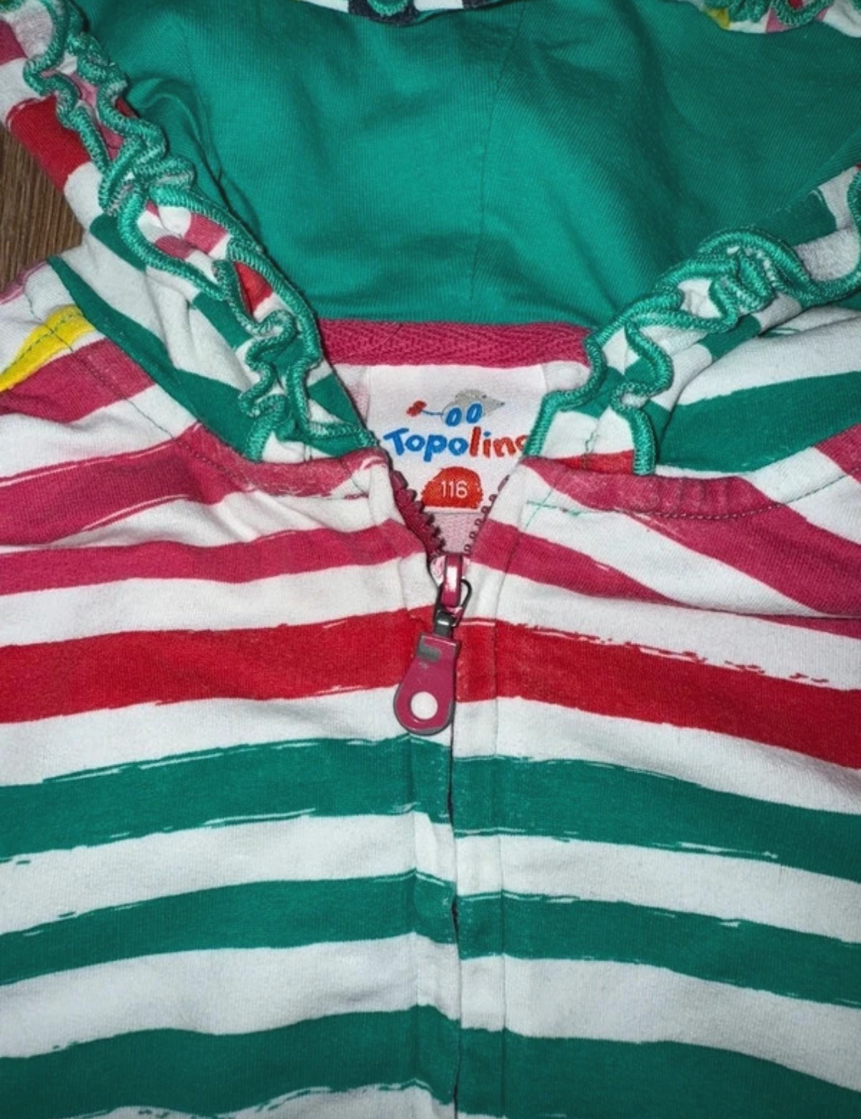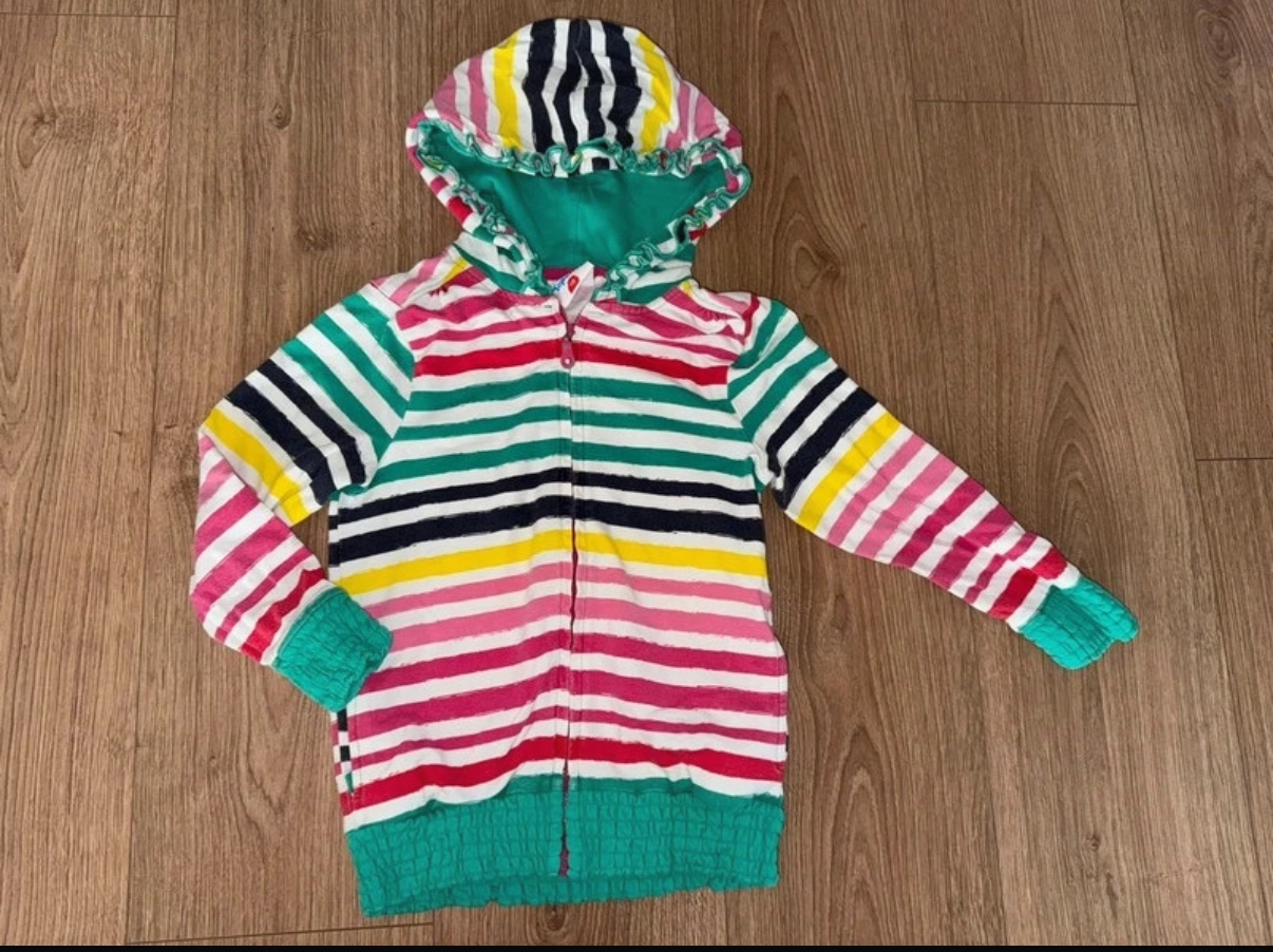 Milá dúhová mikina, tenšia, nosená, trosku bledsia farba sem tam, ale stále pekná, na ihrisko urcite posluzi este , pre mna aj do skolky kludne