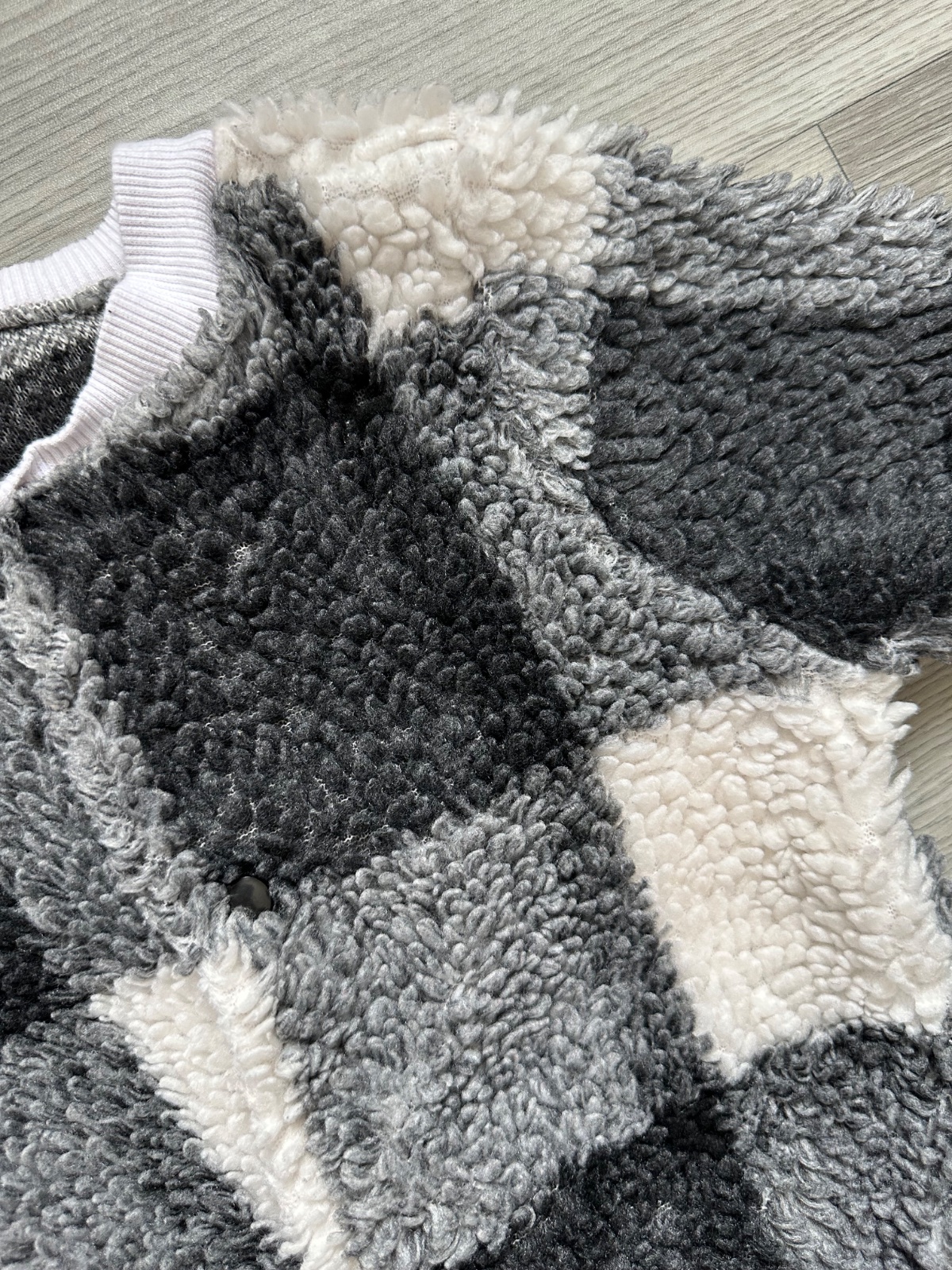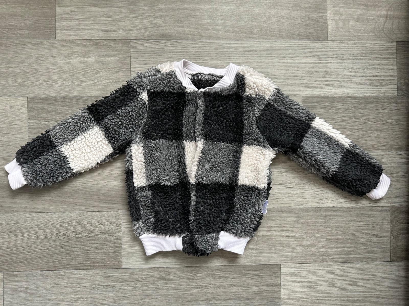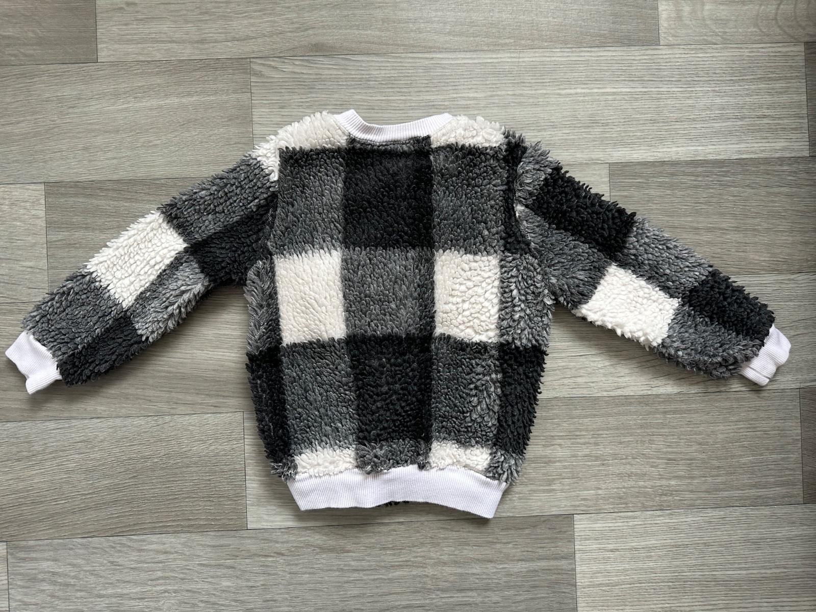 Ponúkam na predaj handmade mikinu so zapínaním na cvoky, chlpaty materiál, veľ. taká 98/104, na ramenach, kde je šitie, menší chľpok (vid foto).