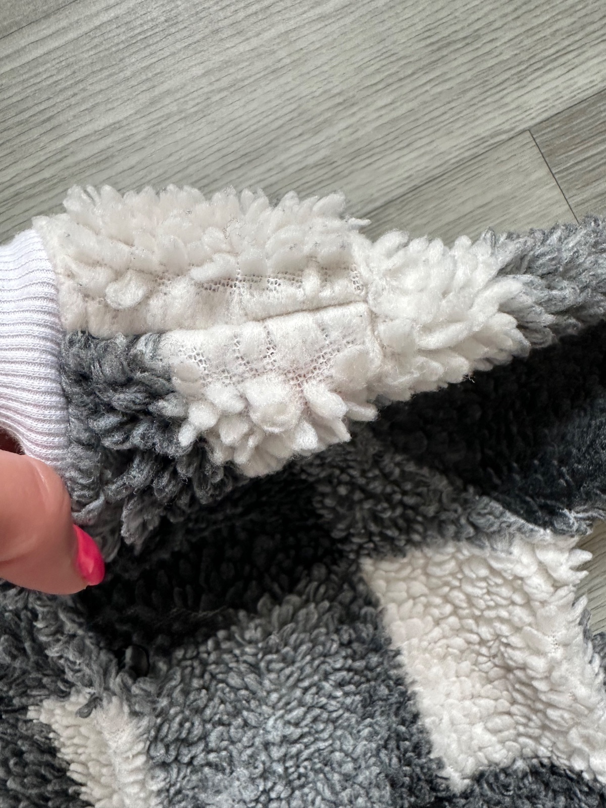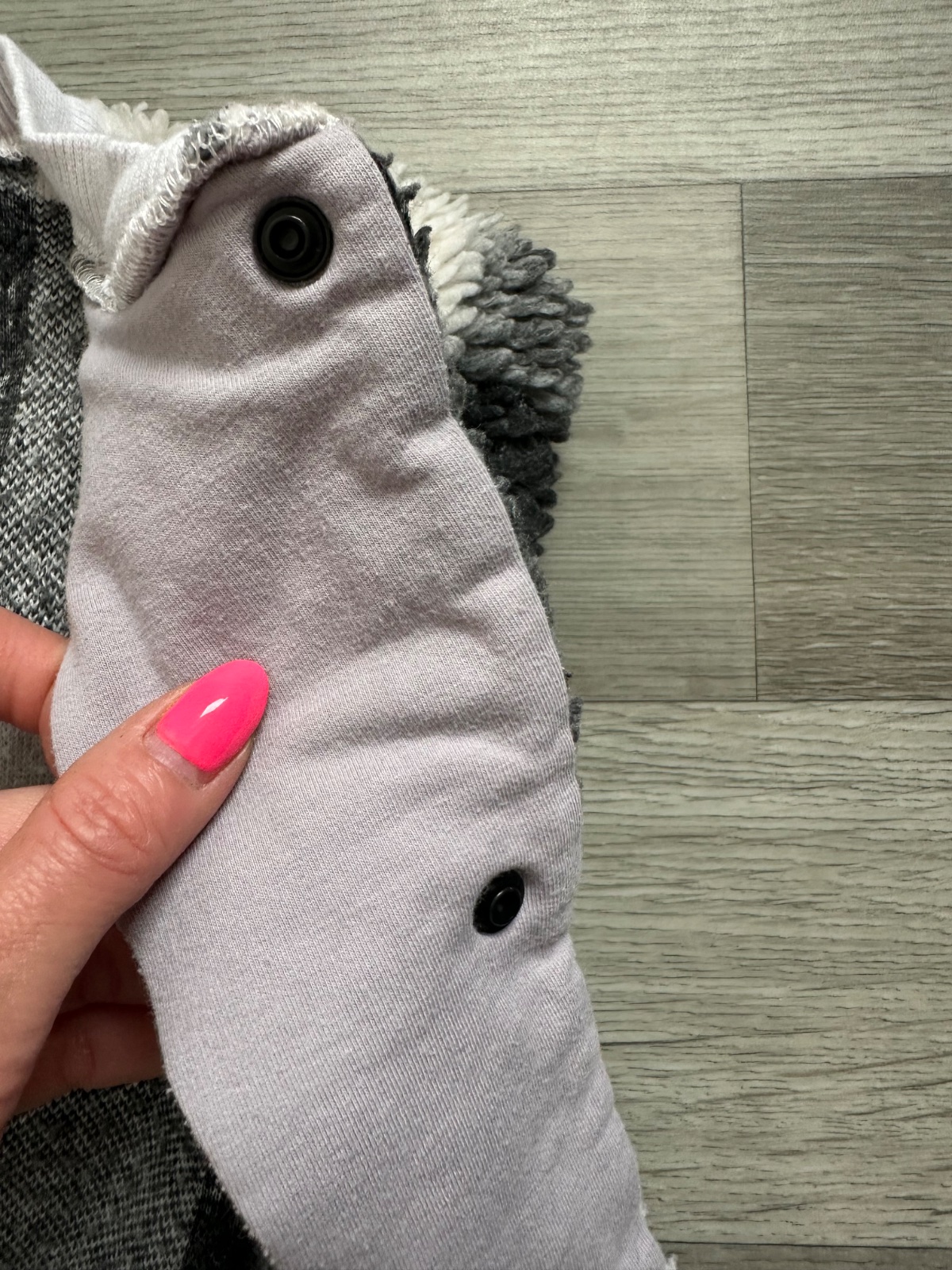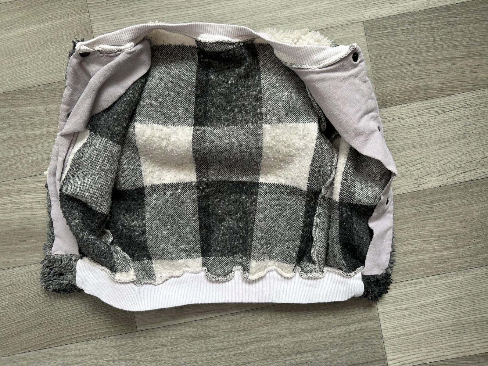 Ponúkam na predaj handmade mikinu so zapínaním na cvoky, chlpaty materiál, veľ. taká 98/104, na ramenach, kde je šitie, menší chľpok (vid foto).