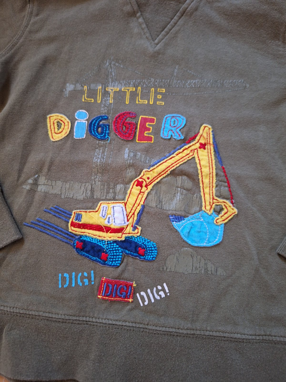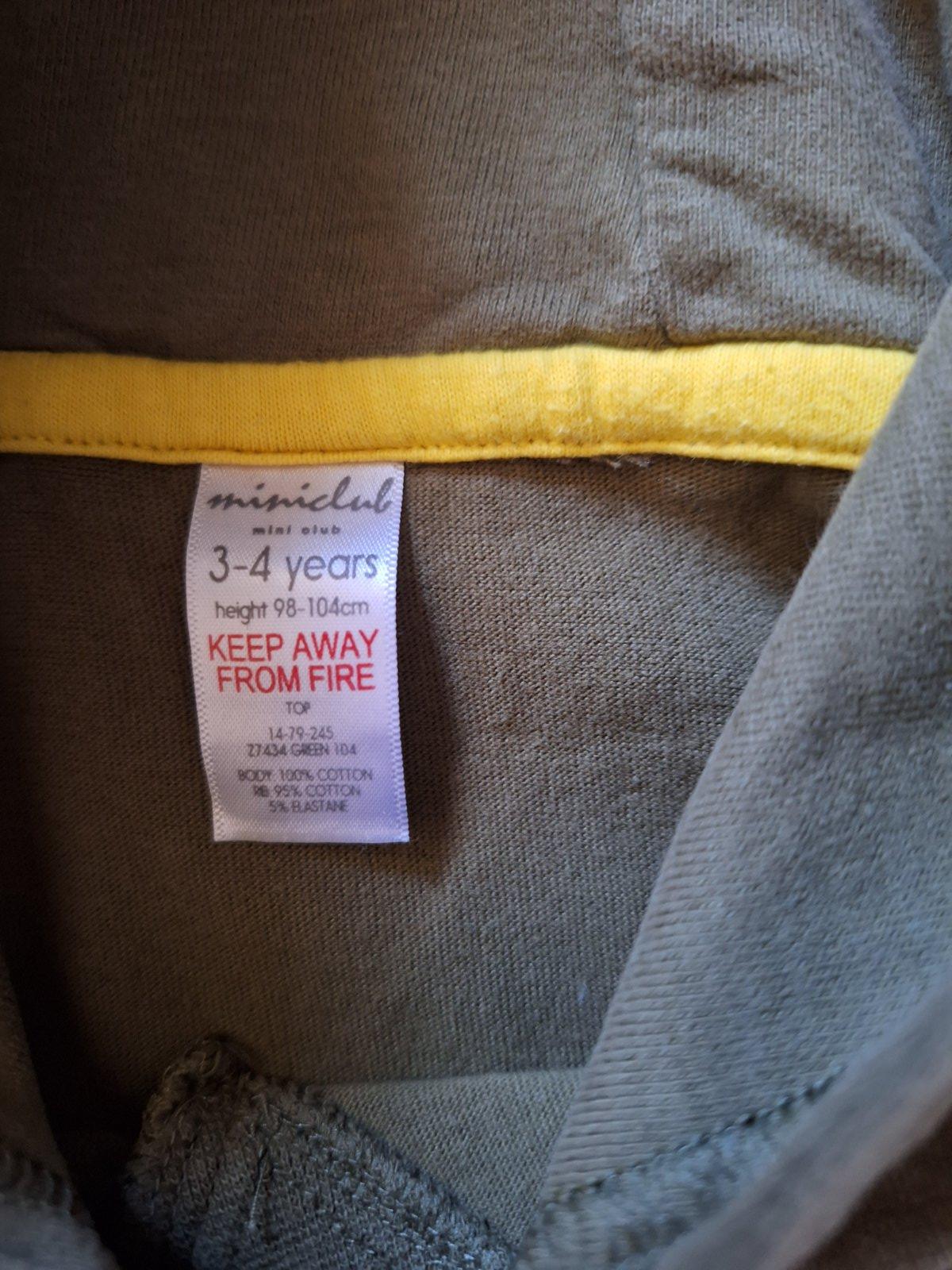 Tenká, v peknom nosenom stave, bez žmolkov, popukaná potlač (splýva okolo našitého výrazného bagra, takže to ani nevidno). Uvedená veľkosť 104, reálne sedí na 92.