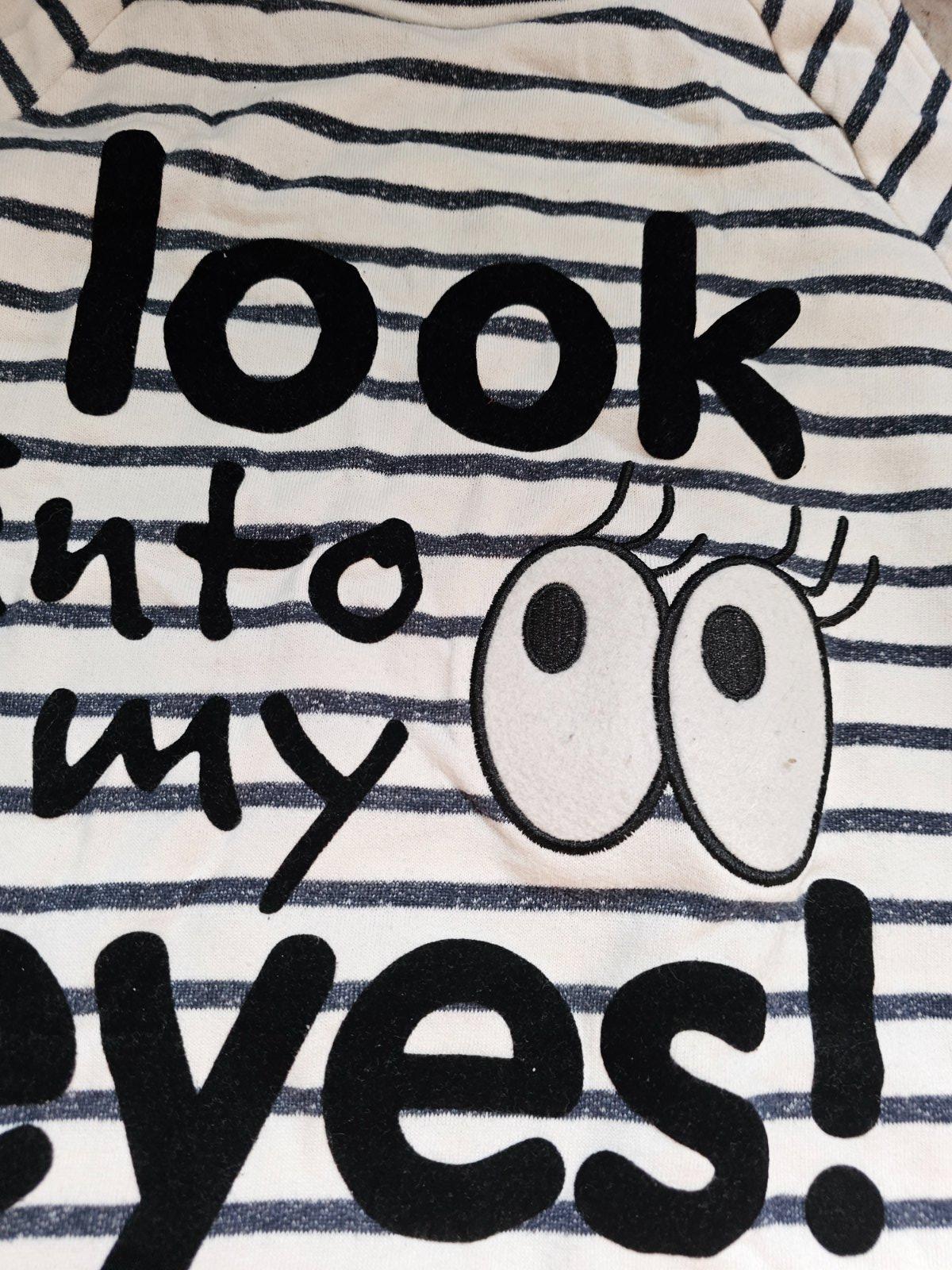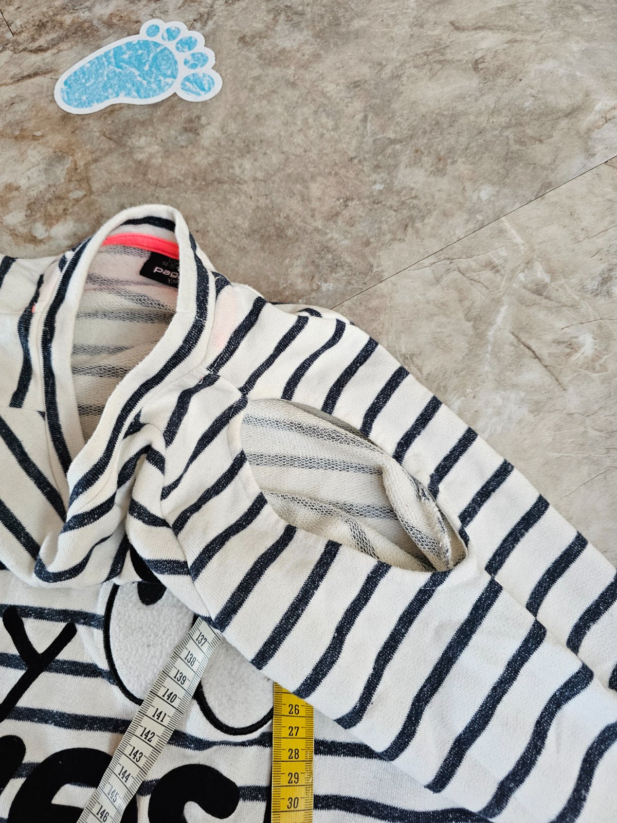 Bielo-modro pasikava mikina, vidiet zmolky. Zaujimavo riesene ramena. Dlzka 63cm, sirka 46cm.