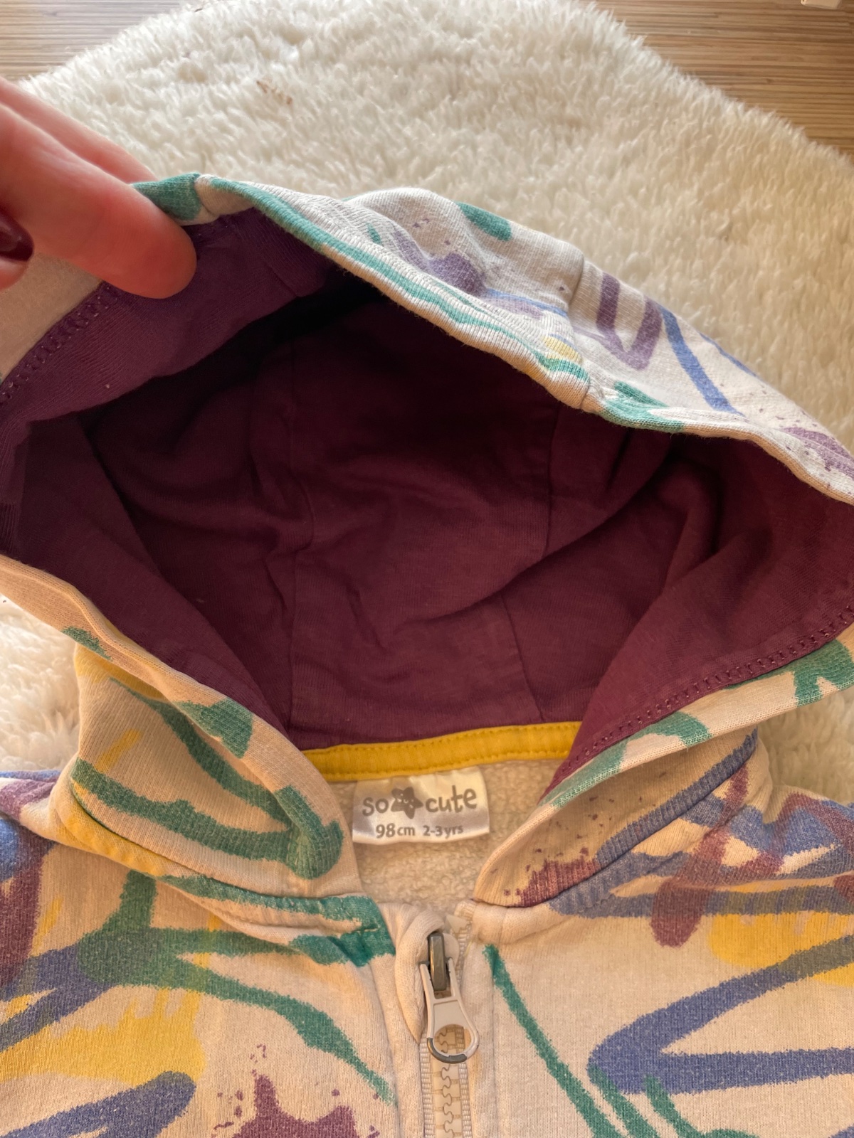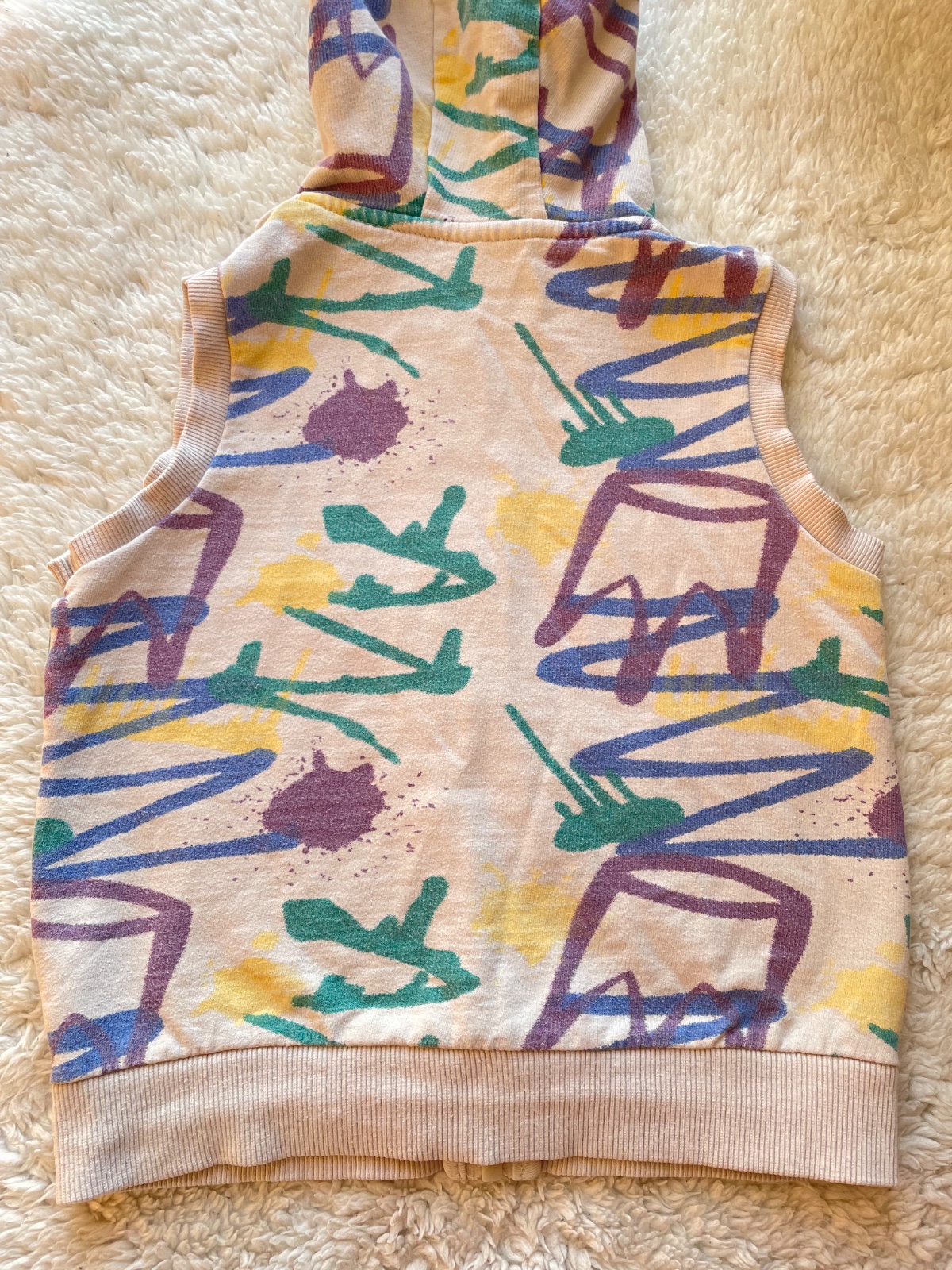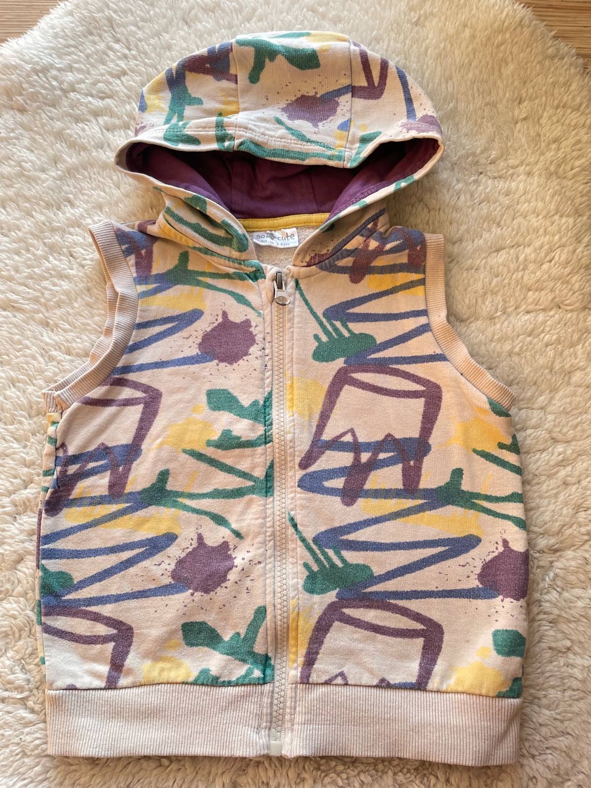 Kremova vesta s farebnou potlacou na zips a s kapucnou, bez dier, farby vyprate, bezec odrety. Kombinovatelny kusok. Velkost 98