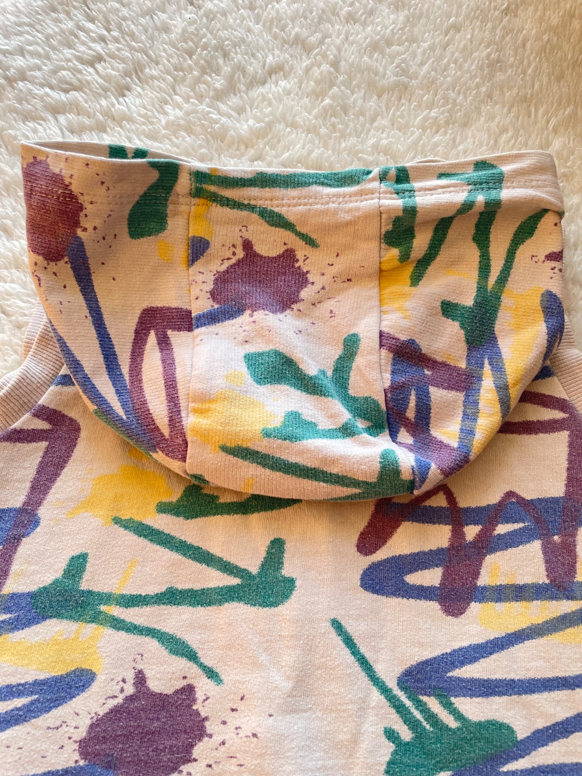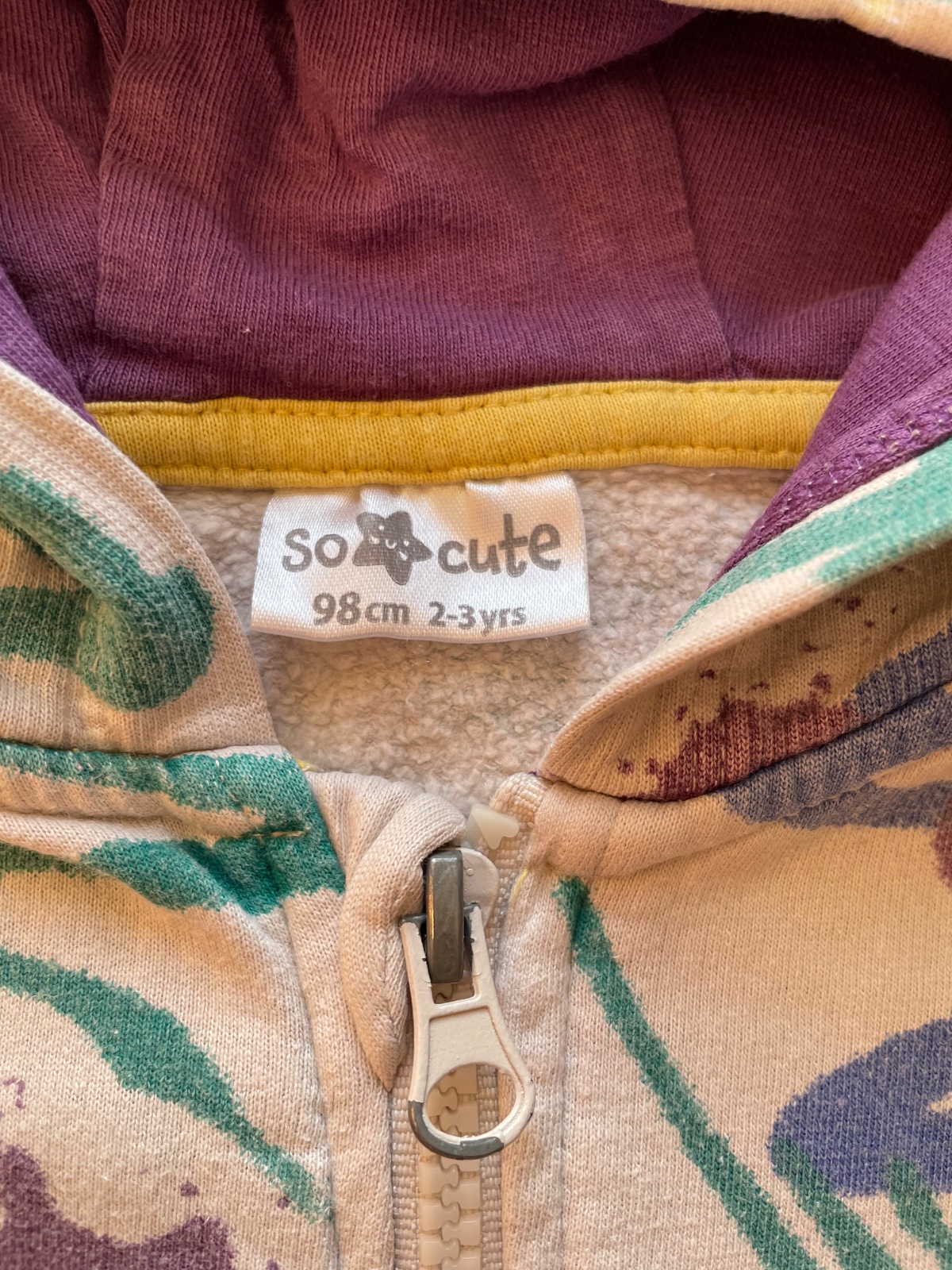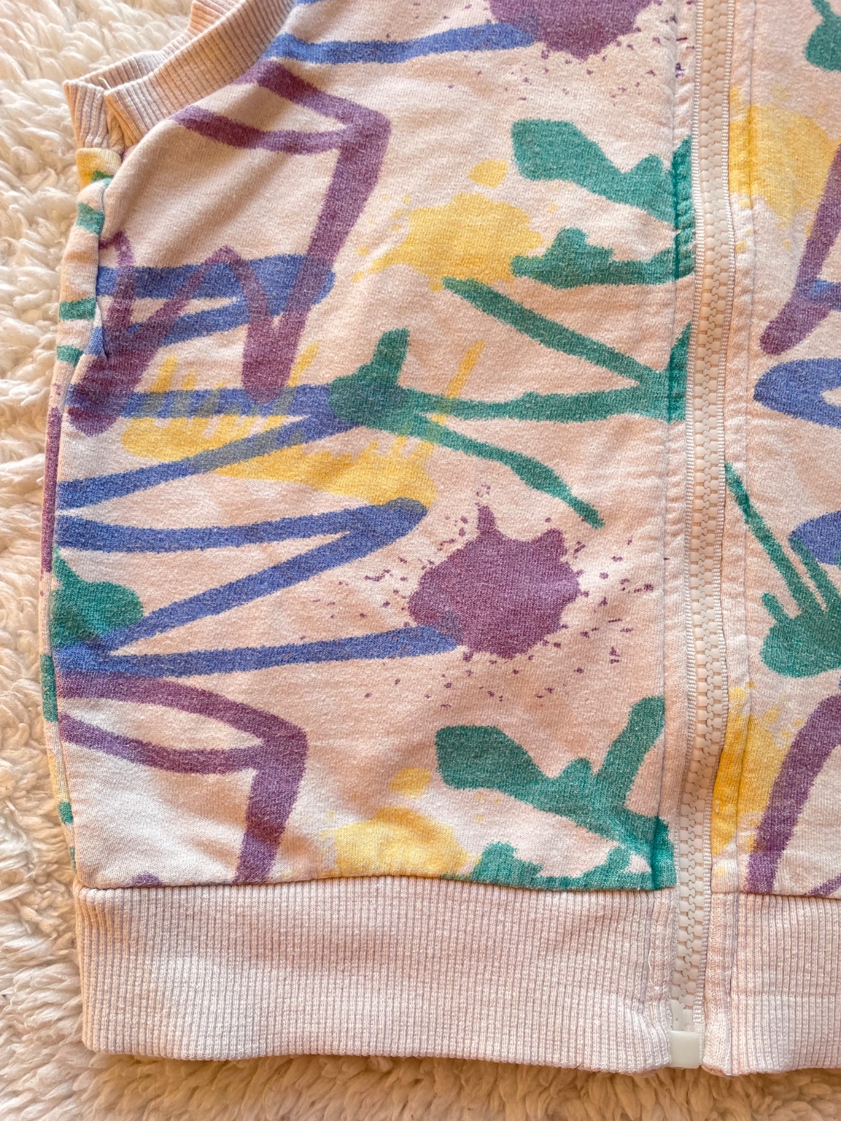 Kremova vesta s farebnou potlacou na zips a s kapucnou, bez dier, farby vyprate, bezec odrety. Kombinovatelny kusok. Velkost 98