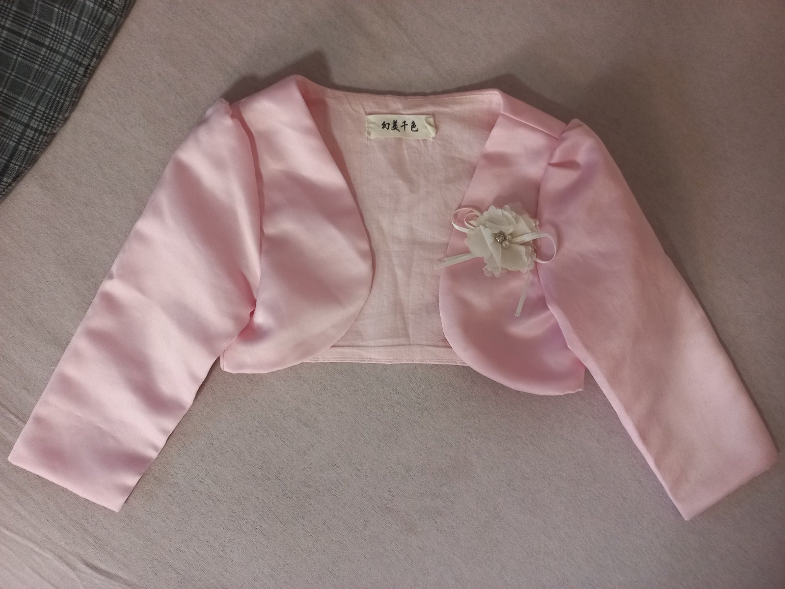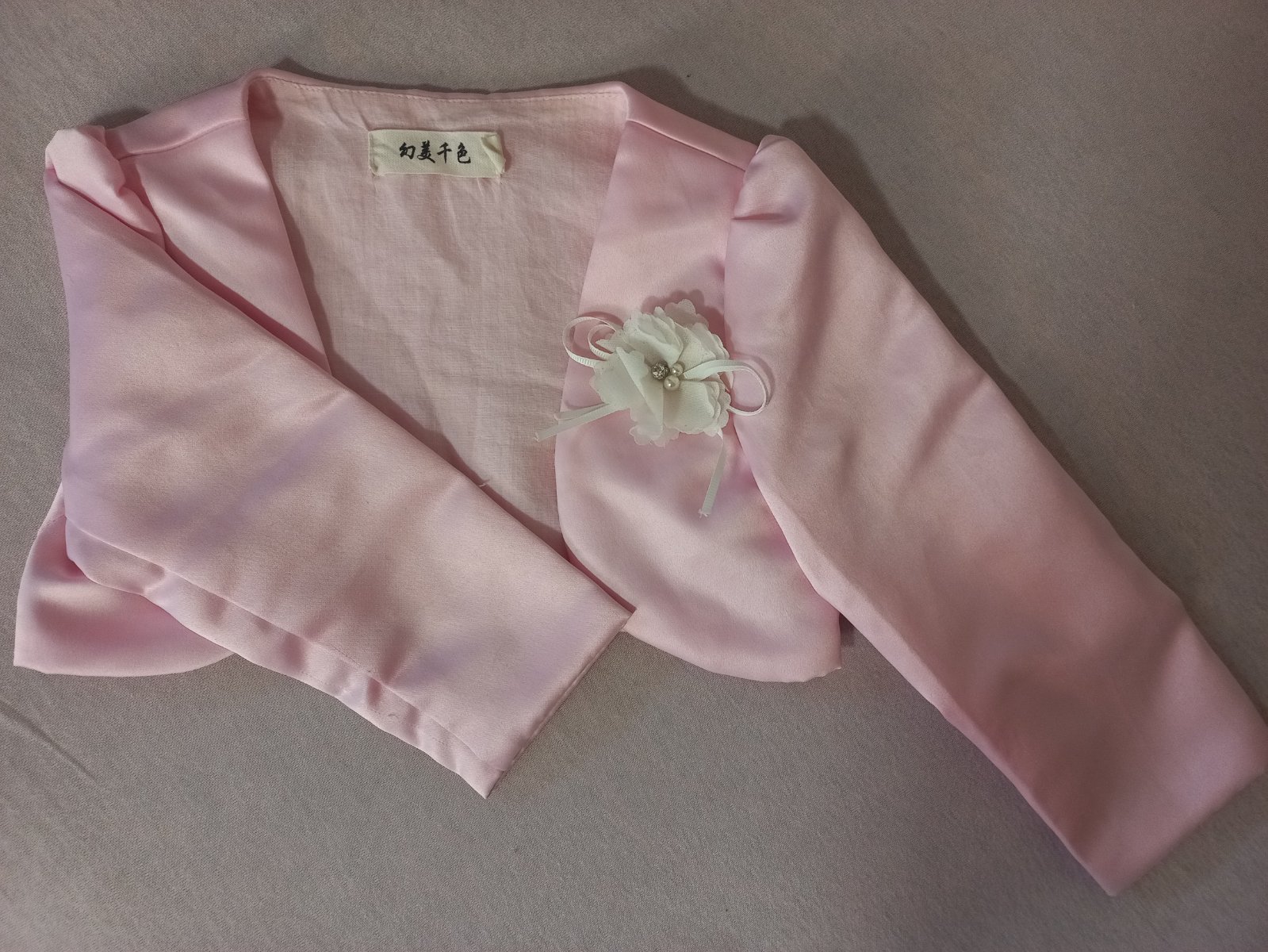 Predám elegantné saténové bolerko odhadom pre 4-5 ročnú slečnu. Dĺžka 20 cm, šírka 31 cm a dĺžka rukávov 31 cm.