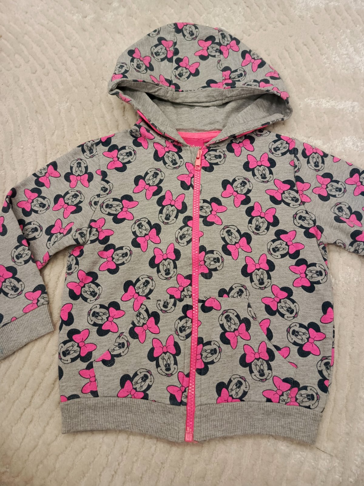 Mikinka s Minnie s kapucňu v dobrom stave bez poškodenia, veľkosť 4 roky, zapínanie na zips, vpredu vrecká, predná modrá látka je riflovina, sivá je hrubšia teplákovina, ROZMERY: dĺžka-39cm, šírka...