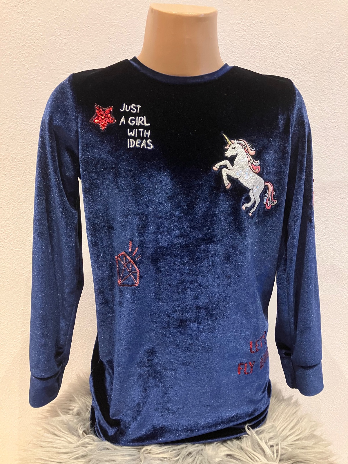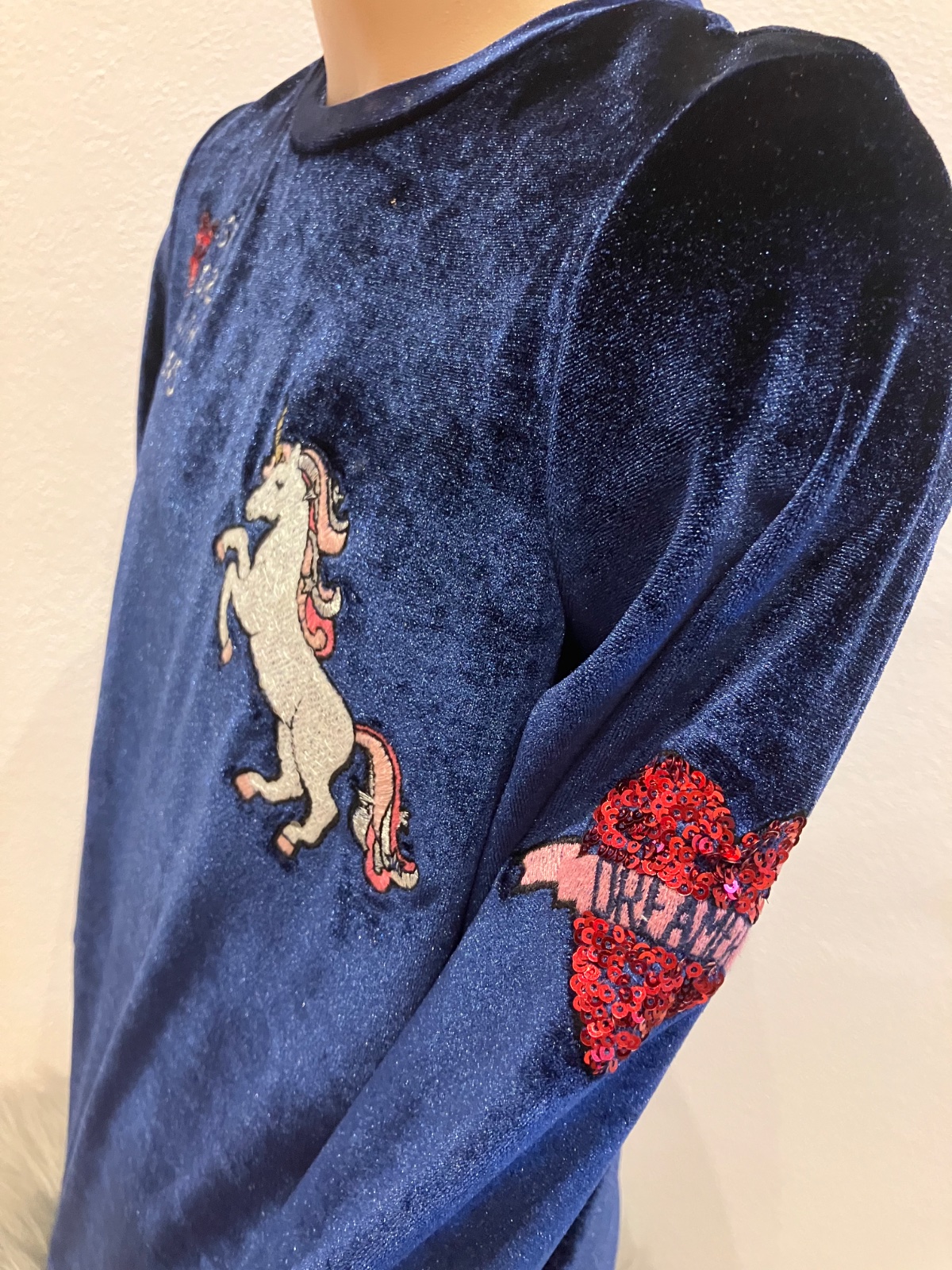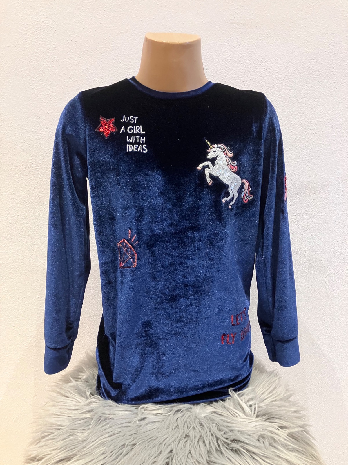 Dievčenská predĺžená zamatová mikina s flitrami, elastická, okrúhly výstrih, materiál 89%polyester 11%elastan.