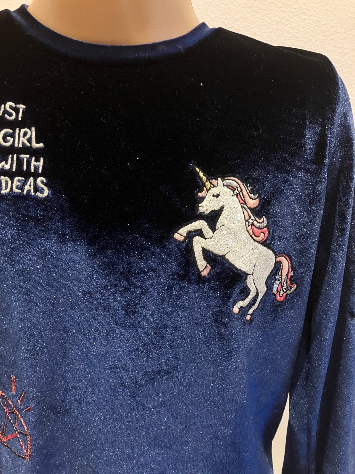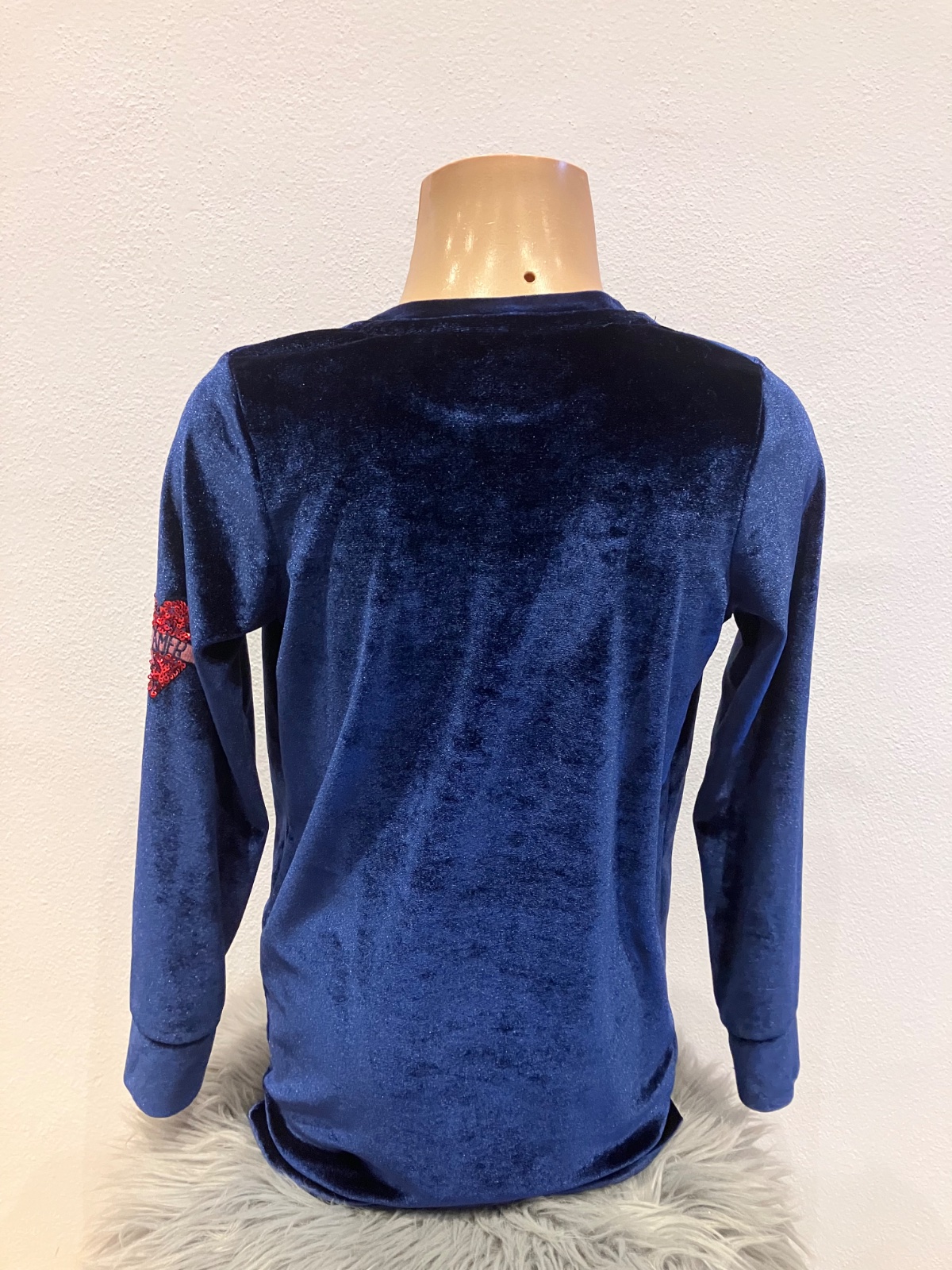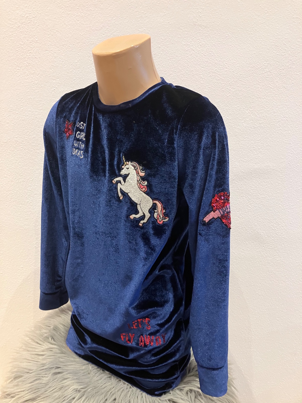 Dievčenská predĺžená zamatová mikina s flitrami, elastická, okrúhly výstrih, materiál 89%polyester 11%elastan.