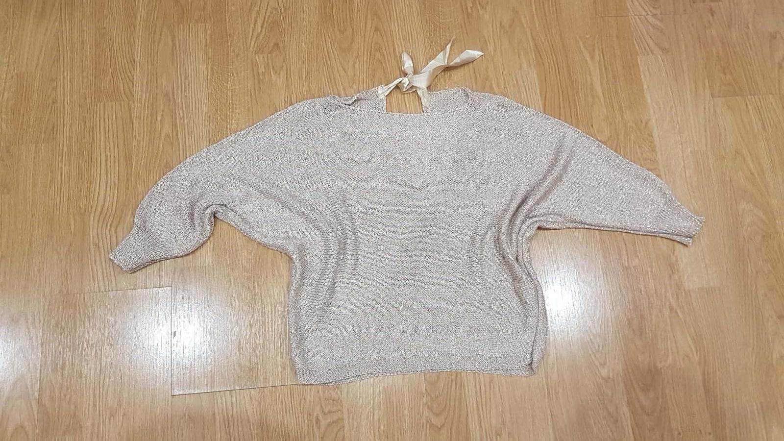 je ako nový, šírka spodného lemu je 44 x 2 cm, natiahne sa do 54 x 2 cm. Materiál je 75 % viskóza, 25 % polyester s lurexom. V zadu na hore viaže mašľa - pekne to vypadá.