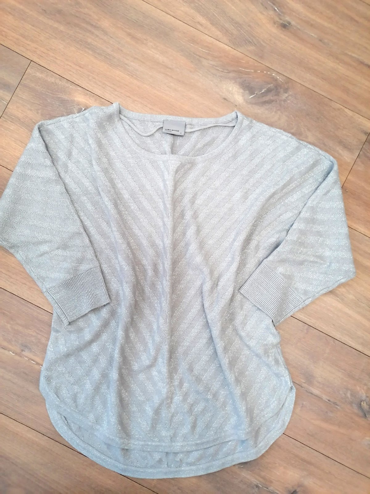Veľmi pekny sveter voľnejšieho strihu, vpredu kratší, vzadu trochu dlhší. Rukávy sú 3/4. Je bledosivej farby so striebornou nitkou, takže sa jemne ligoce. Mnou nenoseny, top stav. Dlzka predná 60 cm, zadná 65 cm, šírka v prsiach 50 cm.