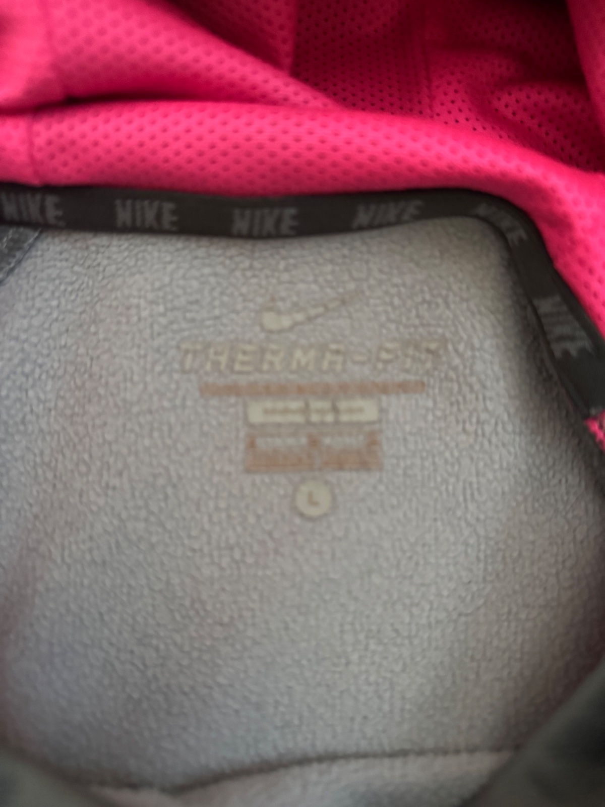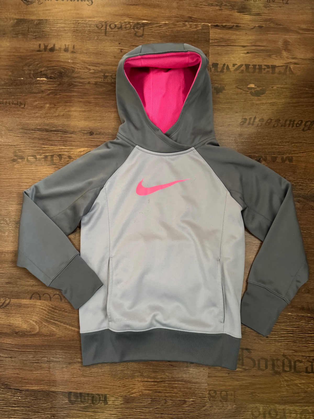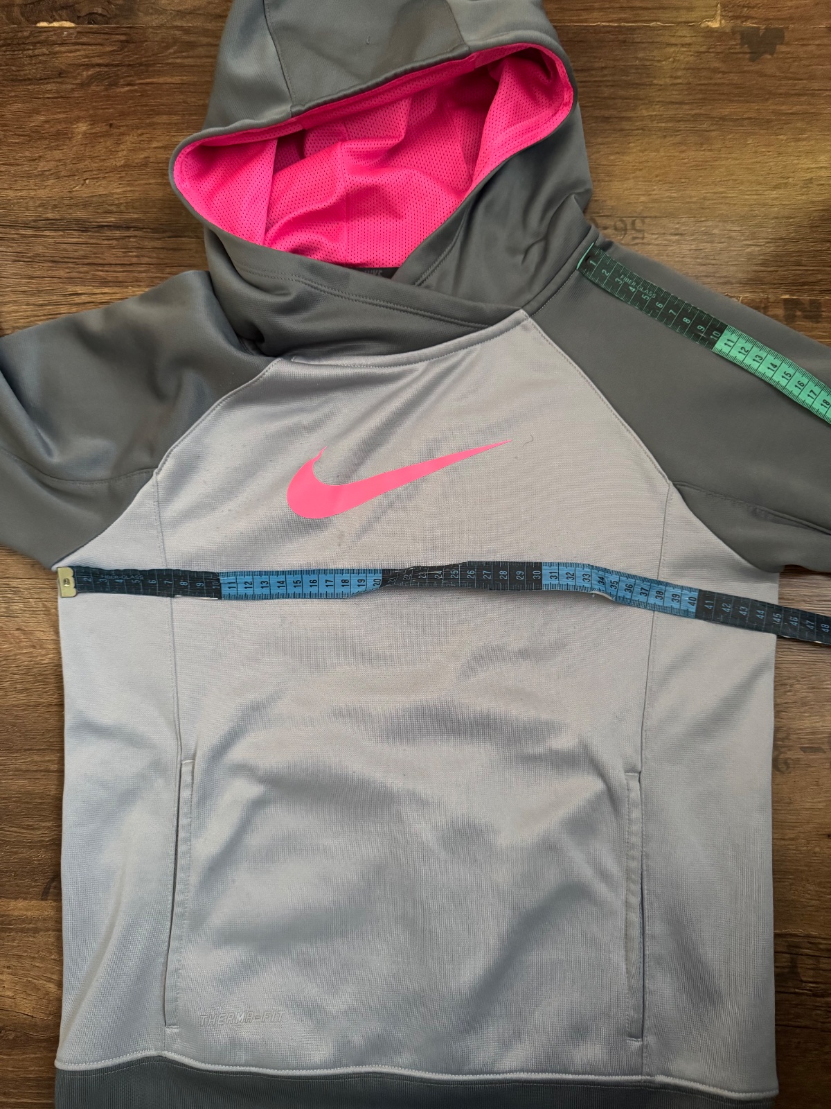 Ponúkam peknú mikinu s kapucňou originál značky Nike. Farba je taká sivostrieborná s tmavosivou a s ružovou. Veľkosť je uvedená detská L na 12-13 rokov, na 146-156 cm, no prikladám aj rozmery. Bola nosená, bežné známky, stav. viď. foto, vpredu jemné fliačky, no naďalej v peknom stave. Je teplučká Therma-fit. Poštovné podľa taríf.