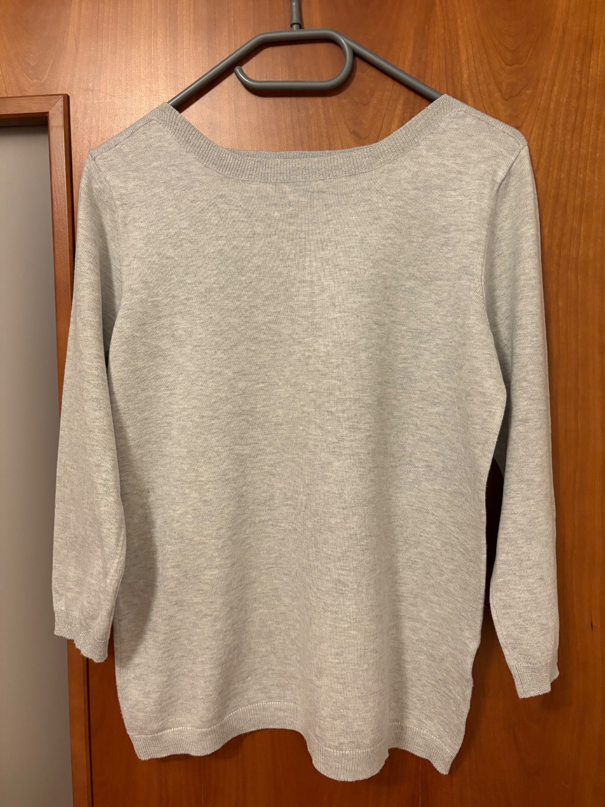 Světle šedý melírovaný svetřík, lemy rukávů a u krku prošité lesklou nití, příjemný, rukávy 3/4 délky.
