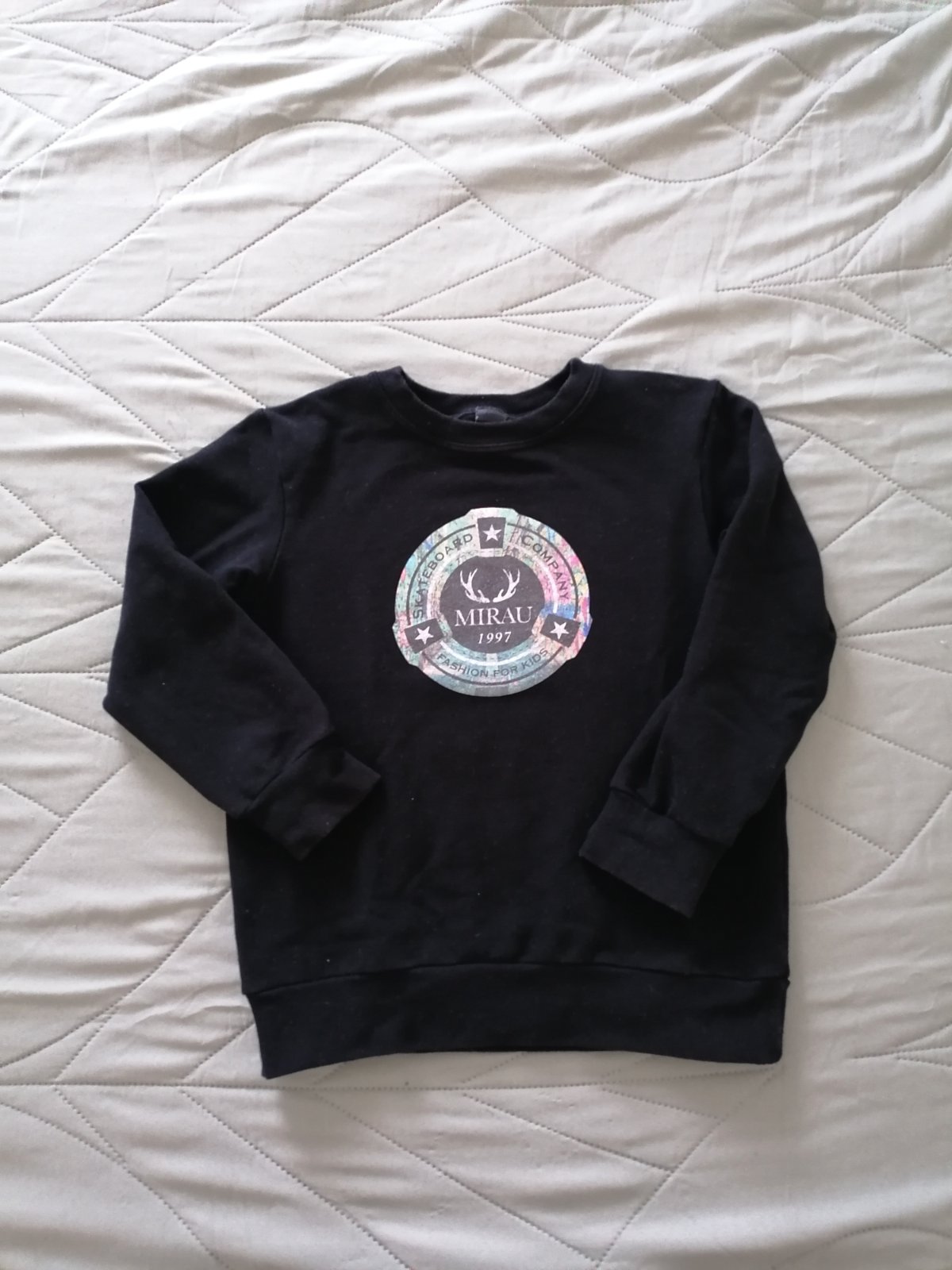 Krásna mikina, môj ju nosil 2 sezóny. Veľkosť 116,ale štítok je odstrihnuty, treba sa riadiť mierami (dĺžka cca 44,5-45 cm),takze sadne aj ako 110. Stav pekný, jedine na farbe (aj napise) vidno už pranie, cena je tomu prispôsobená.