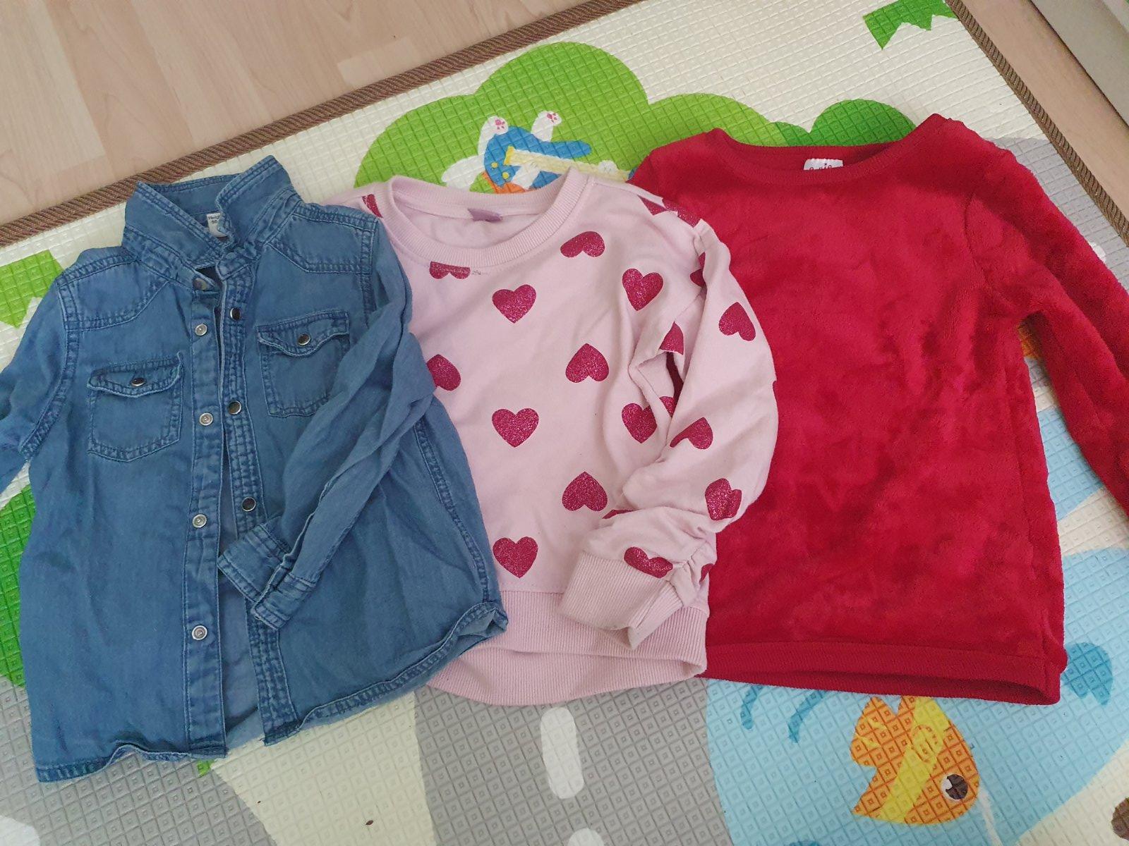 Dve mikinky, cervena top stav, so srdiečkami na donosenie aj ked nemá vážnejšie poškodenia, košeľa dobrý stav cena spolu