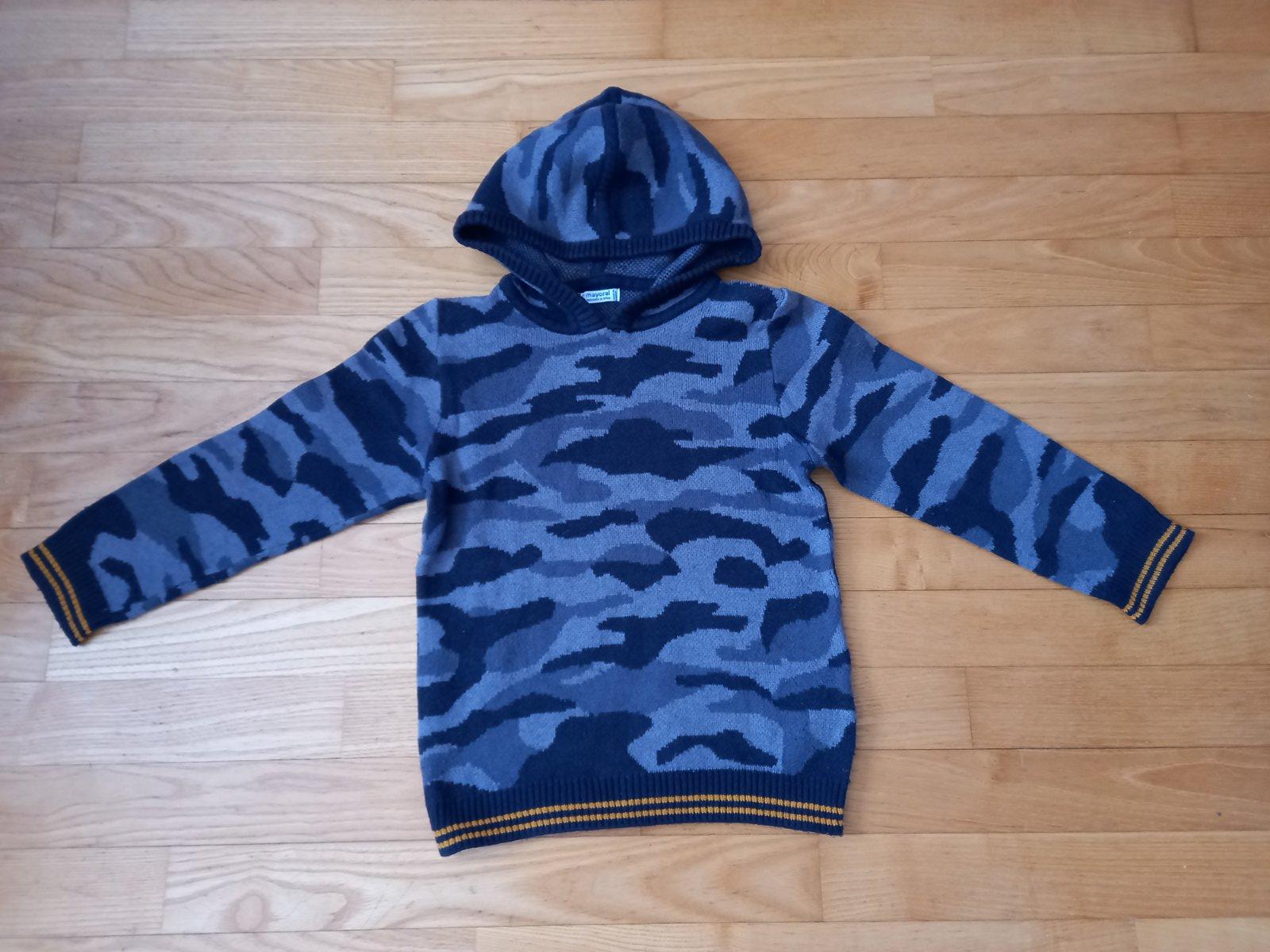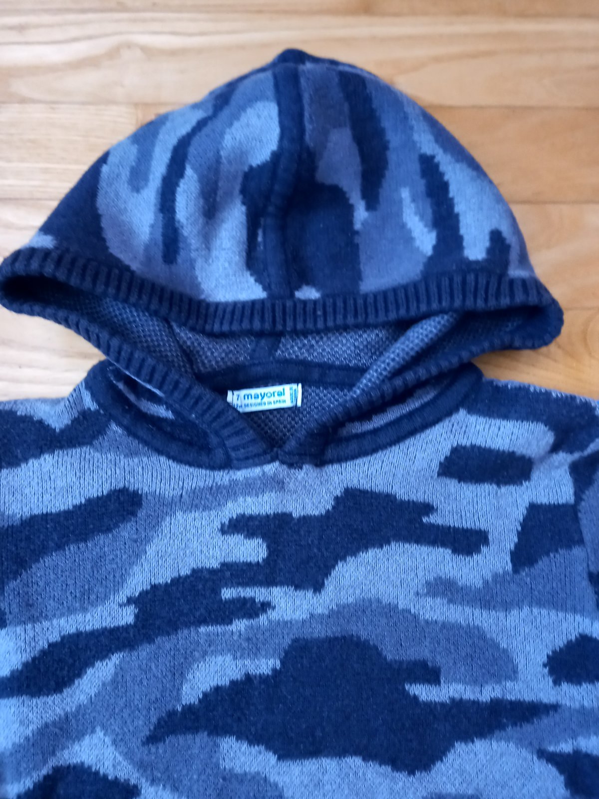 Maskáčový pulovrík s kapucou, príjemný na nosenie, dobrý nosený stav, veľ. Na 7.rokov/122cm. Rozmery: dľžka od krku je 40,5cm, šírka 36cm, dľžka rukávov od krku je 47cm, spod pazuchy 30cm