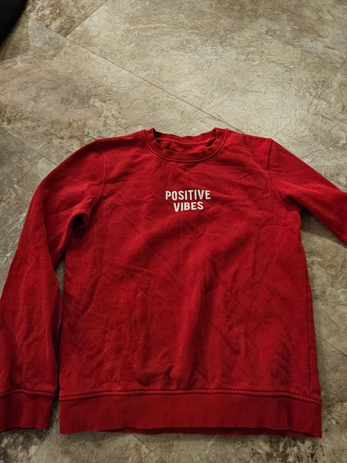 Mikina POSITIVE VIBES, unisex, dlzka 57cm, sirka 46,5cm. Mne sa zdá tá cervena farba mierne vyblednuta, nie uplne syta.