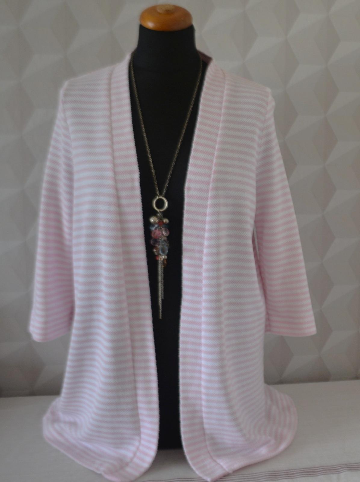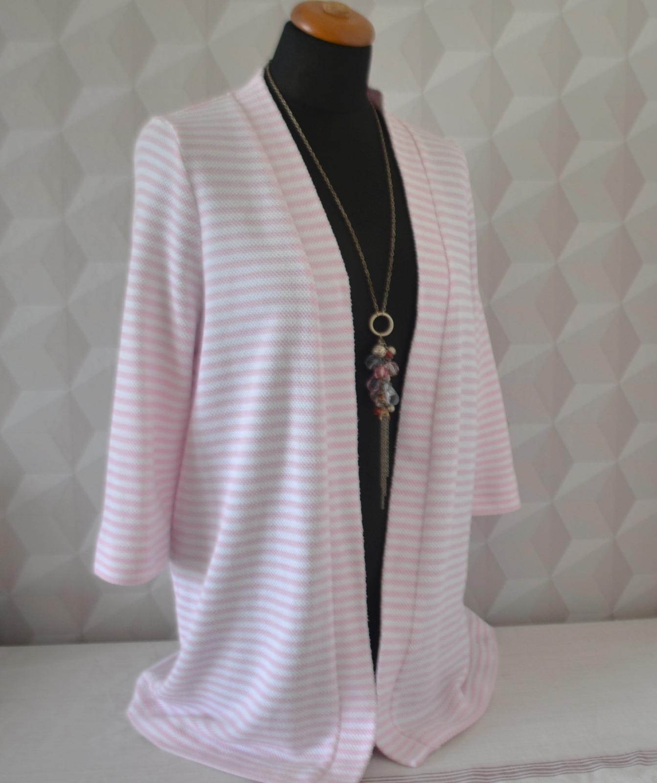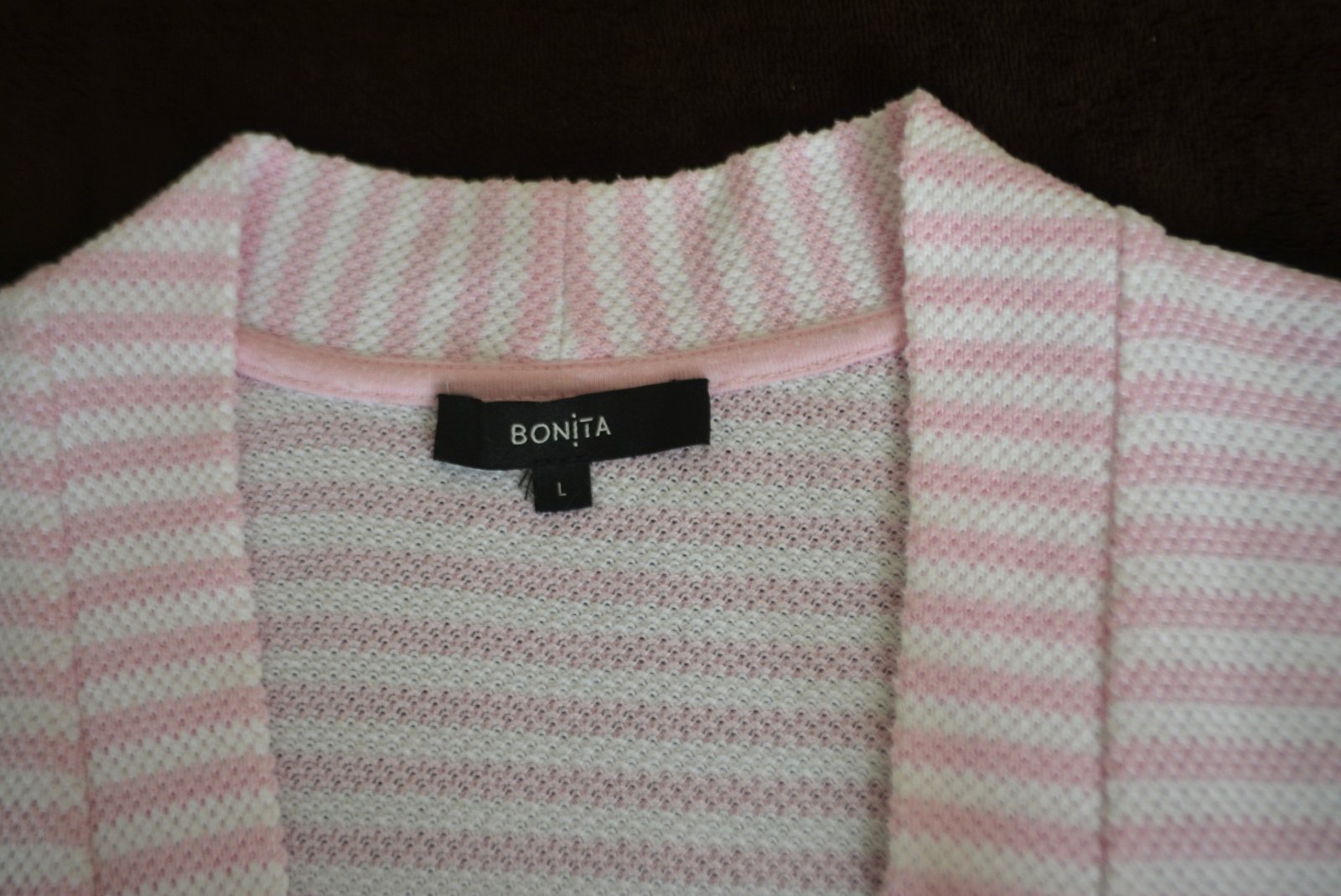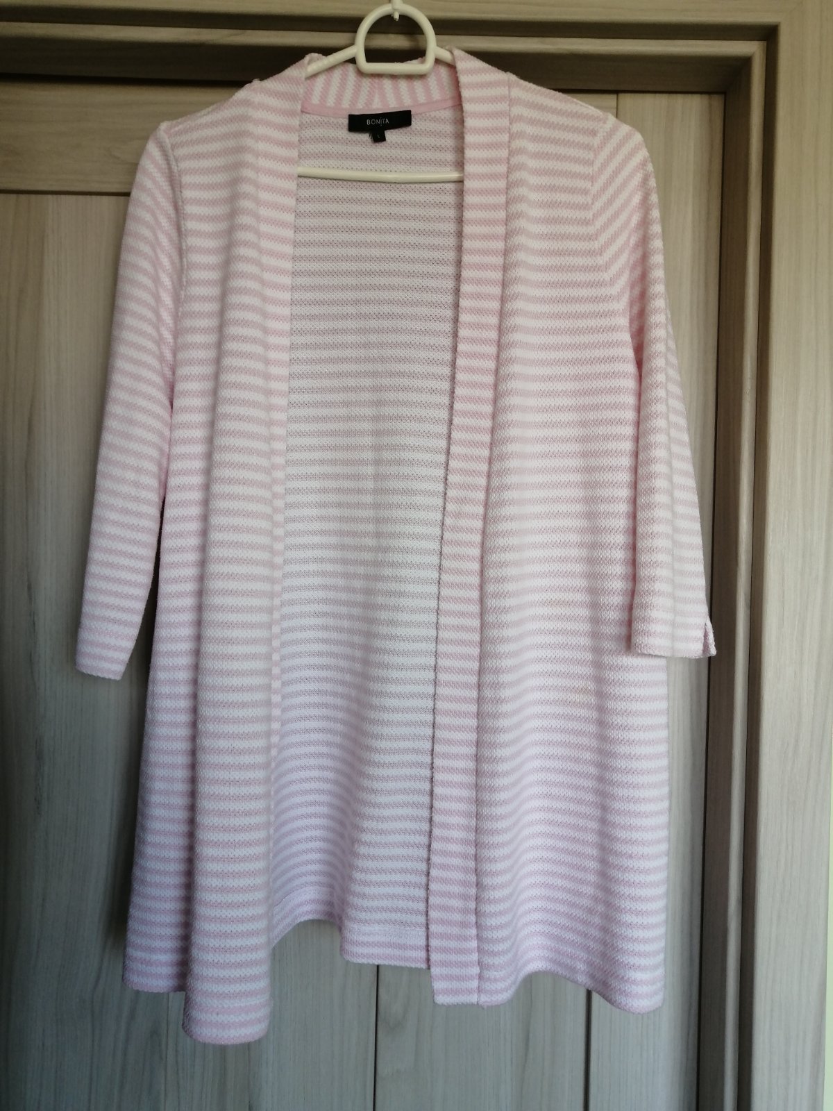 Dámsky kardigán Bonita, bielo-ružovo prúžkovaný, bez zapínania.