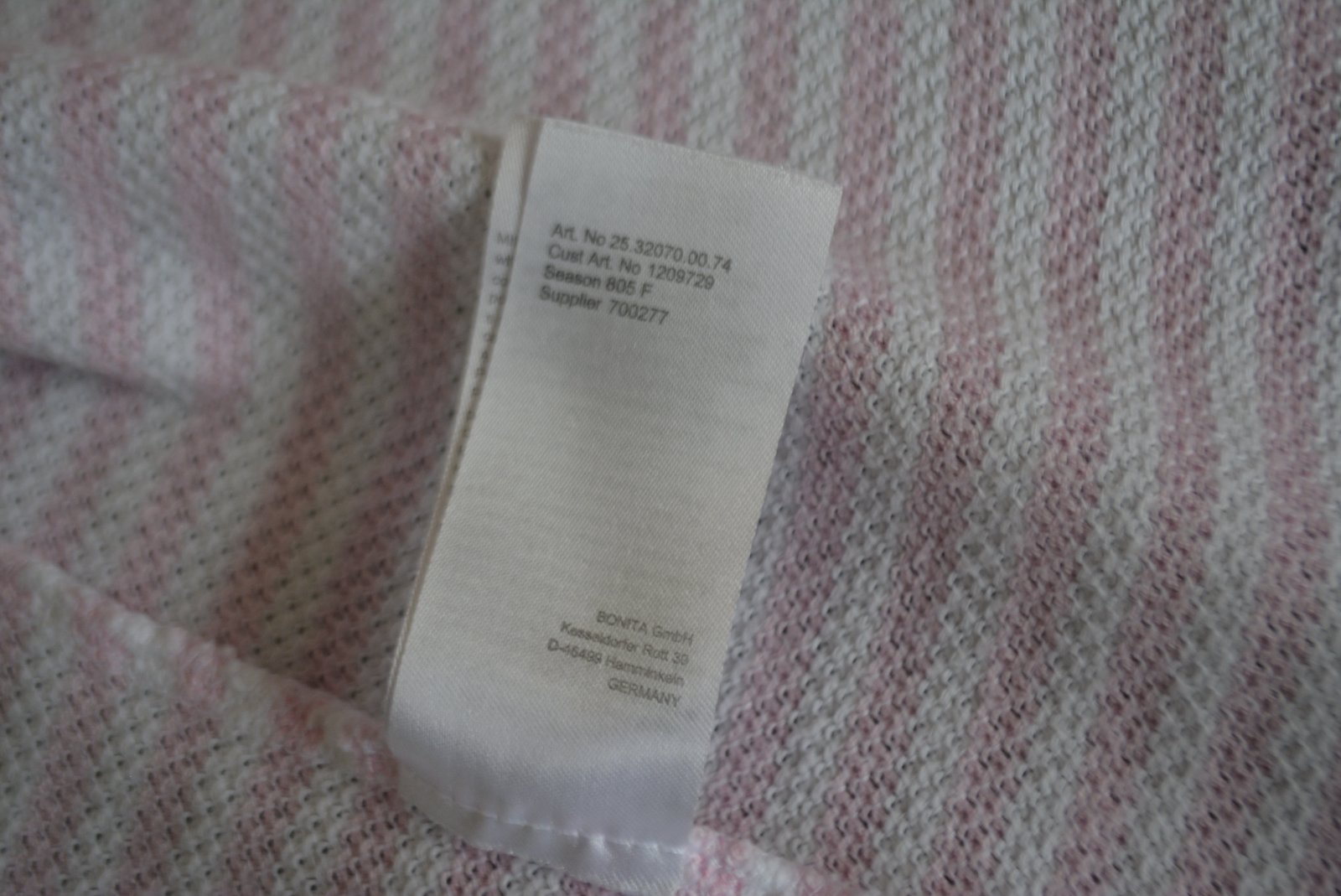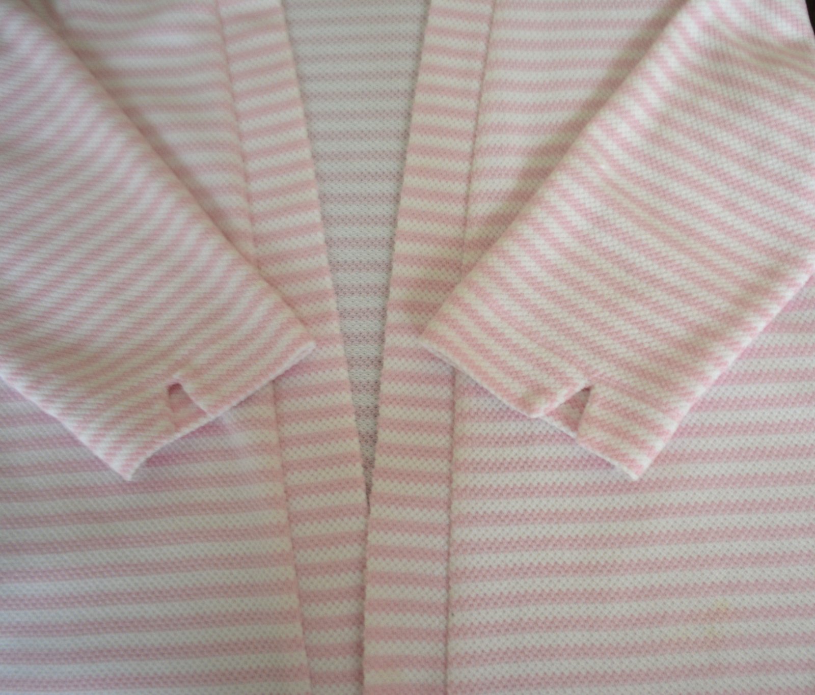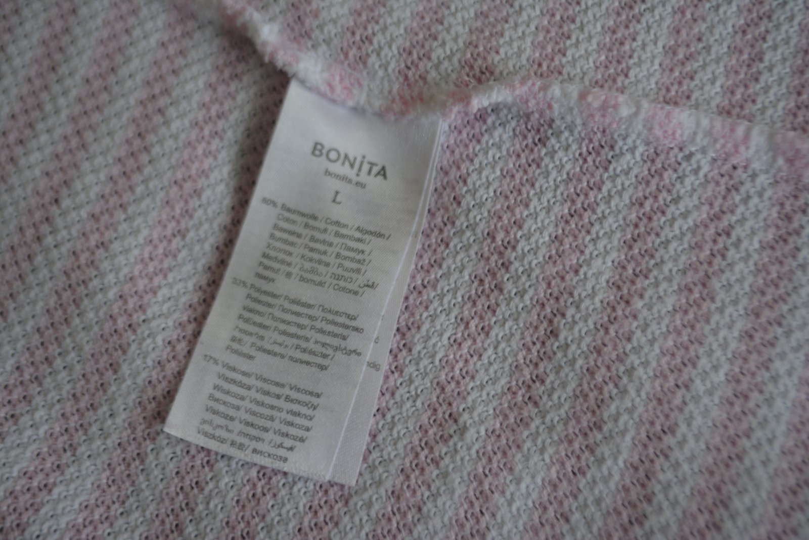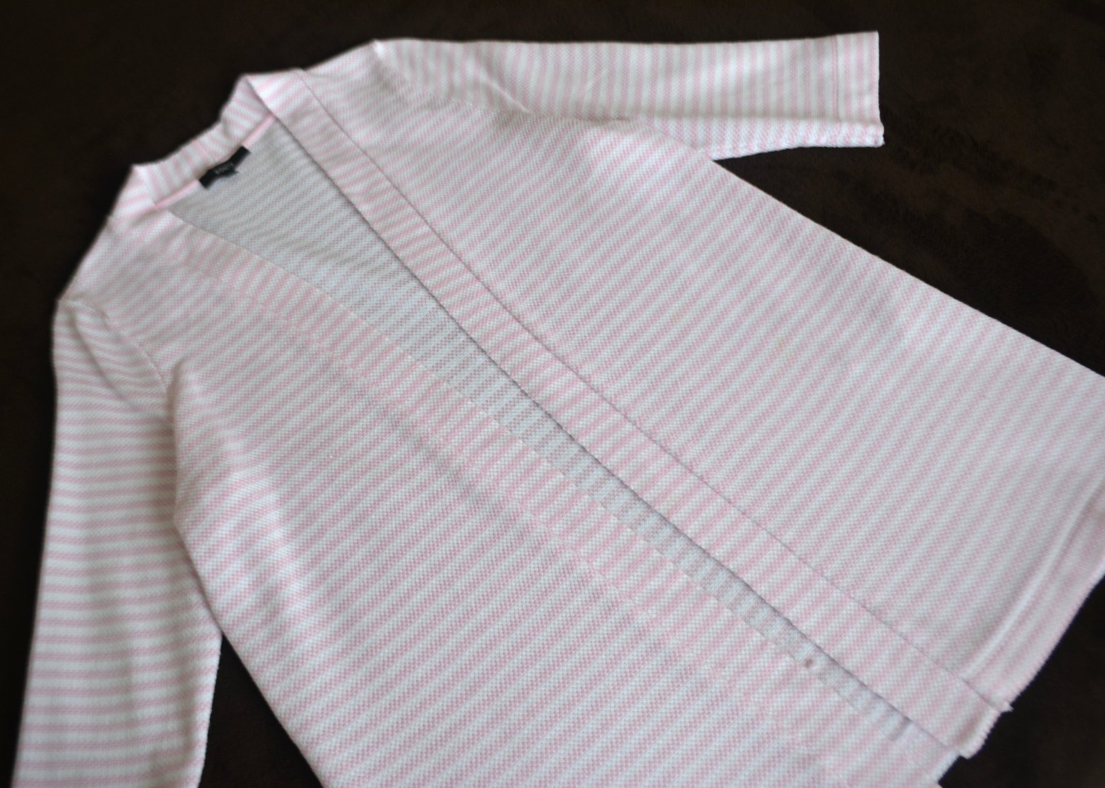 Dámsky kardigán Bonita, bielo-ružovo prúžkovaný, bez zapínania.