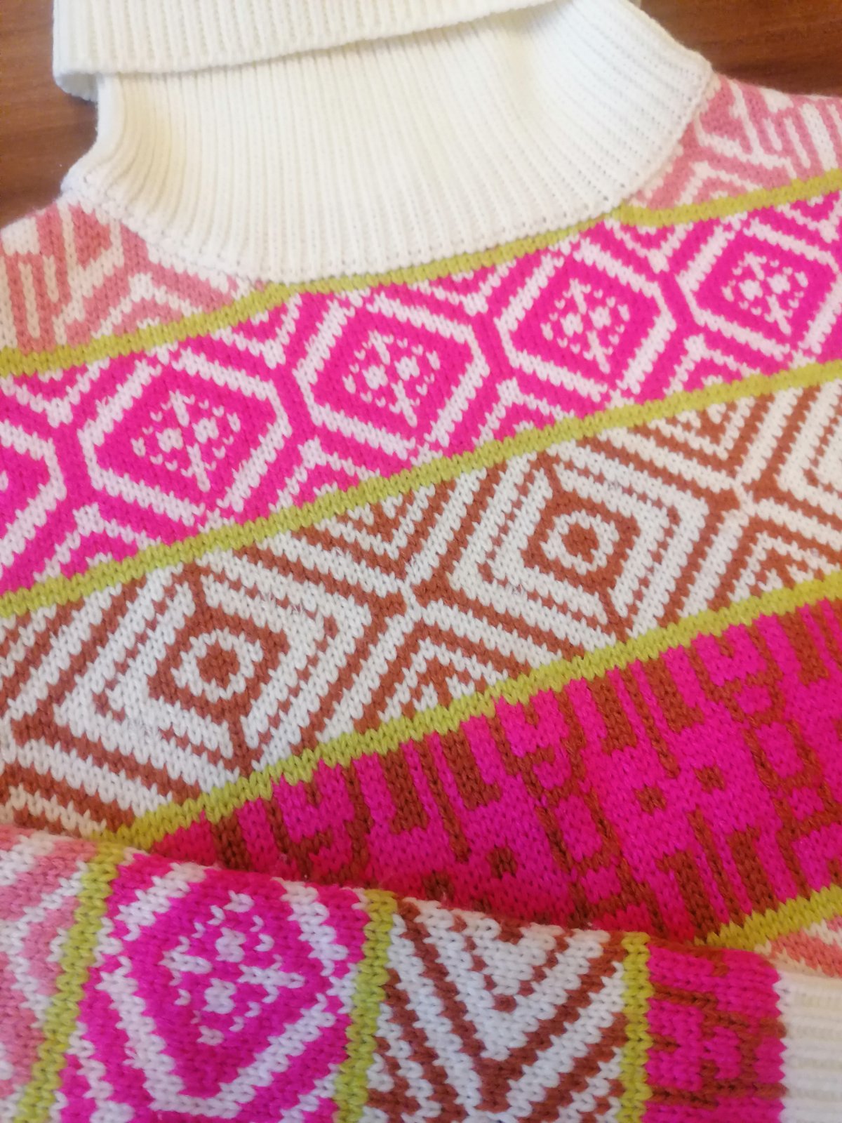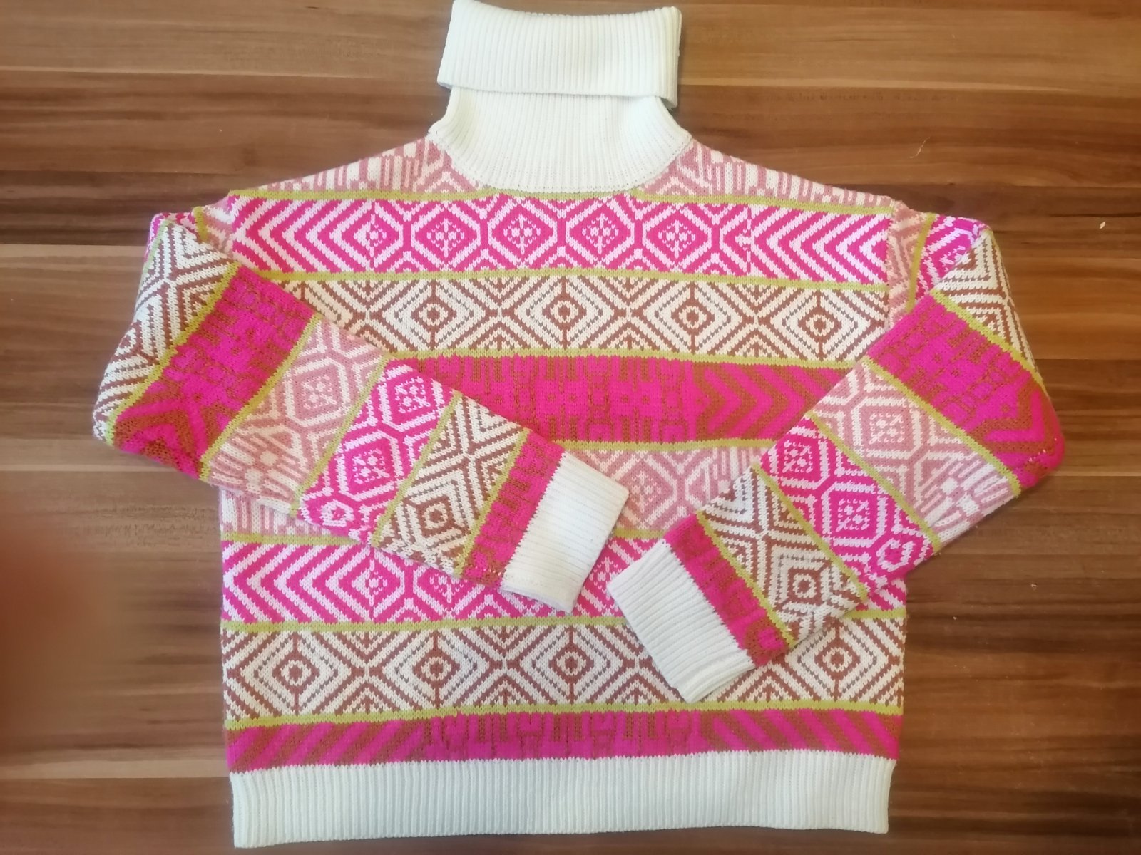 Hrubý pletený pulóver so stojačikom, vhodný na zimu. Základ v krémovej farbe dopĺňajú výrazné vzory v ostro ružovej, hnedočervenej a limetkovej farbe. Úplne nový, nikdy nenosený a nepoužívaný. Neb...
