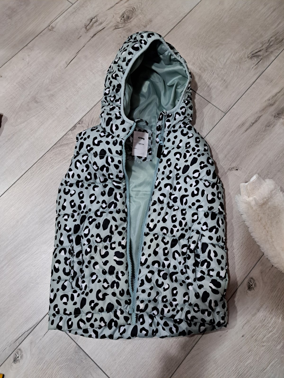 podsita satenom,nosena,uz je trochu sprana,ale nositelna aj do skoly,futro sa malinko para na boku treba len zost,velkost nie je uvedena,ale my sme nosili od128-146,dlzka chrbta 49cm,sirka pod pazu...