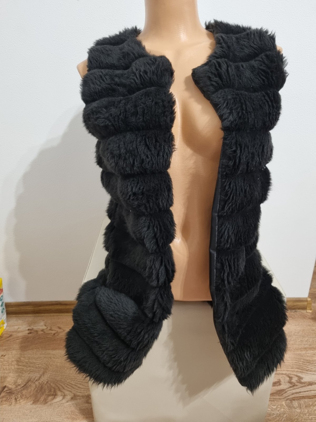 Nádherná čierna dlhšia vesta s kožušinkou, nenosená. Len mi stojí a nemám kde využiť, radšej si dávam len bundu. S kapucňou, vnútri podšitá. Sedí na S aj M. Pofotila som na viac krát keďže blesk sk...