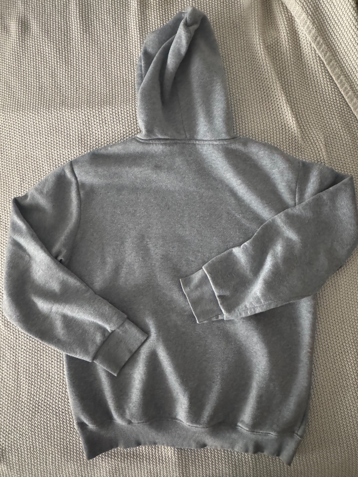 Šedá mikina s modrým zipsom aj kapucňou. Má 2 vrecká. Mne je už dosť veľká tak posúvam ďalej. Dlžka: 65cm Šírka: 48cm (je elastická, môže byť aj viac.)