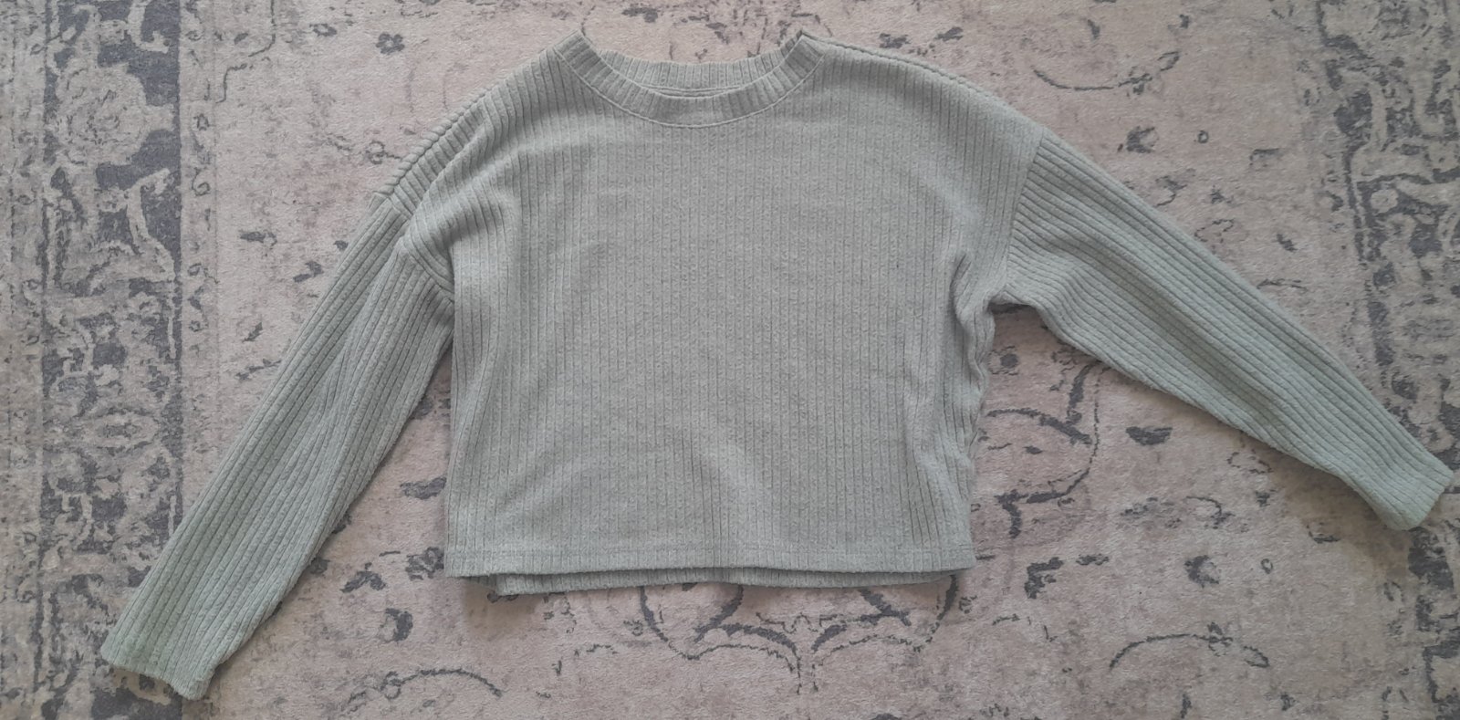 Predám kratšiu mikinku farba pekná mätovo zelená nedá sa tak odfotit, odhadujem veľkosť 128/134, dĺžka 37cm, šírka pod pazuchami 43cm, dĺžka rukáva od ramena 37cm, bežné známky nosenia.