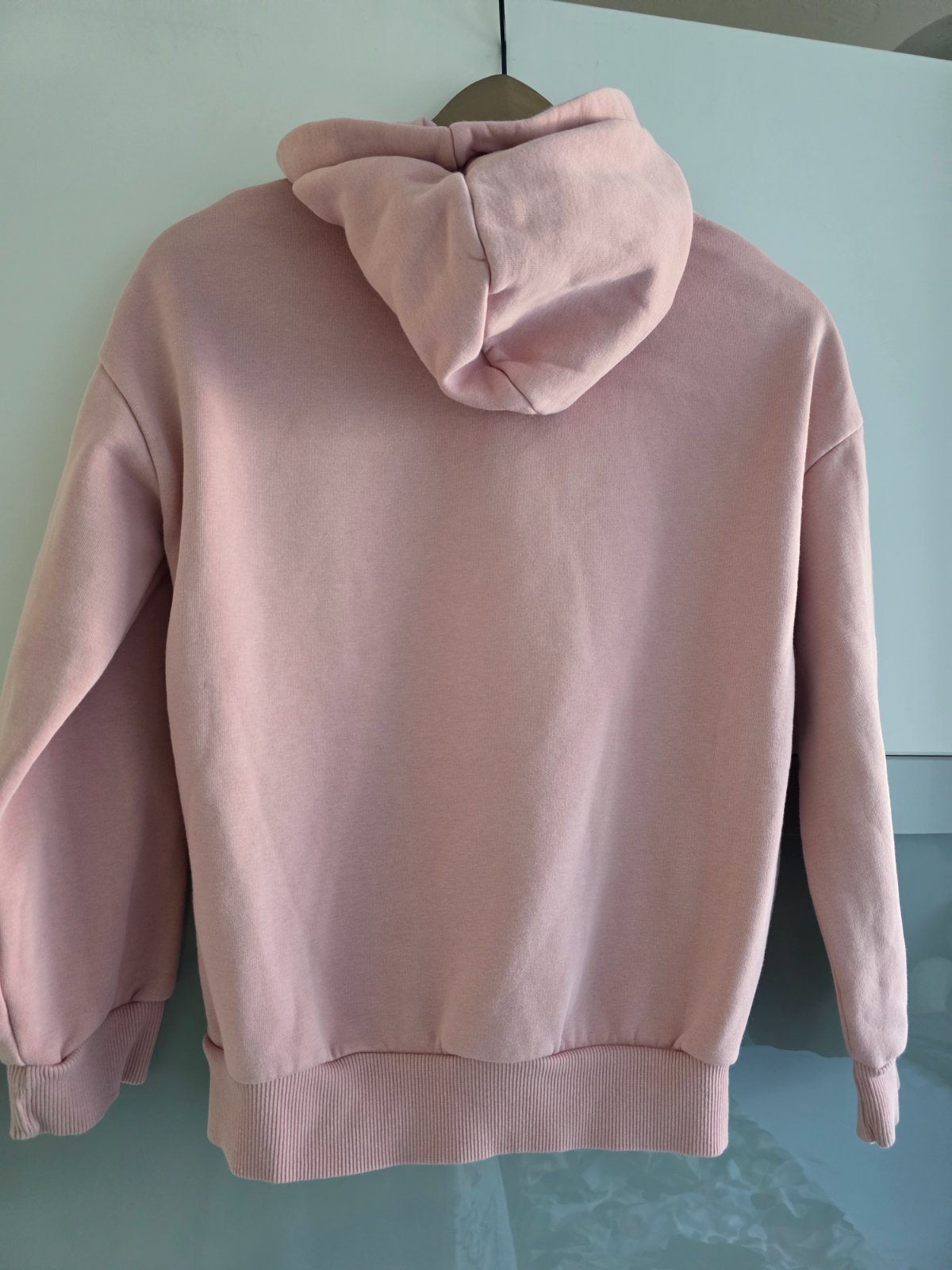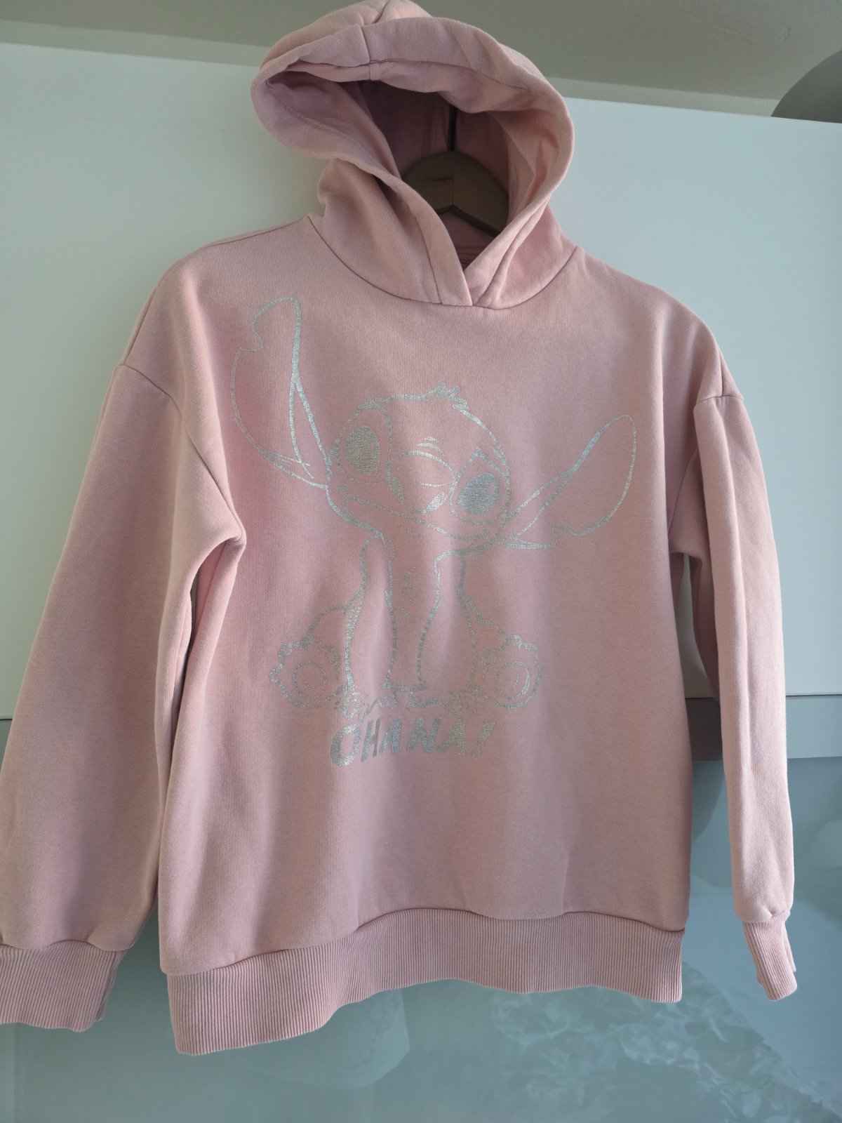 mikina, u nás veľmi obľúbená, viac nosená, je to už trochu vidieť, nemá žmolky, poškodenia, na doma ešte parádu narobí, nažehlovačka je popukaná od výroby, farba je taká špinavo-ružová