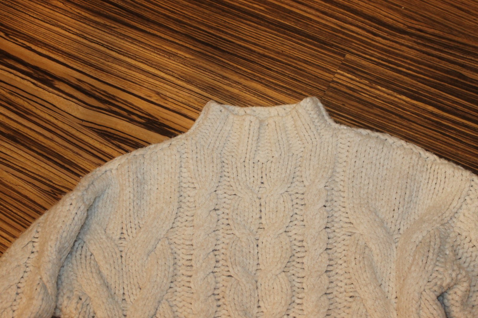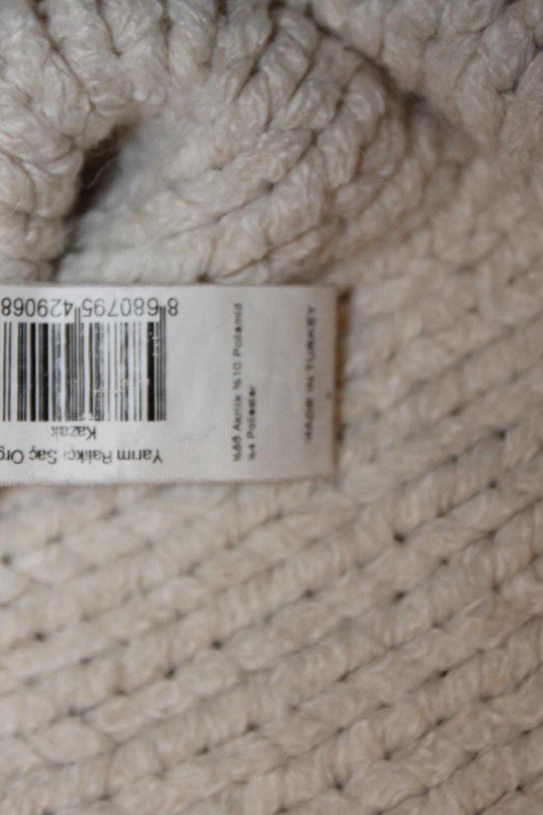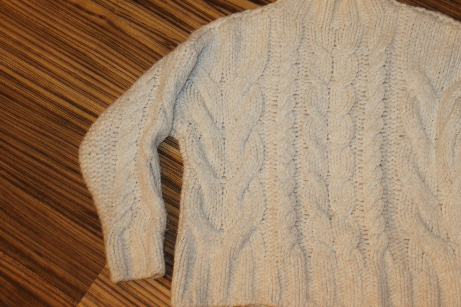 Nosený, jemné žmolky. Farba krémová, Teplý, hrubší. Veľ. L, RO: š 2x 58 cm, dl. 53 cm. Váha