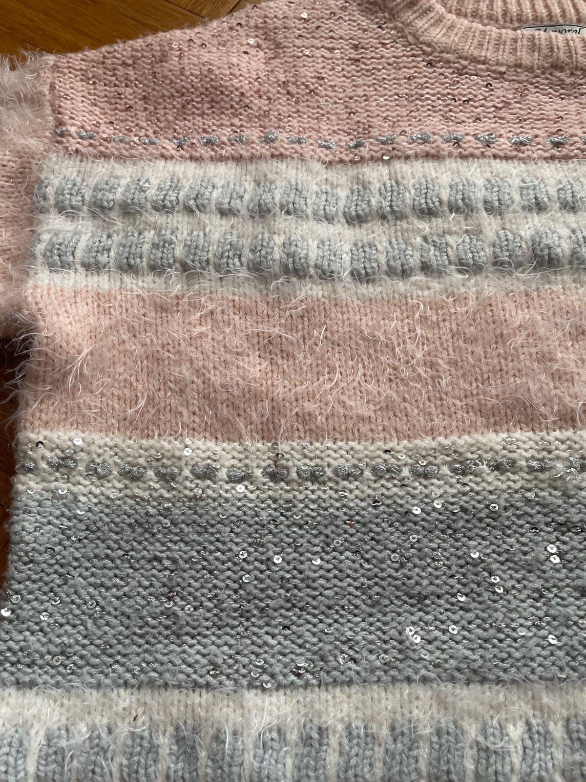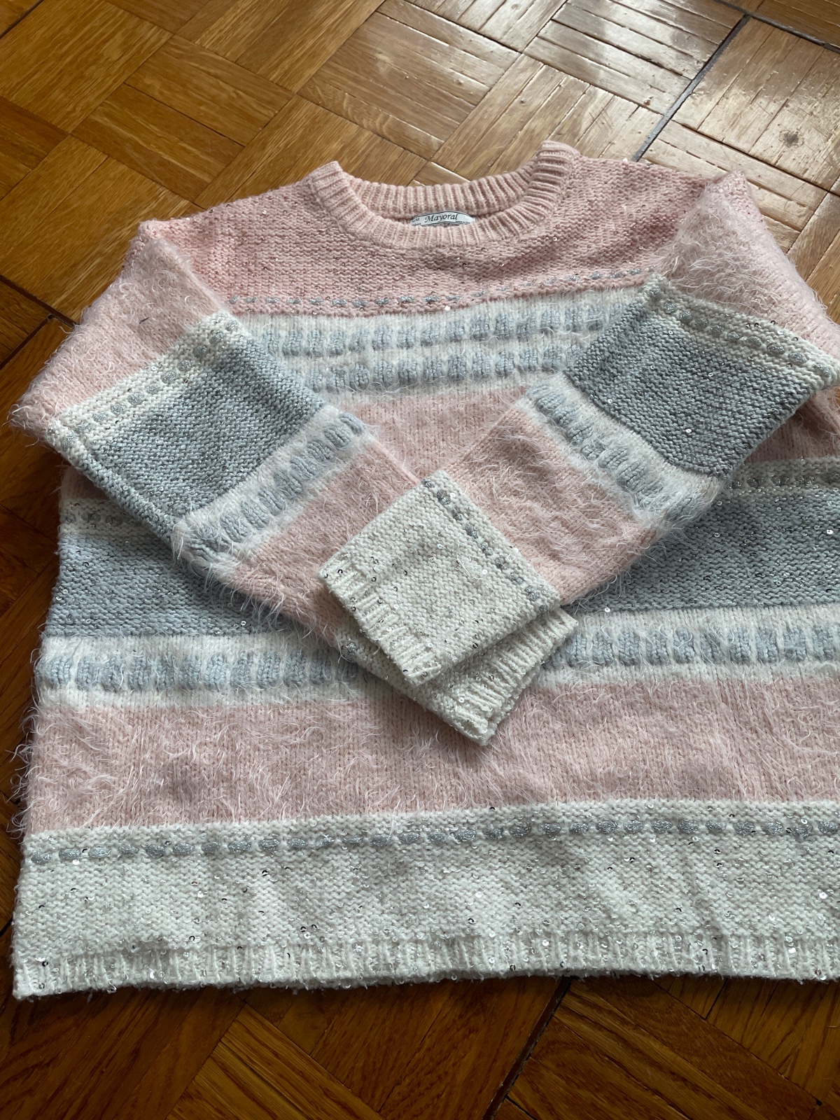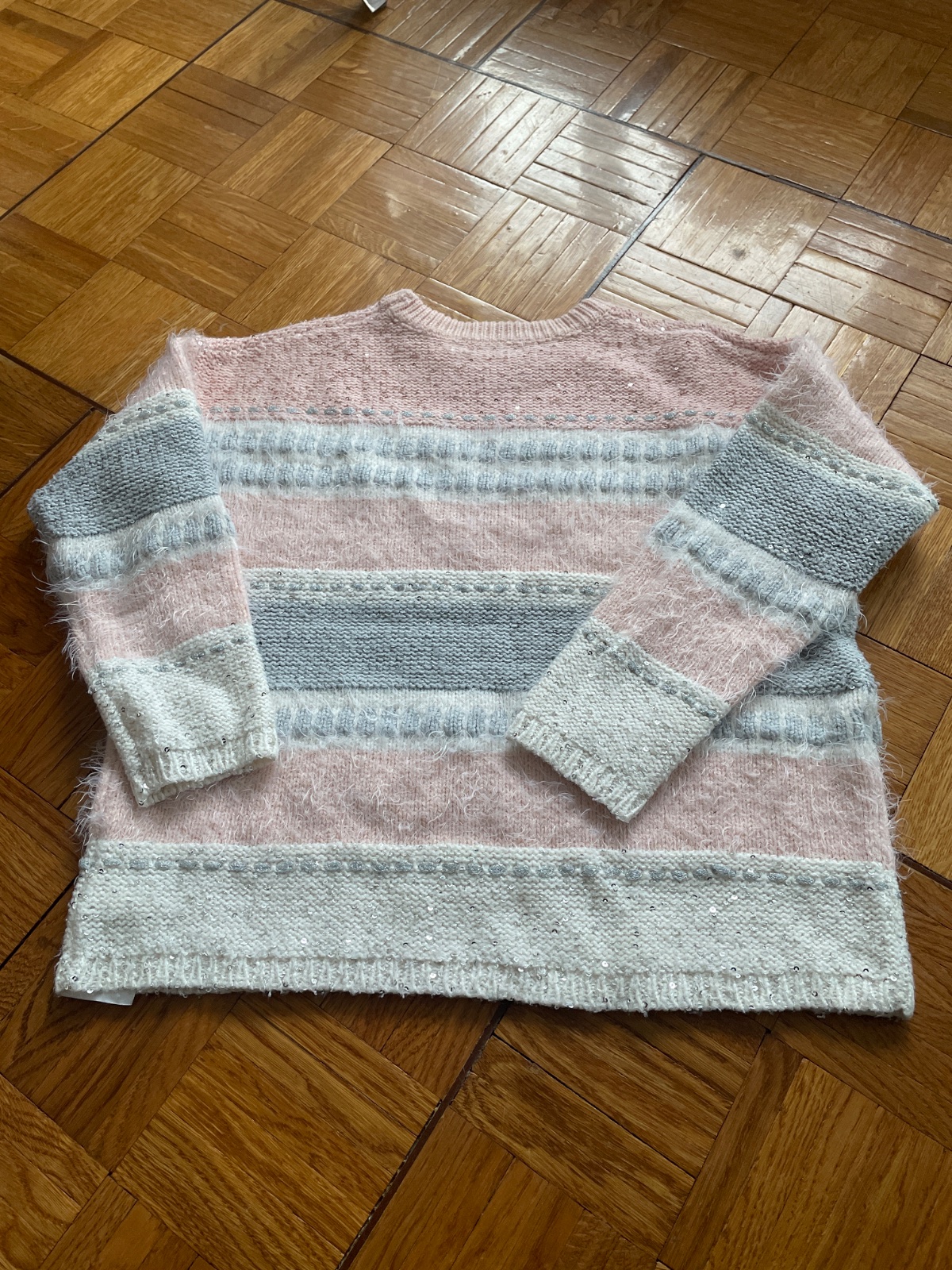 Krásny svetríky s flitrami.V skutočnosti je krajší ako na fotke.Rukáv od pleca 36,ramená 49,obvod 49,celková dľžka 48