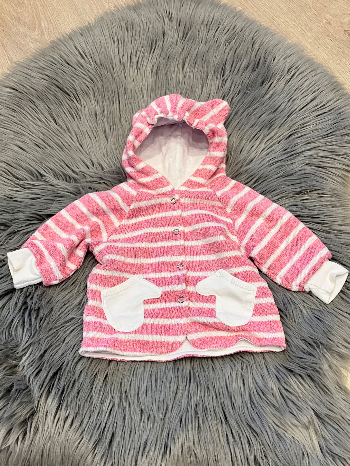 Dievčenská hrubá mikina pásikavá s kapucňou, ušká na kapucni, vhodná aj ako prechodný kabát, zapínanie na cvoky, dve predné vrecká, elastická, materiál 100%polyester 100%bavlna.