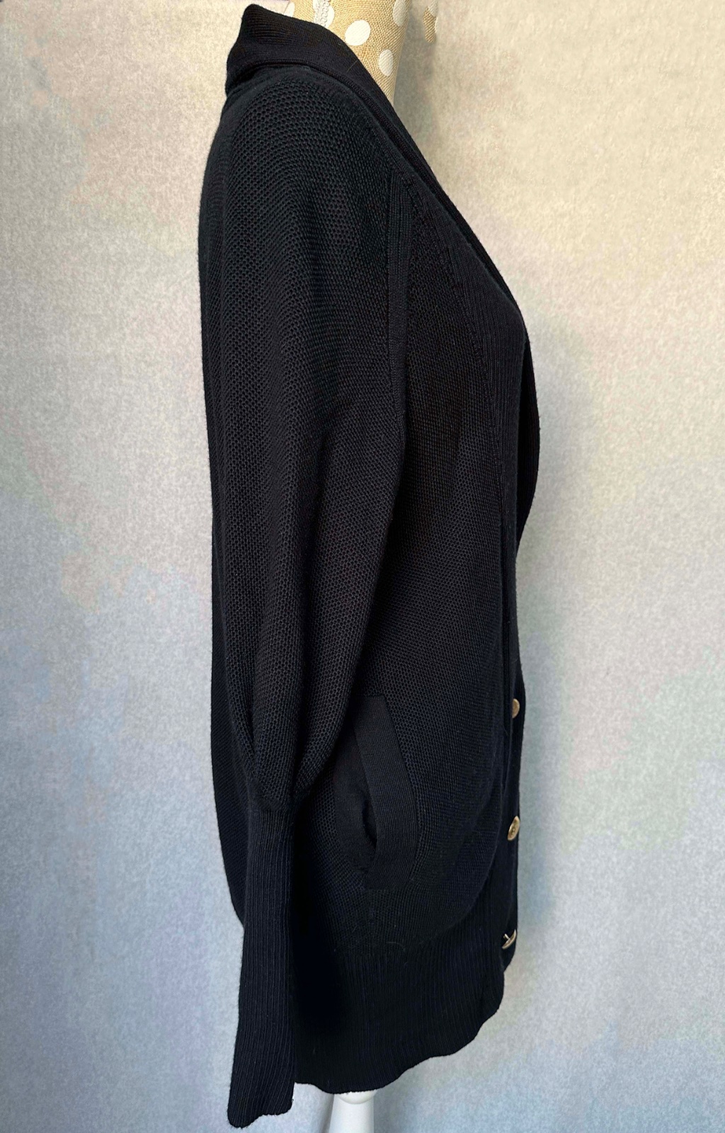 Luxusný vlnený kardigán zn. Paul & Smith. Veľmi štýlový a elegantný, s výraznými zlatými gombíkmi s erbom, šálový golier, vrecká na bokoch, padnuté ramená, zúžený rukáv, Vo veľmi peknom stave, bez poškodení.