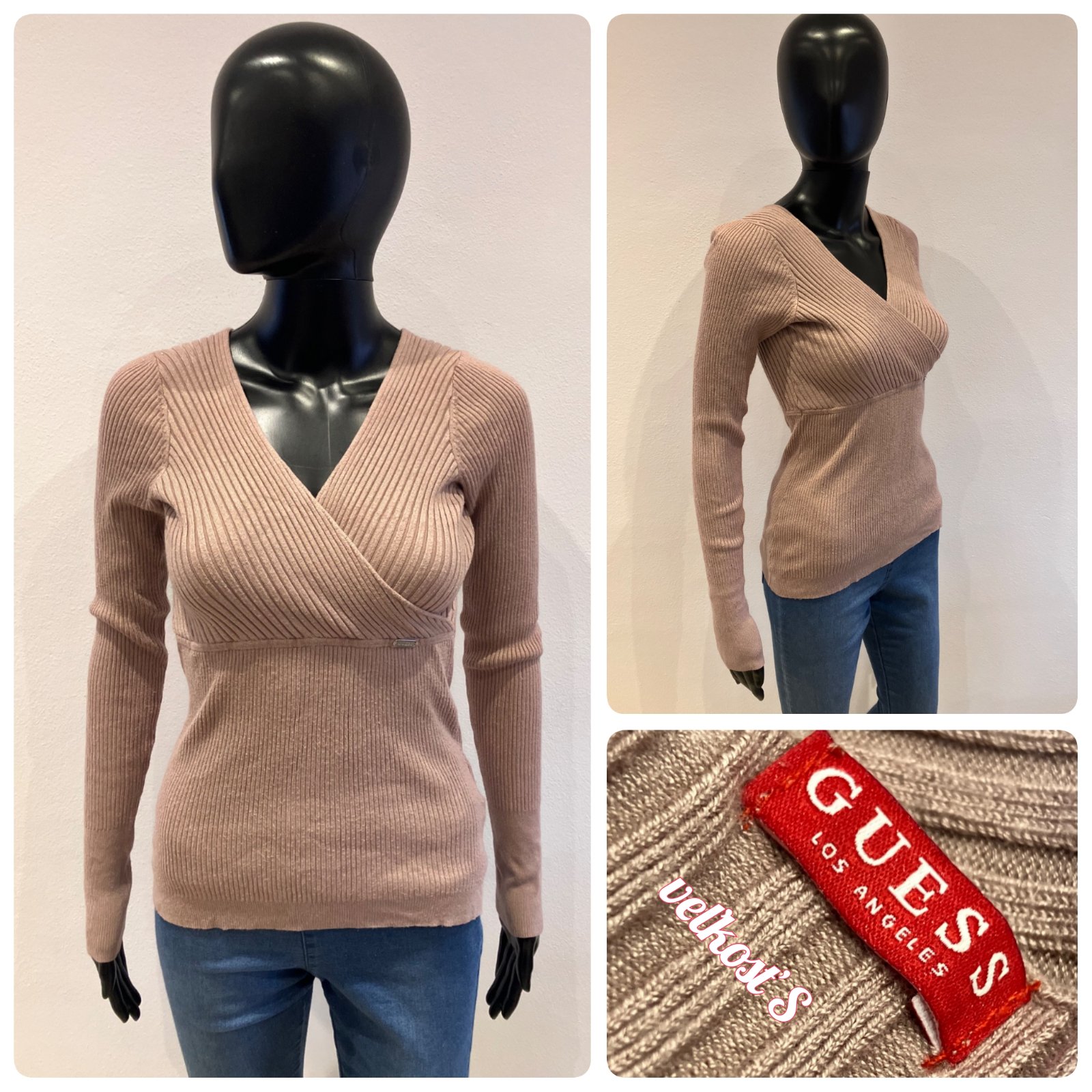 Dámsky rebrovaný sveter, V výstrih, elastický, materiál 78%viskóza 22%polyamid. Farba: ružovo-hnedá.