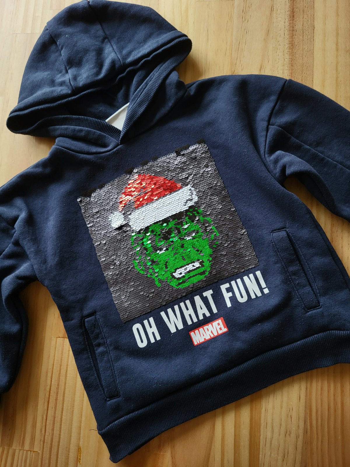 veľmi dobrý stav, mierne žmolky no nič hrozné, s meniacim sa flitrovým obrázkom-pozri detaily, bočné vačky, kapucňa podšitá, poštovné doporučene 3,50 €