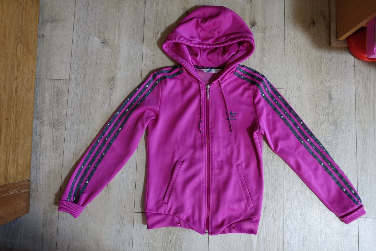 Predám prekrásnu mikinku originál Adidas vo veľkosti 36, ale sedí skôr na veľkosť 146/152. Riaďte sa prosím rozmermi. Bola nosená na striedačku aj s inými, ale je v peknom nosenom stave. Nedá sa mi ju pekne nafotiť, v skutočnosti je oveľa krajšia. Mikinka nemá ani fľaky, ani diery, ani žmolky. Mali sme toho veľmi veľa, nestíhali sme všetko nosiť. Mikinka je stredne hrubá. Má vrecká. Zips je plne funkčný. Dĺžka je 55 cm a šírka 43 cm (meraná popod pazuškami, mierne sa potom zužuje smerom dole k patentu). Dĺžka rukáva od krku 68 cm a od ramena 57 cm. Patent na konci rúk sa dá ešte zahnúť. Patent má dĺžku 6,5 cm a dá sa zahnúť na 3,5 cm. Na fotke je patent zahnutý.