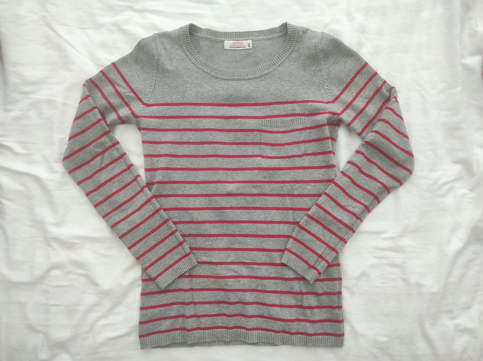 Tenší pruzkovany pulover. Na hrudi malé vrecko. Bez poškodenia