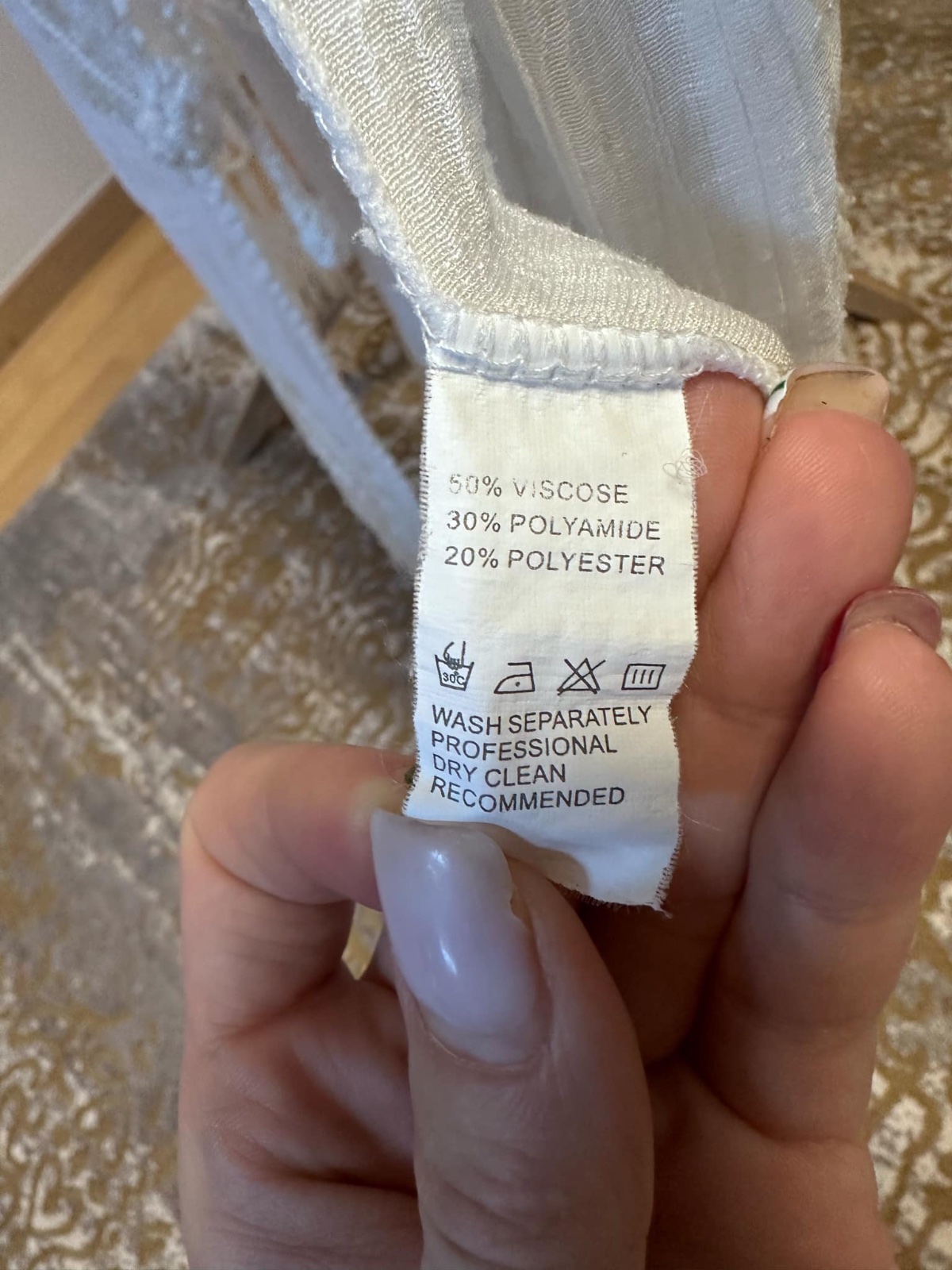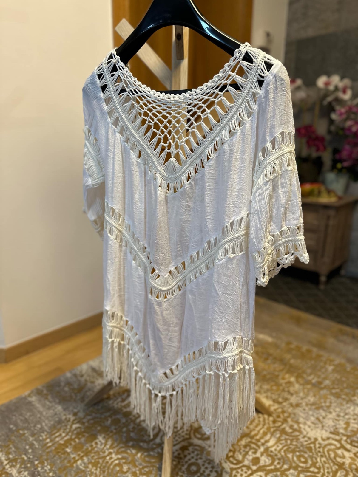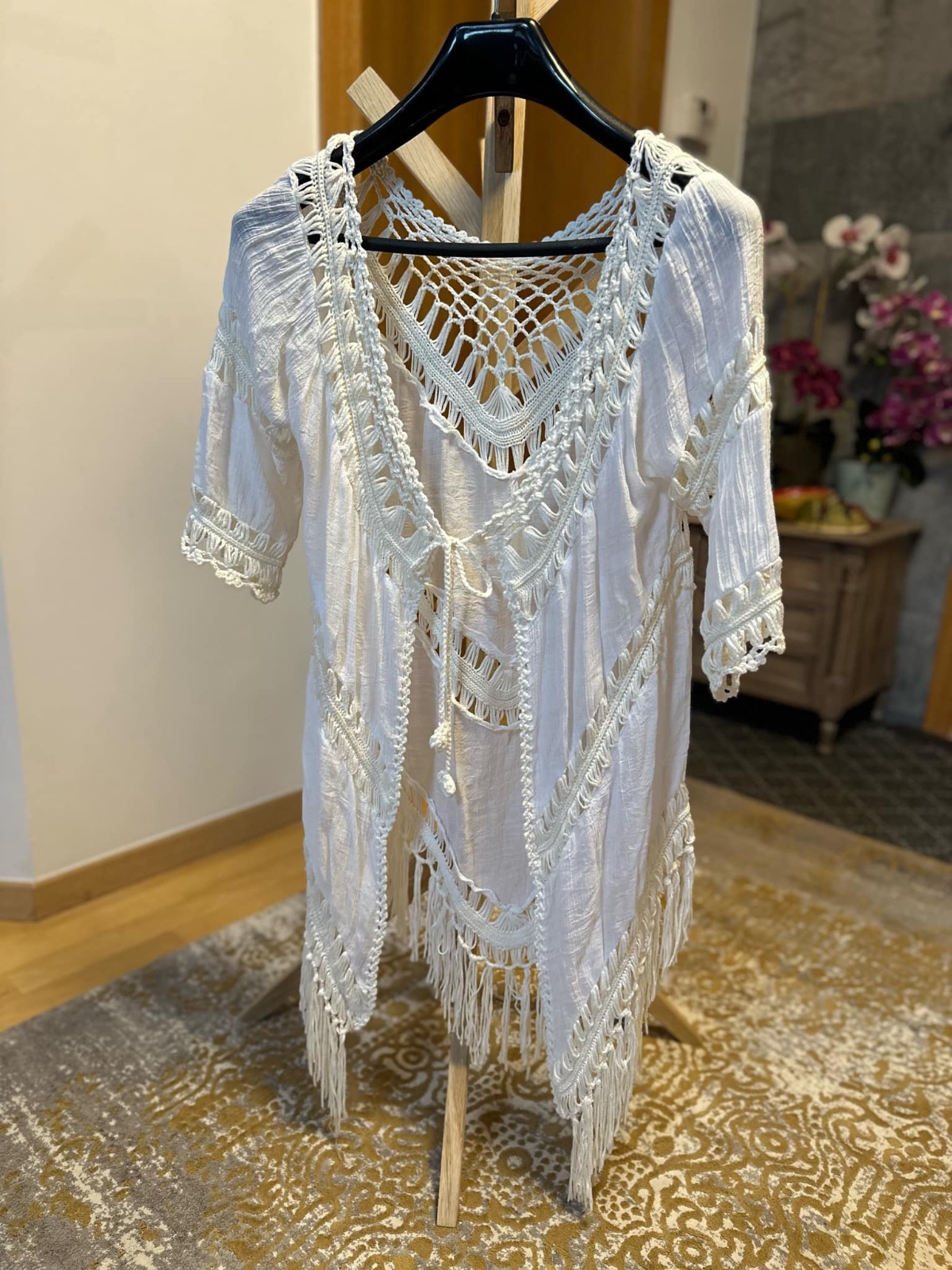 V dobrom stave, len prežehliť. Zapínanie na zavezovanie. Asymetrický. Po najdlhší cíp dĺžka 88 cm. Po koniec strapca 100 cm. Postovné obyc list 2€