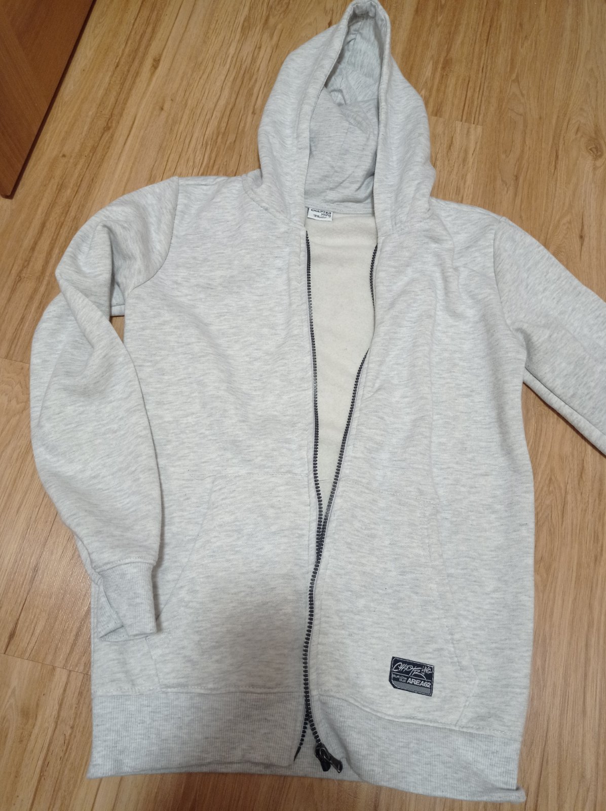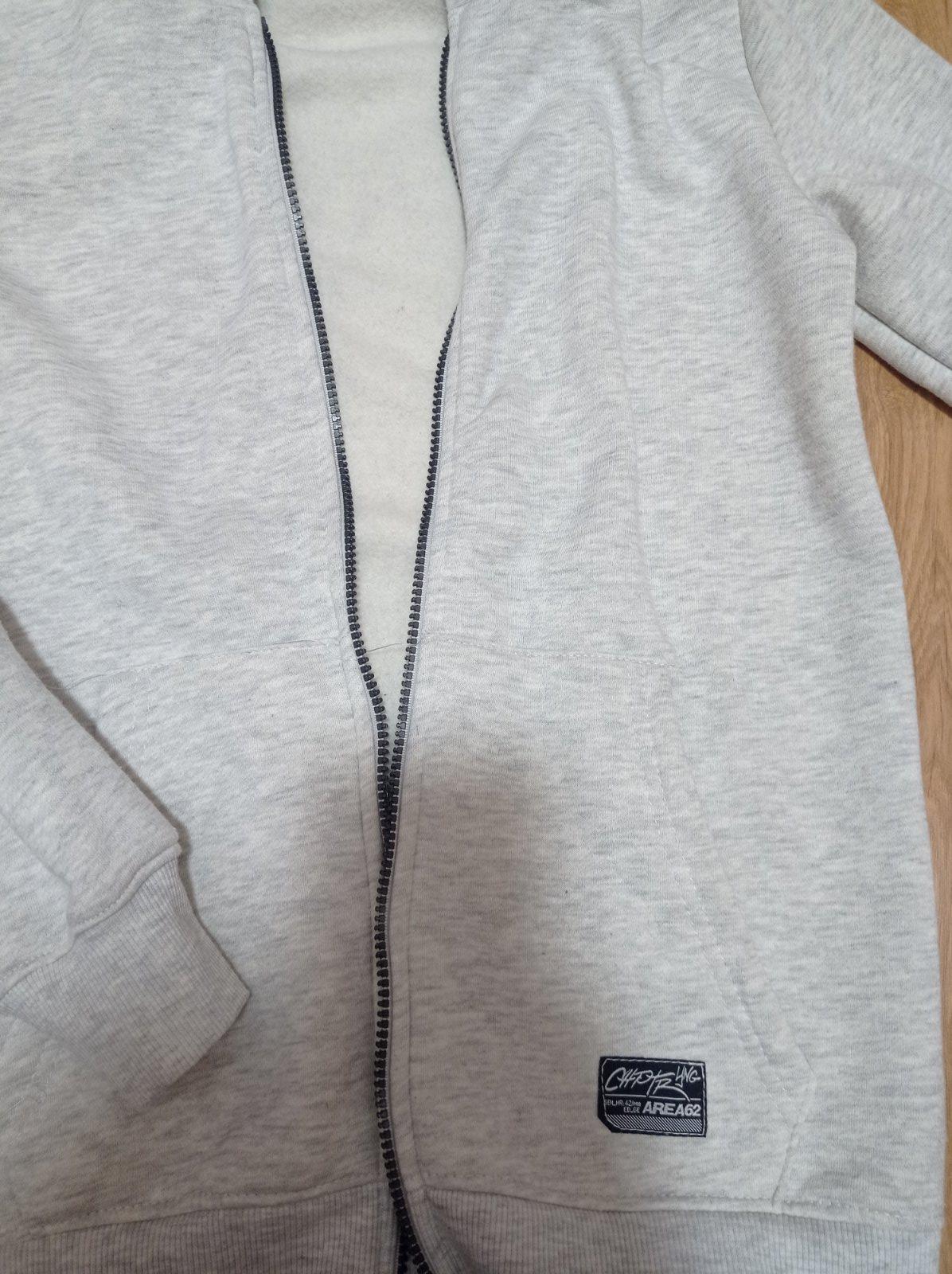 Bledosiva vyteplena mikina, ozaj pekny stav. Nebola moc nosena. Rychlo vyrastol syn. Dlzka:65,5 cm, rukav od krku:68,5 cm.