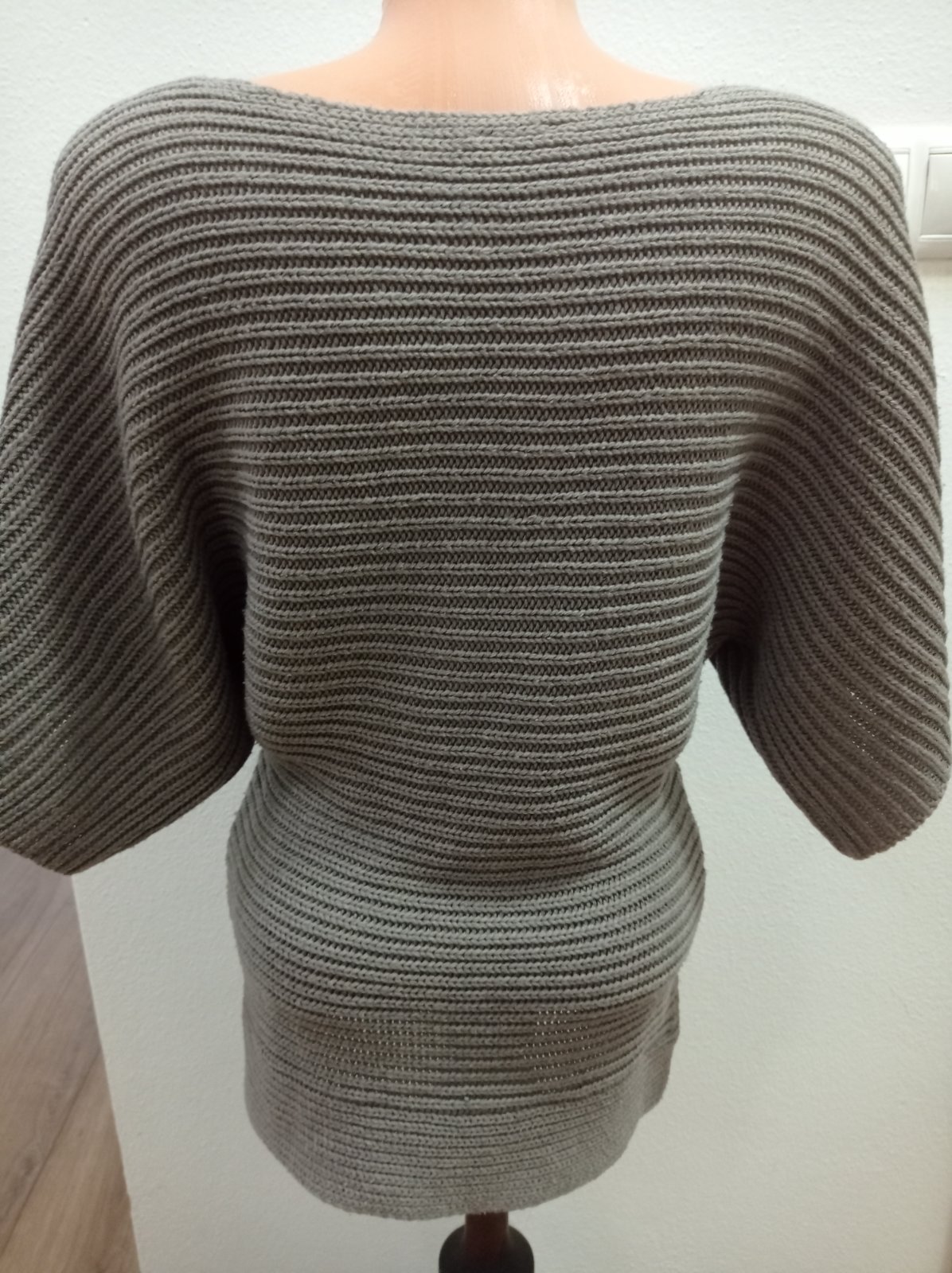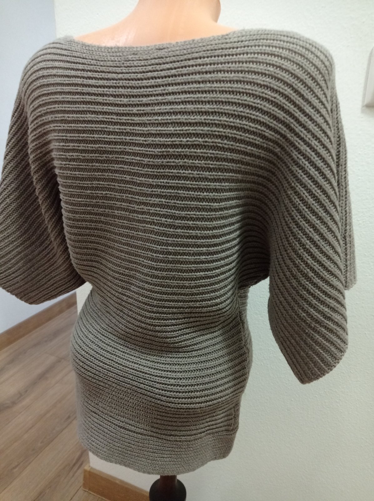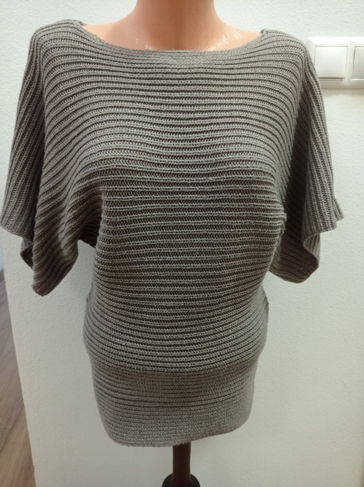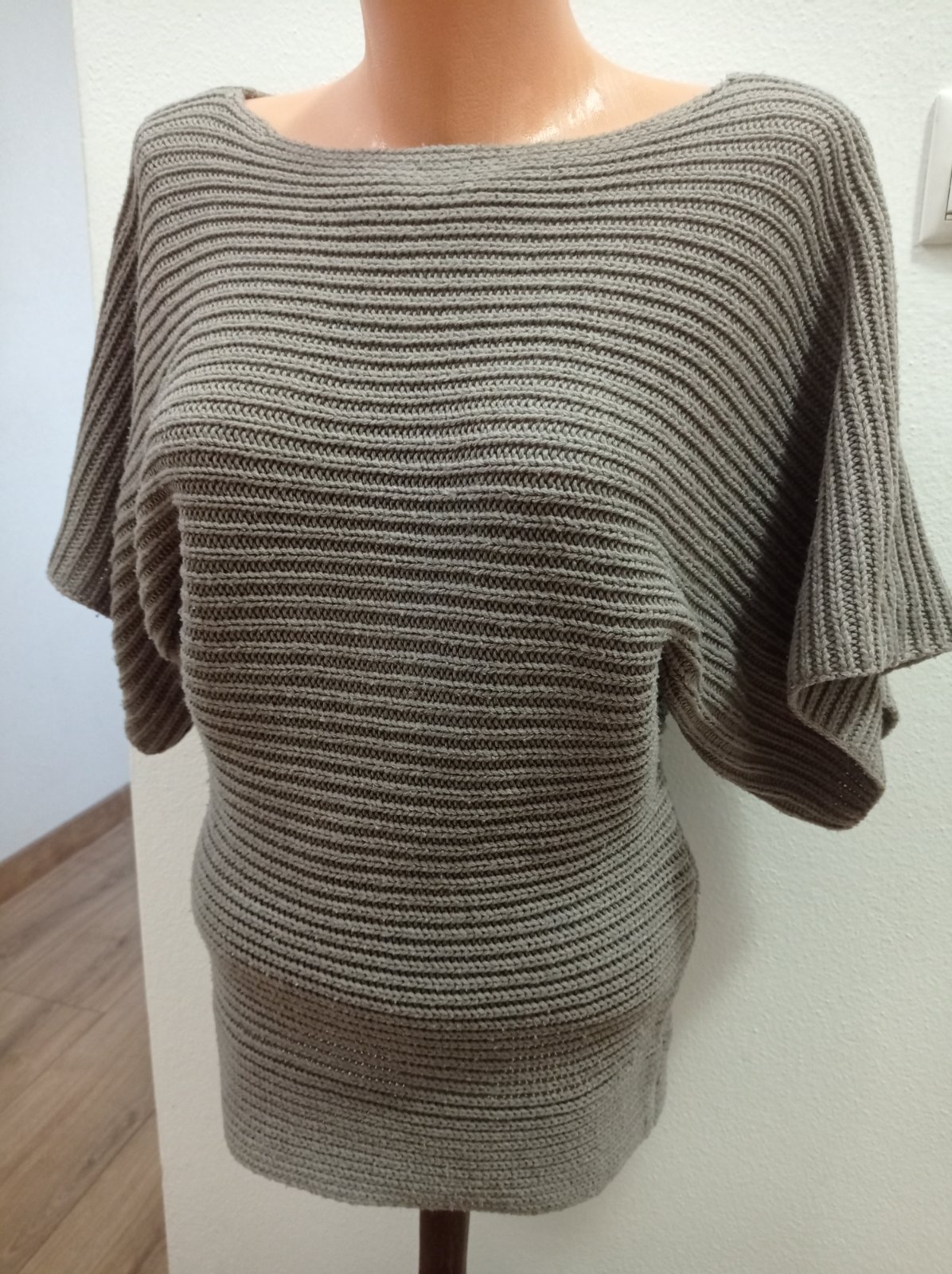 Pulóver je vo výbornom stave, má rukáv po lakeť, farba hnedo sivá. Super vyzerá oblečený. Veľkosť S, dĺžka 68 cm.