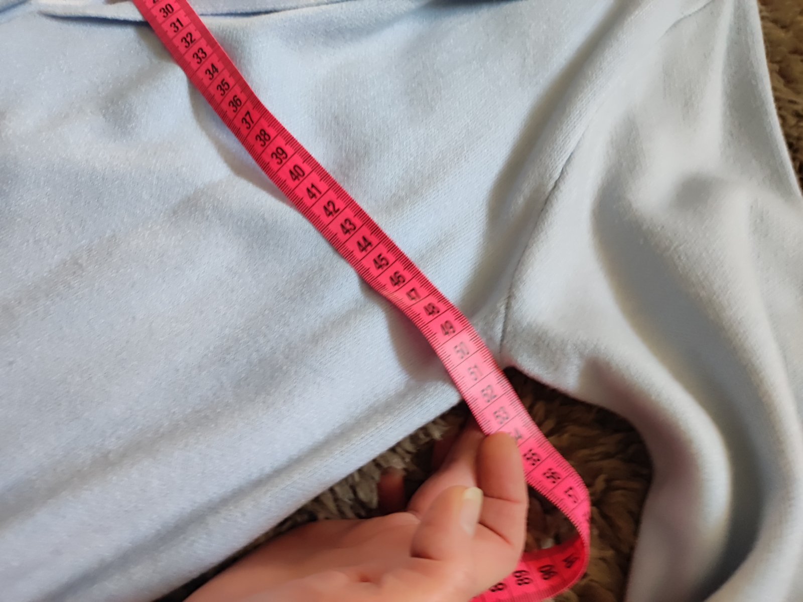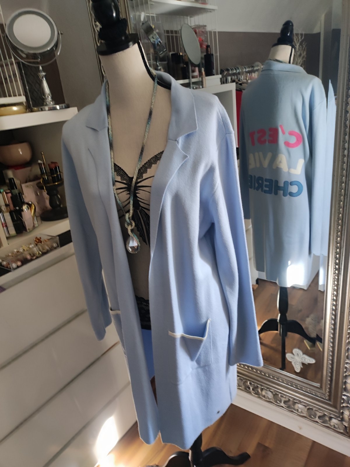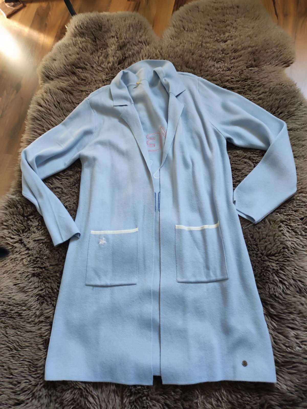 Svetrík bledomodrá pekna farba na boku s kratčími rozparkami. Prínemne mäkký materíal. Dlžka 73 cm a širka 50x2cm.