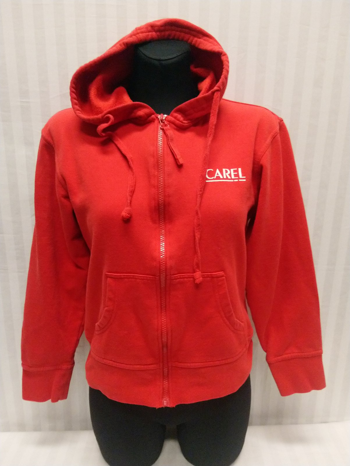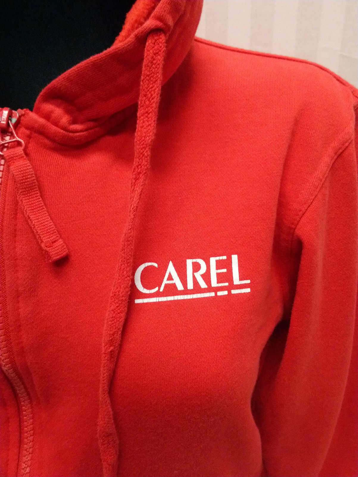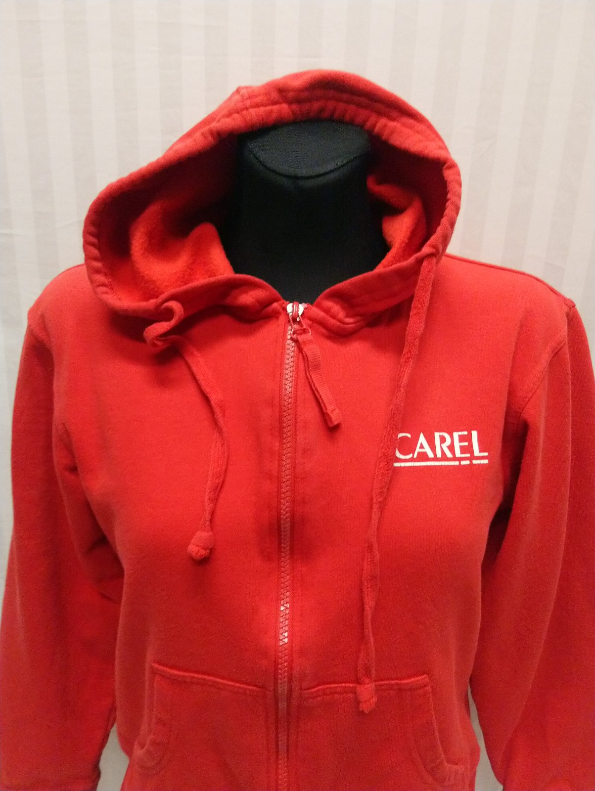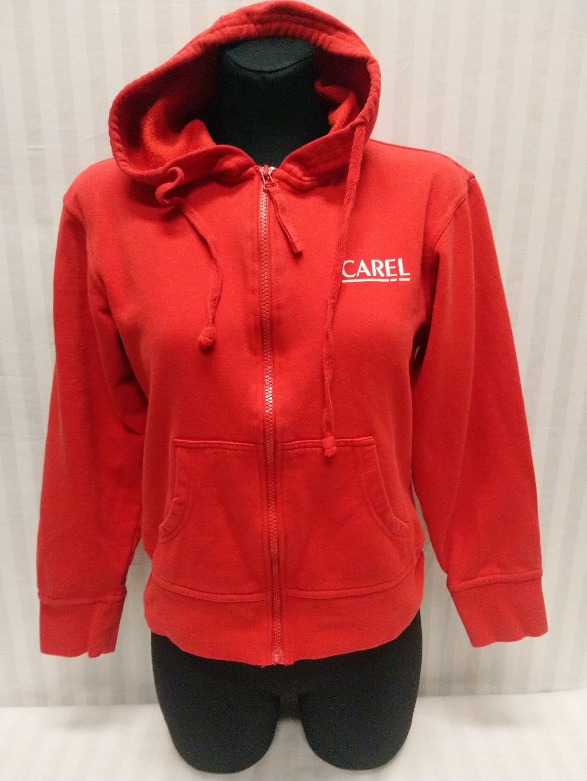 dámska červená mikina na zips s kapucňou, vrecká, farba je sýto červená,