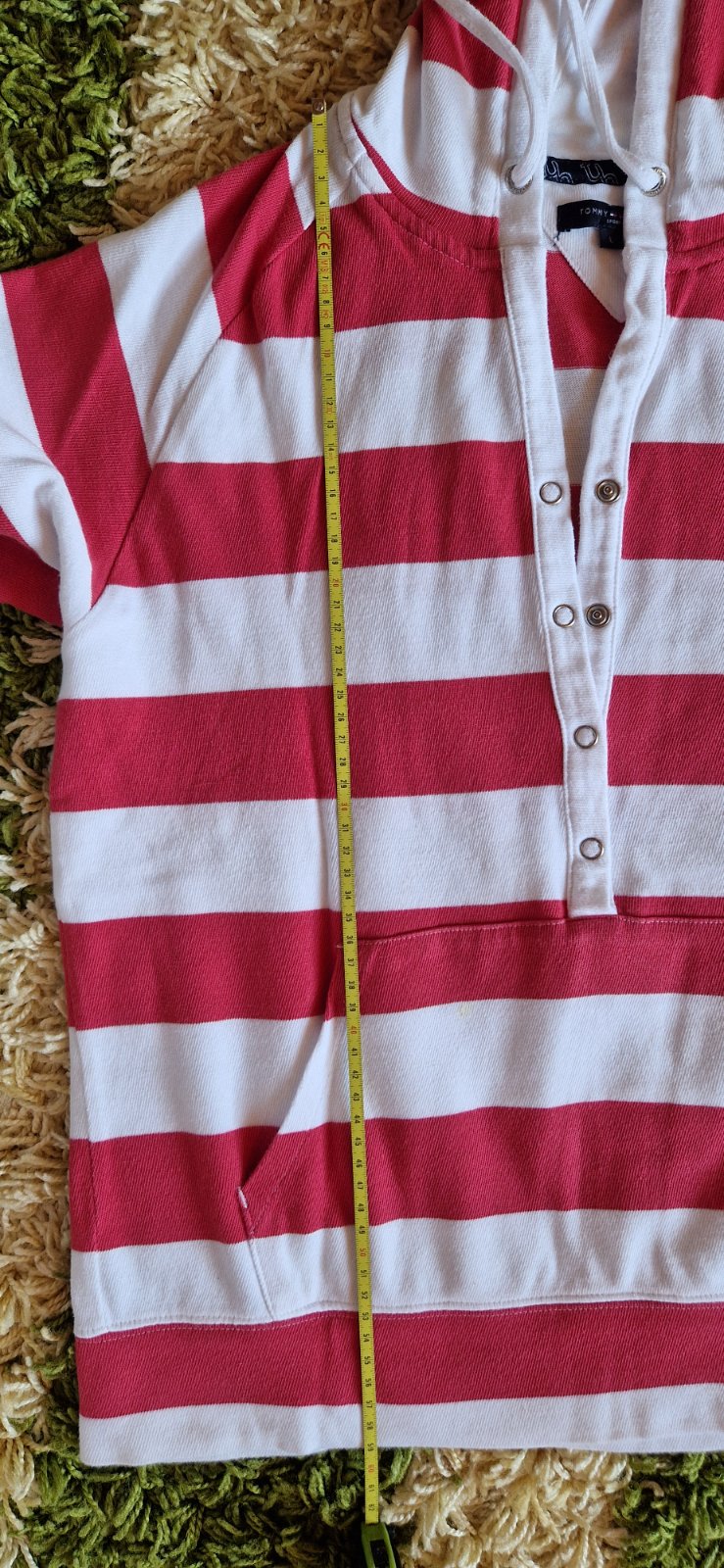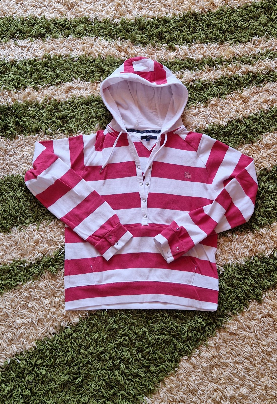 Tommy Hilfiger mikina s kapucňou vo veľkosti M (38-40). Mikina sa oblieka cez hlavu a ma hlbší vystrih (nie však velmi hlboký, tak akurát). Z kapucne vedú šnúrky cez pútka. Na prednej strane je vre...