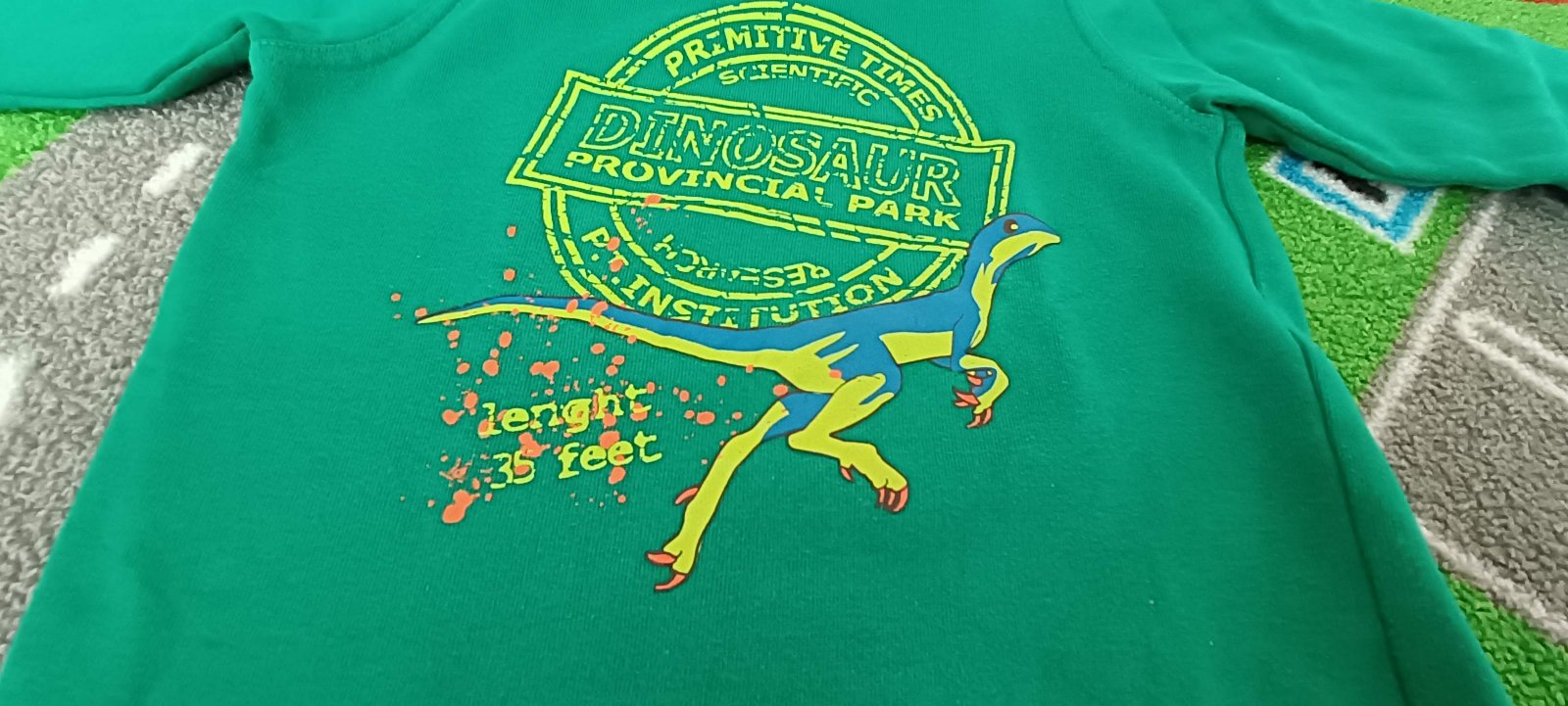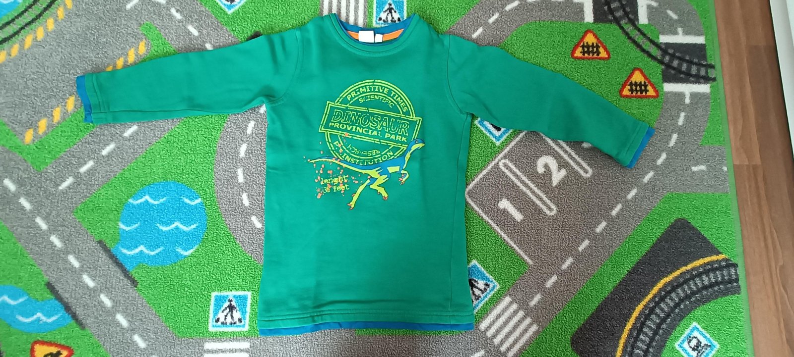Zelená - obrázok dinosaura - Dinosaurus Provincial Park - veľ. 122, t.j. 6-7 rokov, ale kľudne aj 116. Chybička - na chrbte je dierka, nie je problém zašiť: