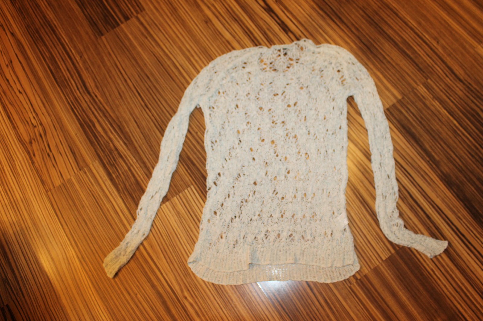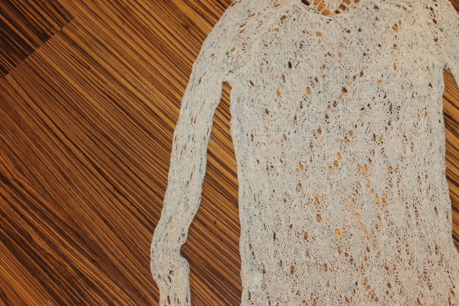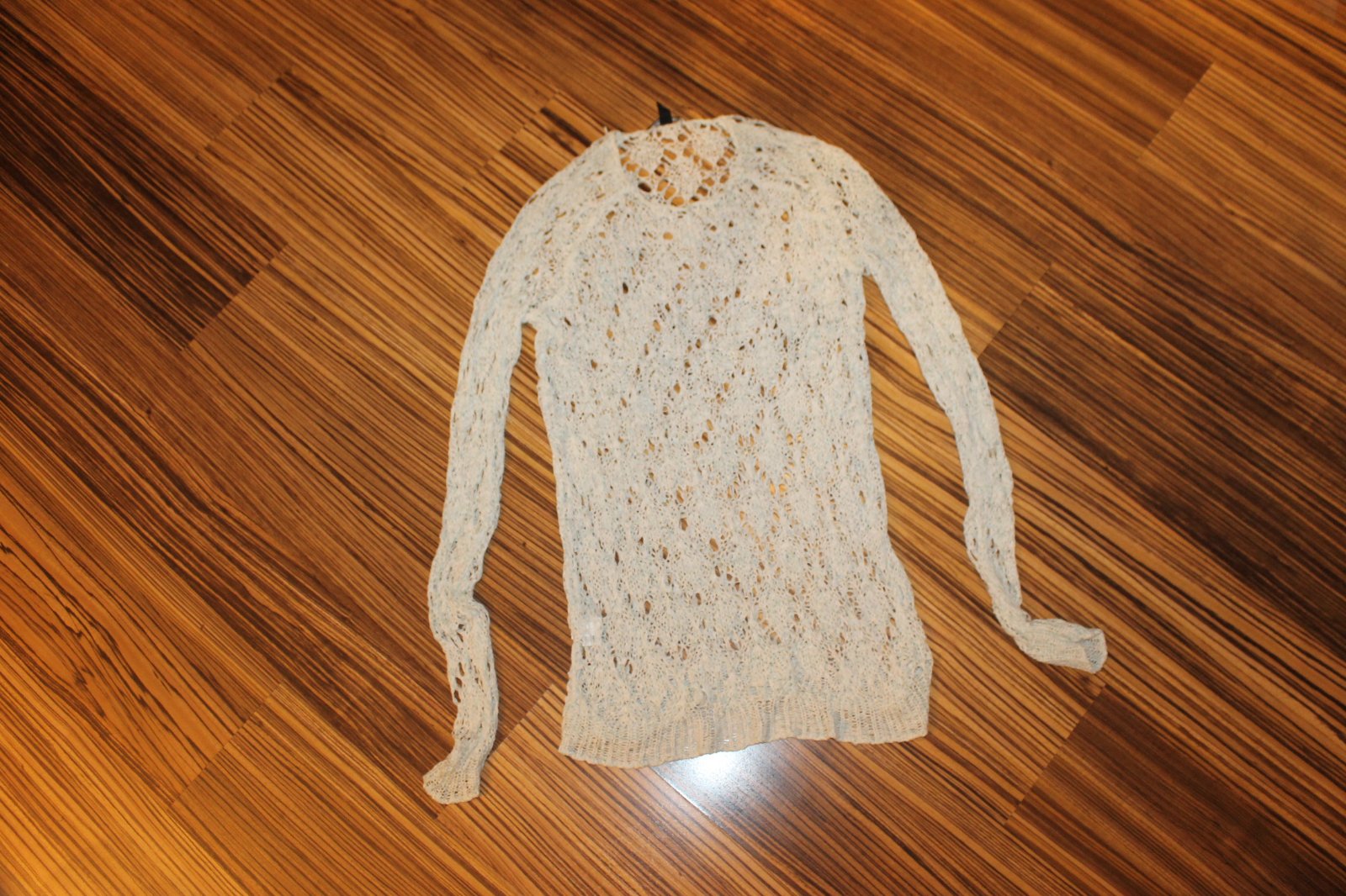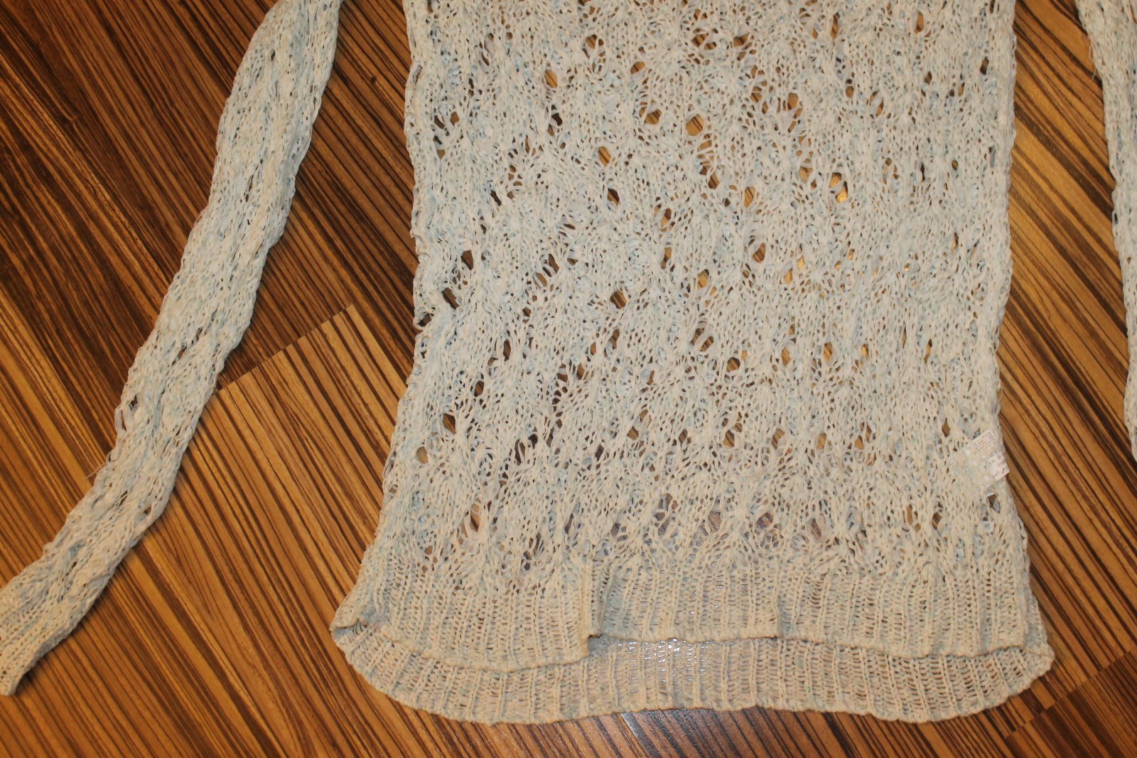 Raz oblečený, ako nový bez poškodení. Bielo modrá farba Jemný, ľahký, padavý materiál 65% acryl, 35 % polyamid. veľ. M, RO: š 2x 48, dl. 69 cm, rukáv od krku 83/57 cm spod pazuchy. Váha 203 g.