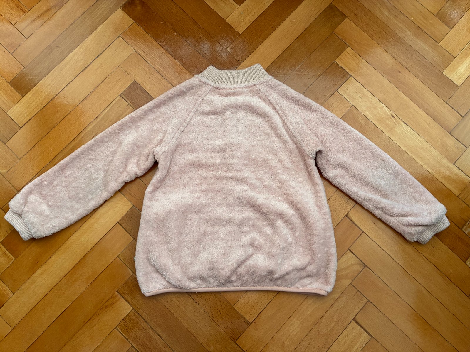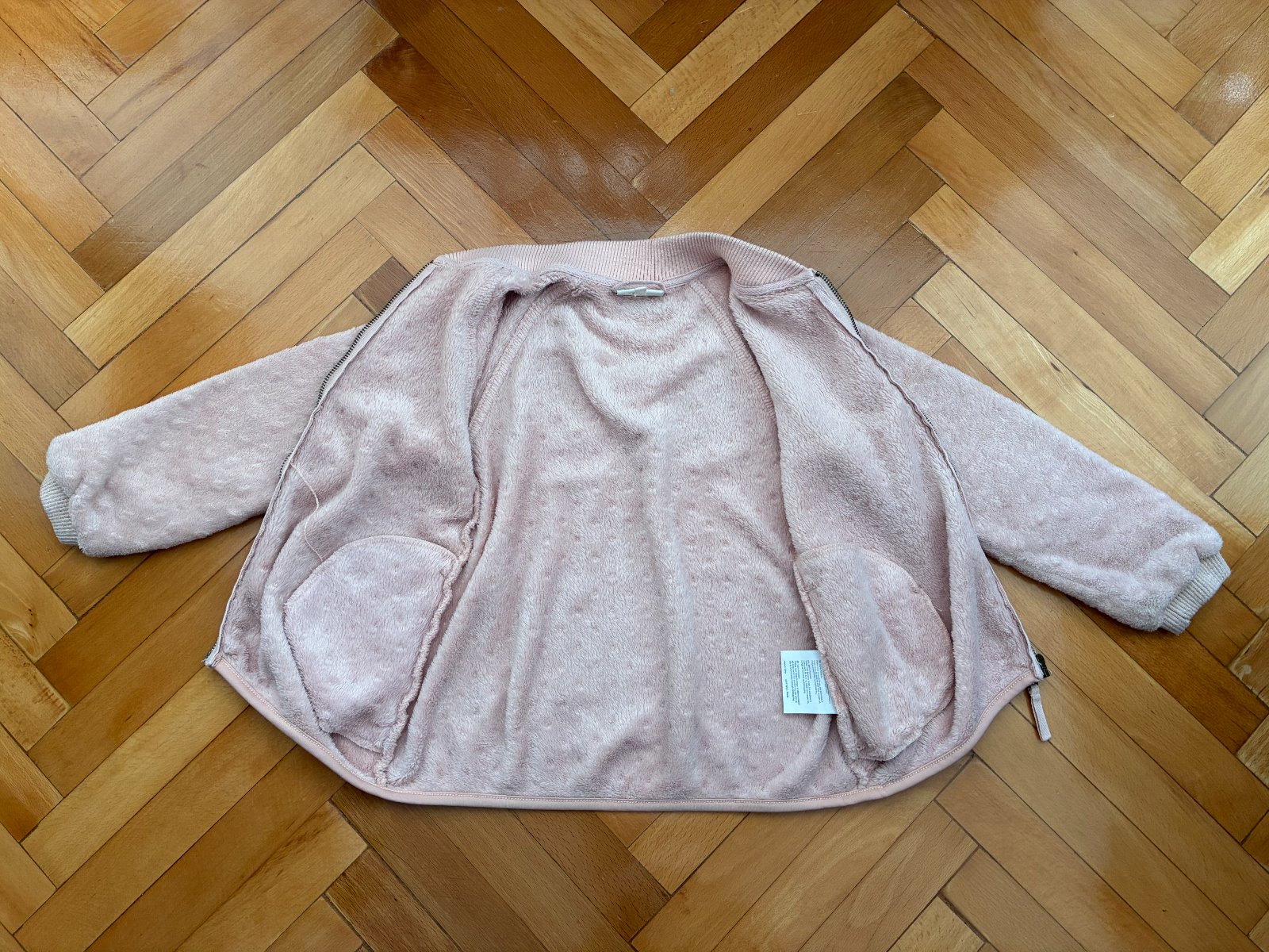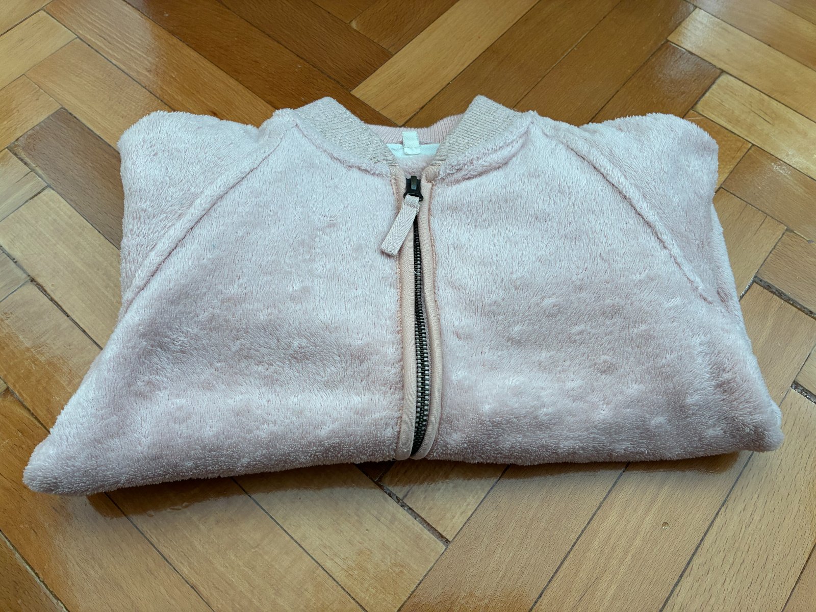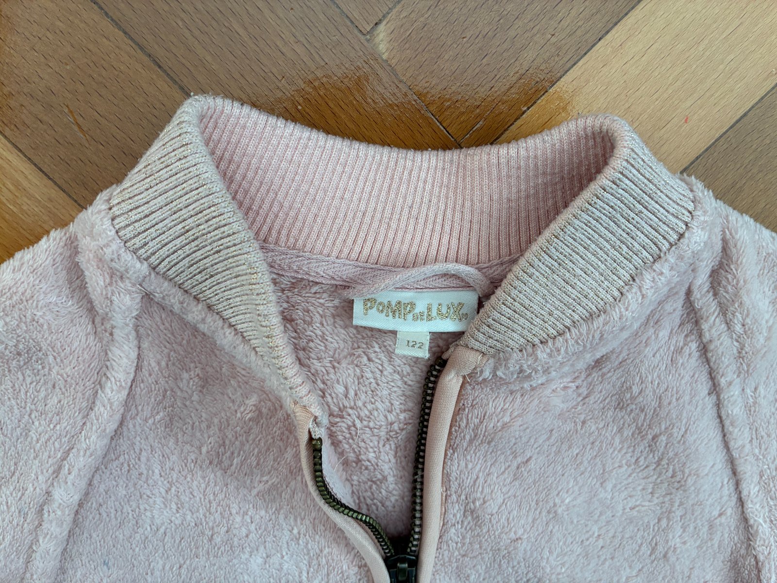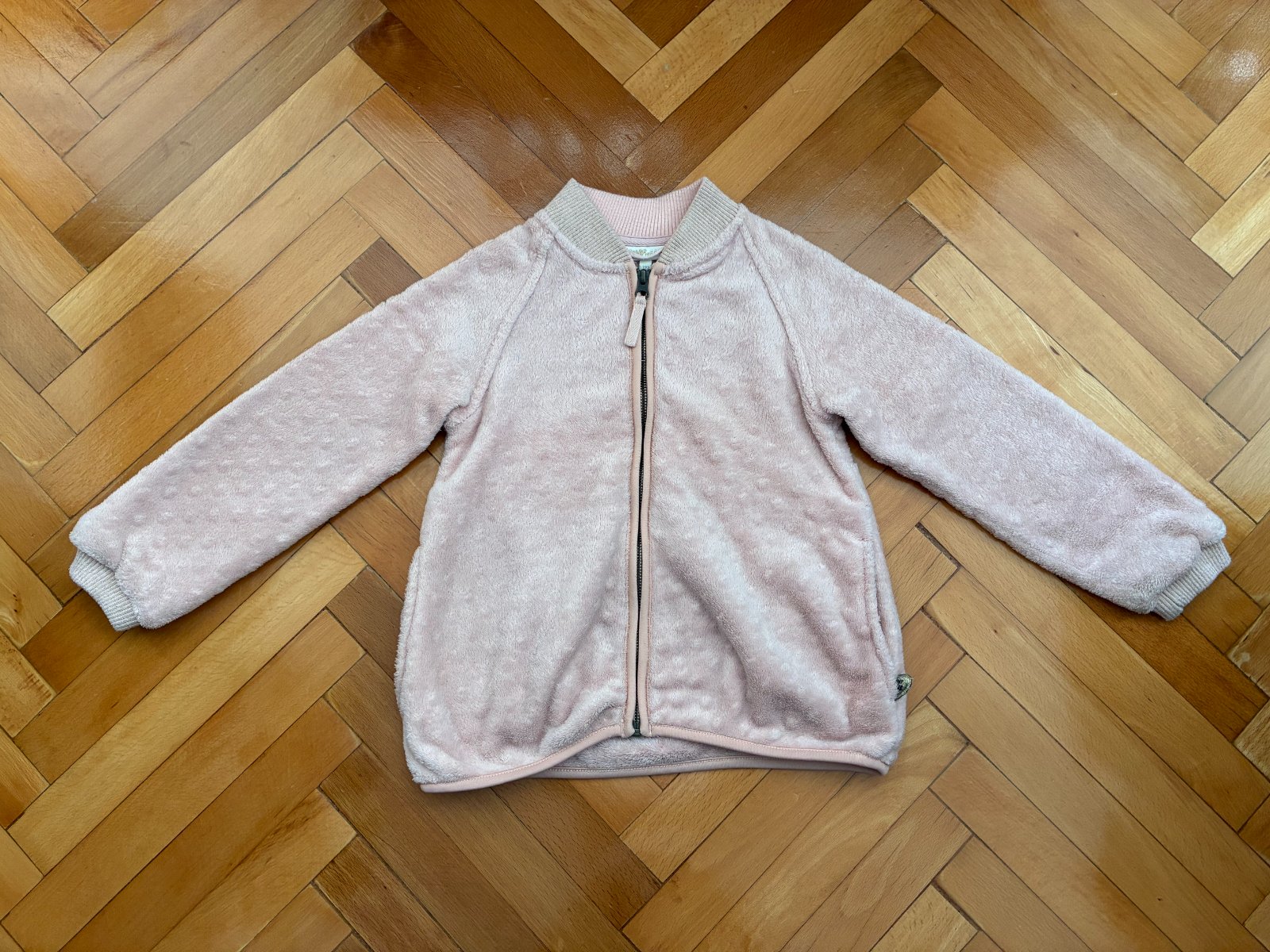 Teplučká elegantná mikina na zips s vreckami vo výbornom nosenom stave, bez poškodení, jemnučké zmolčeky na patentoch, patenty pretkávané zlatou niťou, príjemná na dotyk. Sedí na 122/128. Vhodná k šatám, k sukničke.