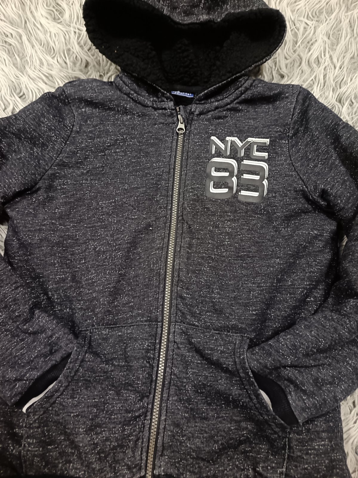 Mikina na zips s kapucňou bez poškodení. Rozmery: dĺžka 56 cm, šírka 46 cm a rukáv od šitia 51 cm.