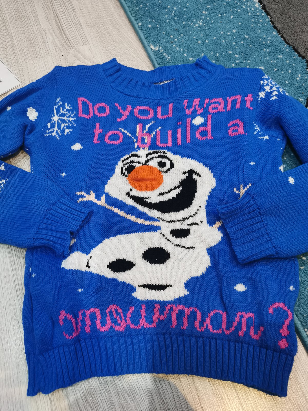 Krásny sveter s Olafom, veľkosť 5-6rokov. Dobrý nosený stav, sem tam žmolky.V