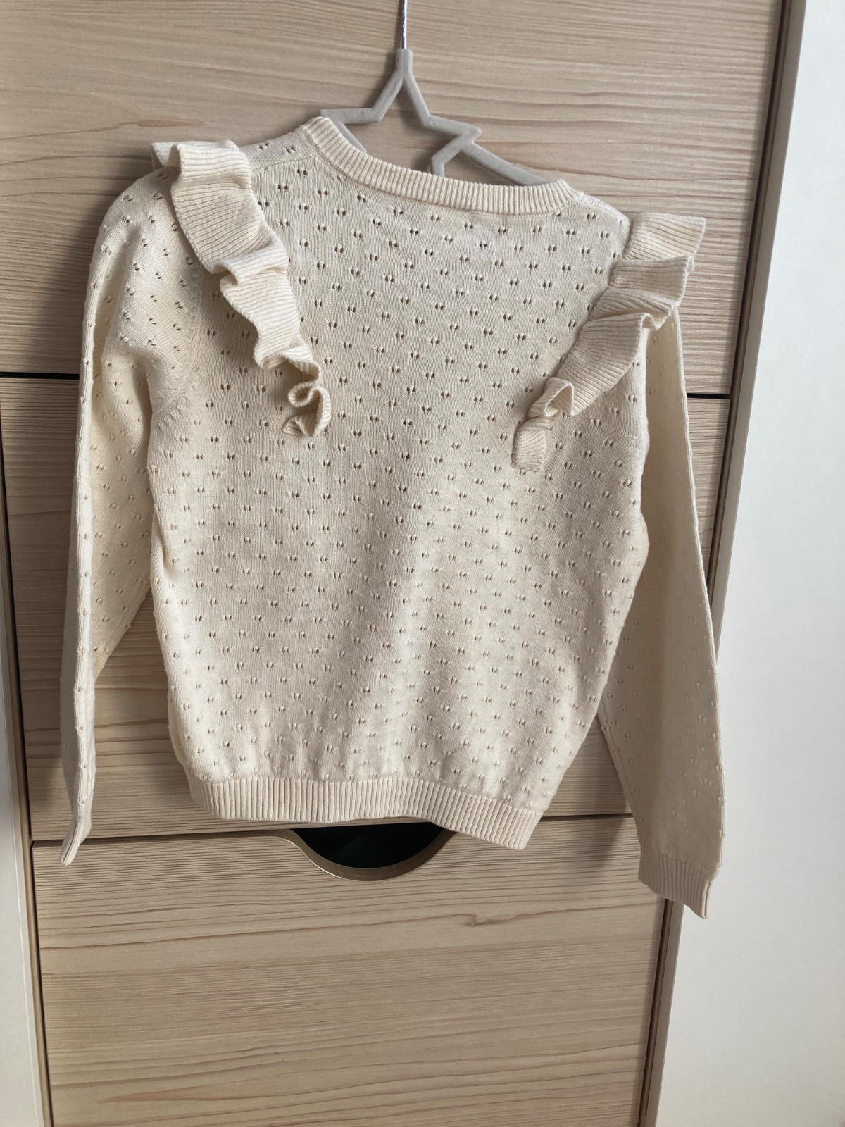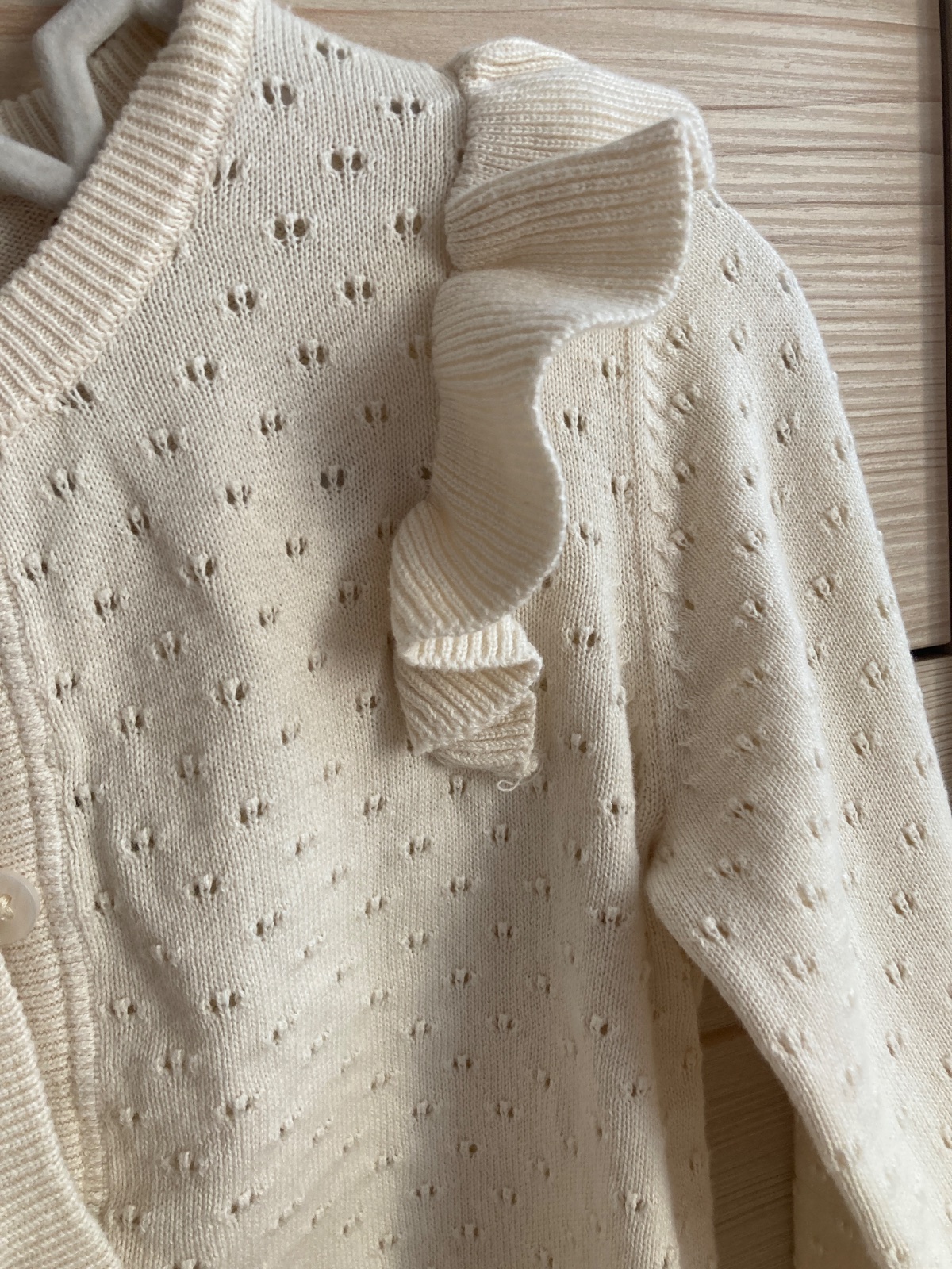Ponukam na predaj krásny kardigan/sveter na gombíky znacky Lindex. Dierkovany vzor, na rukávoch volany. Nosený výnimočne do kostola atd. Ako novy. Visacka udava velkost 110/116, na ktorú aj sedi. Kupovany novy, noseny veľmi malo 1 dieťaťom.